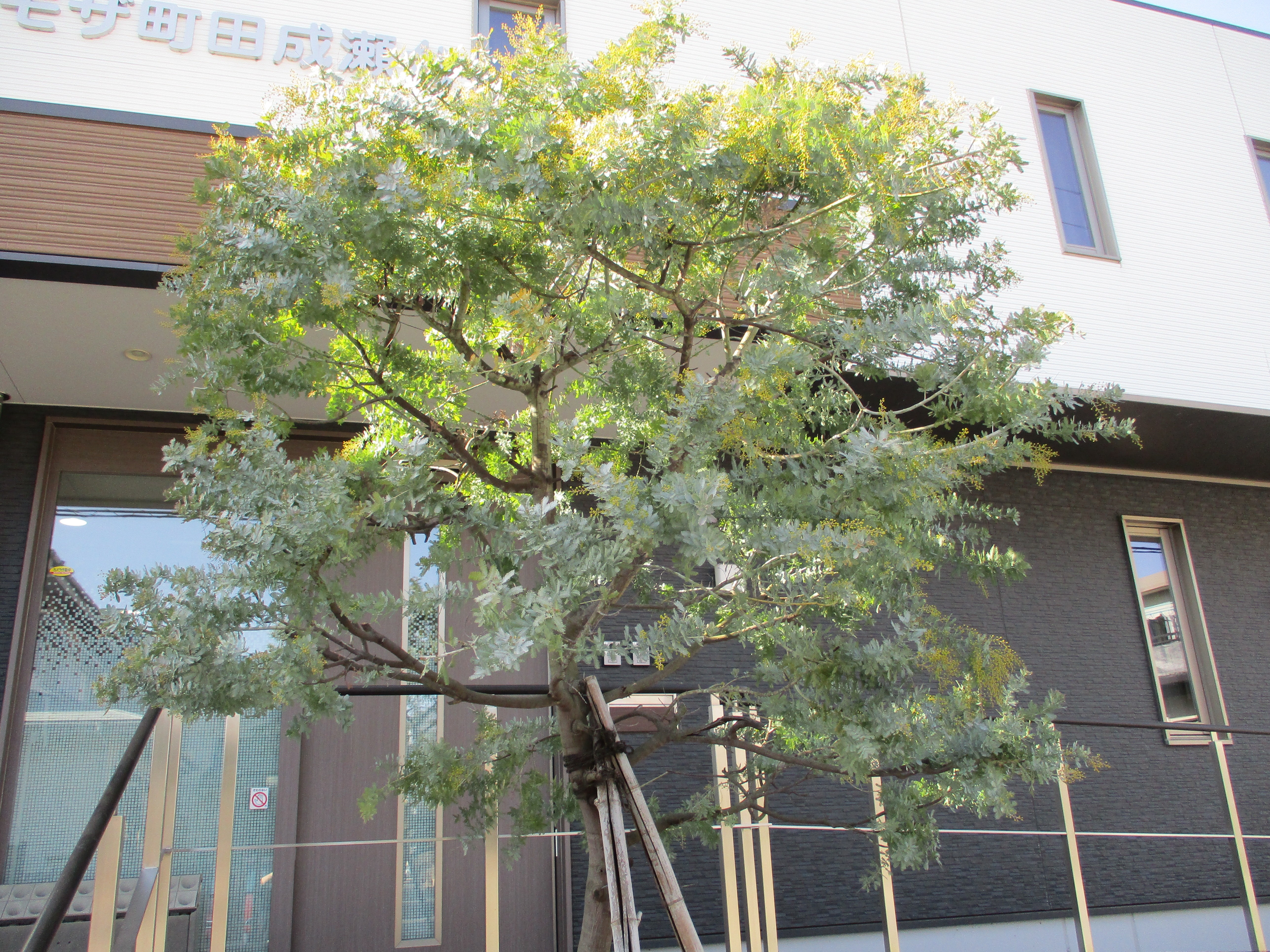 ちょこっと休憩できるベンチが設置されました。 背凭れに飾られているのは近所の方の作品です。 寒い中ミモザの葉は青々しております。小さいですが蕾もでき始めました。