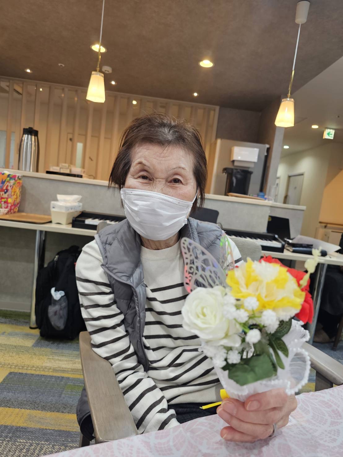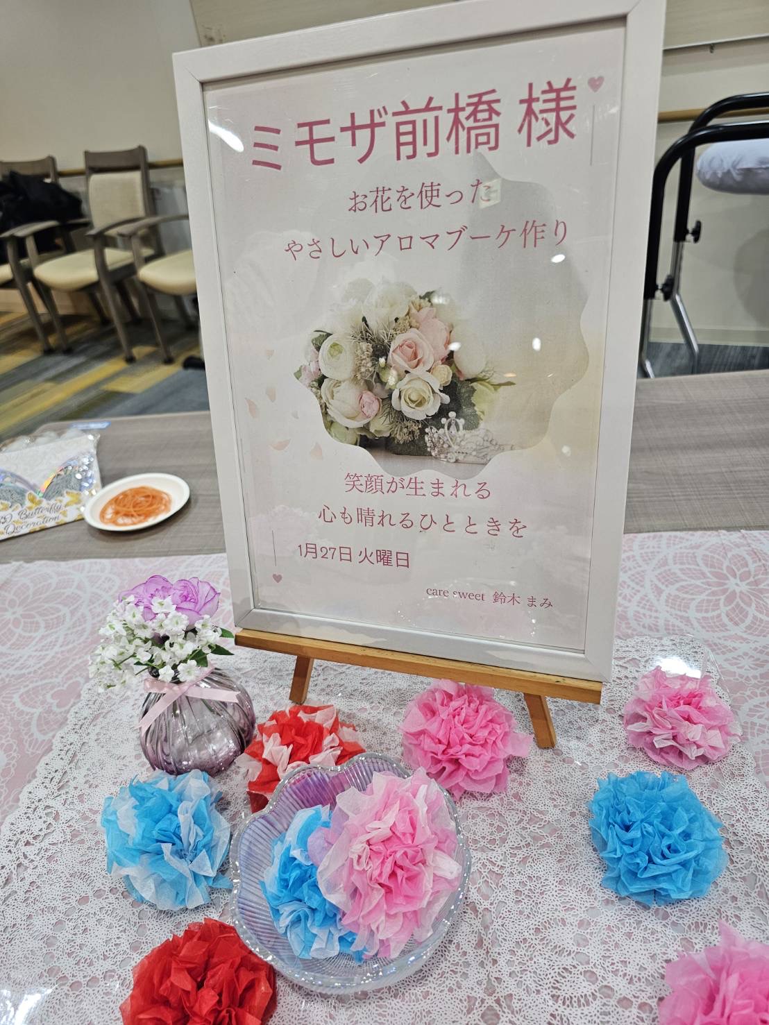 本日はアロマブーケ作りをしました。 ヒノキ、柚子、ラベンダーの3種類から香りを選んでいただき、香りづけ。良い香りに包まれました♪
