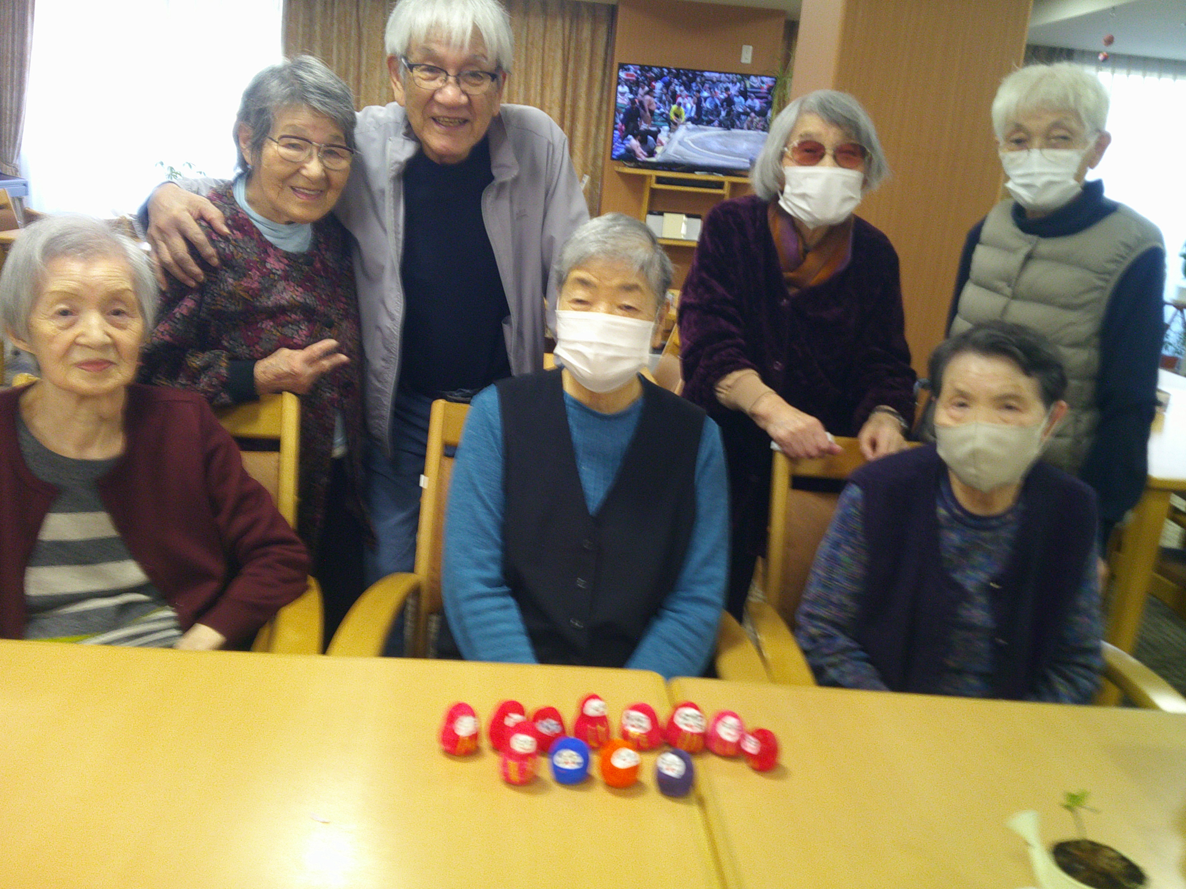 今月の工作はだるま作りを行いました! 赤、オレンジ、青とカラフルなかわいいだるまがたくさんできました(^^♪