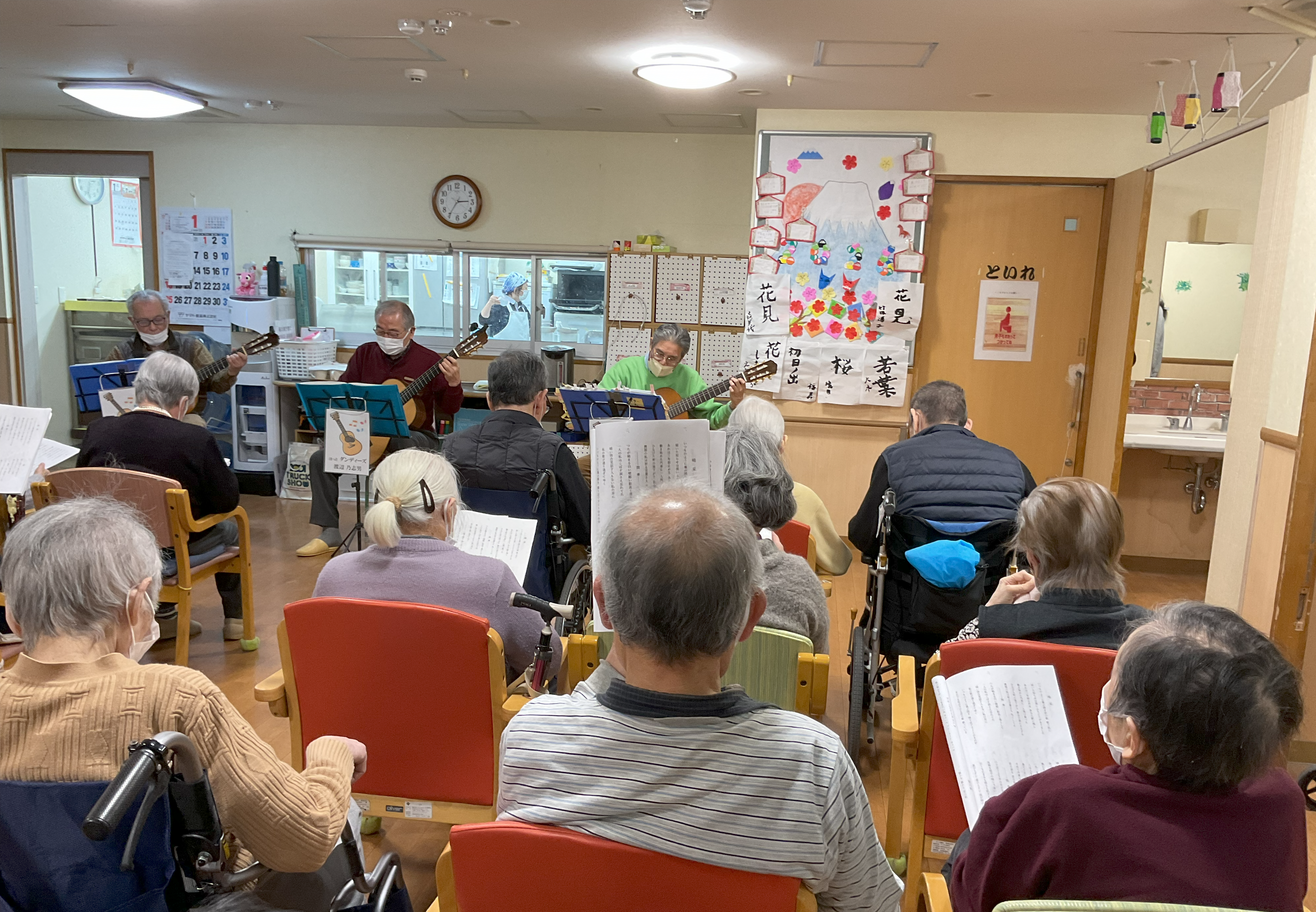 今月もホットでダンディーな3名のボランティアさんによるギター演奏を鑑賞しました。心に響くギターに合わせてみんなで歌い、楽しい時間を過ごしました♬💕
