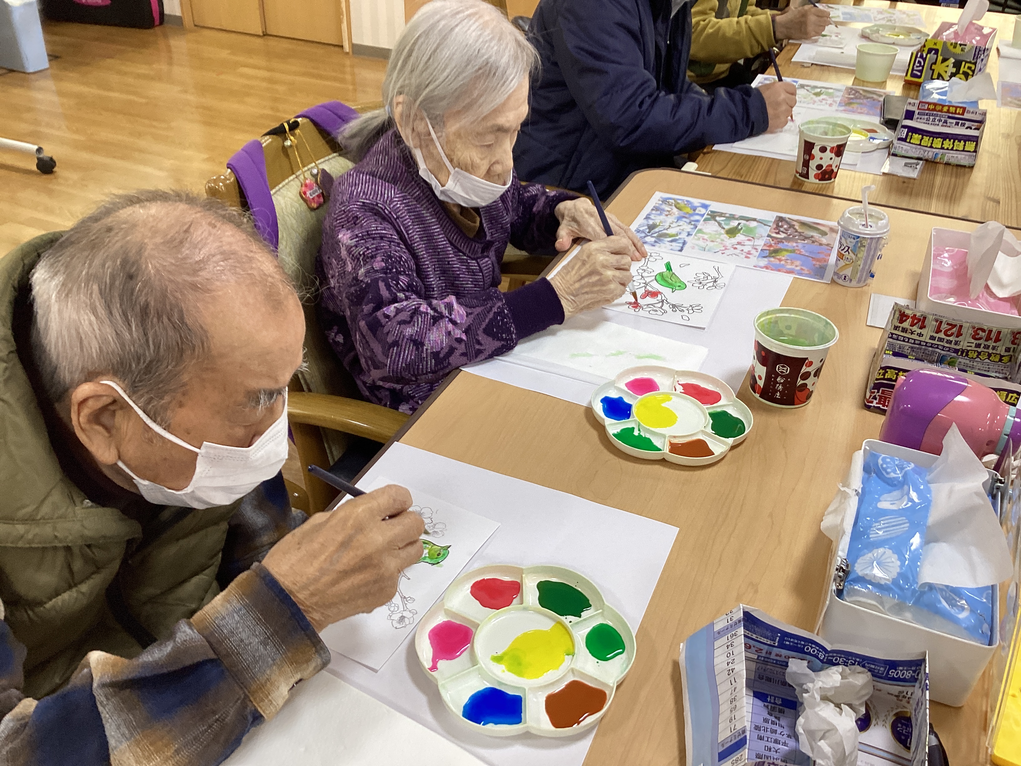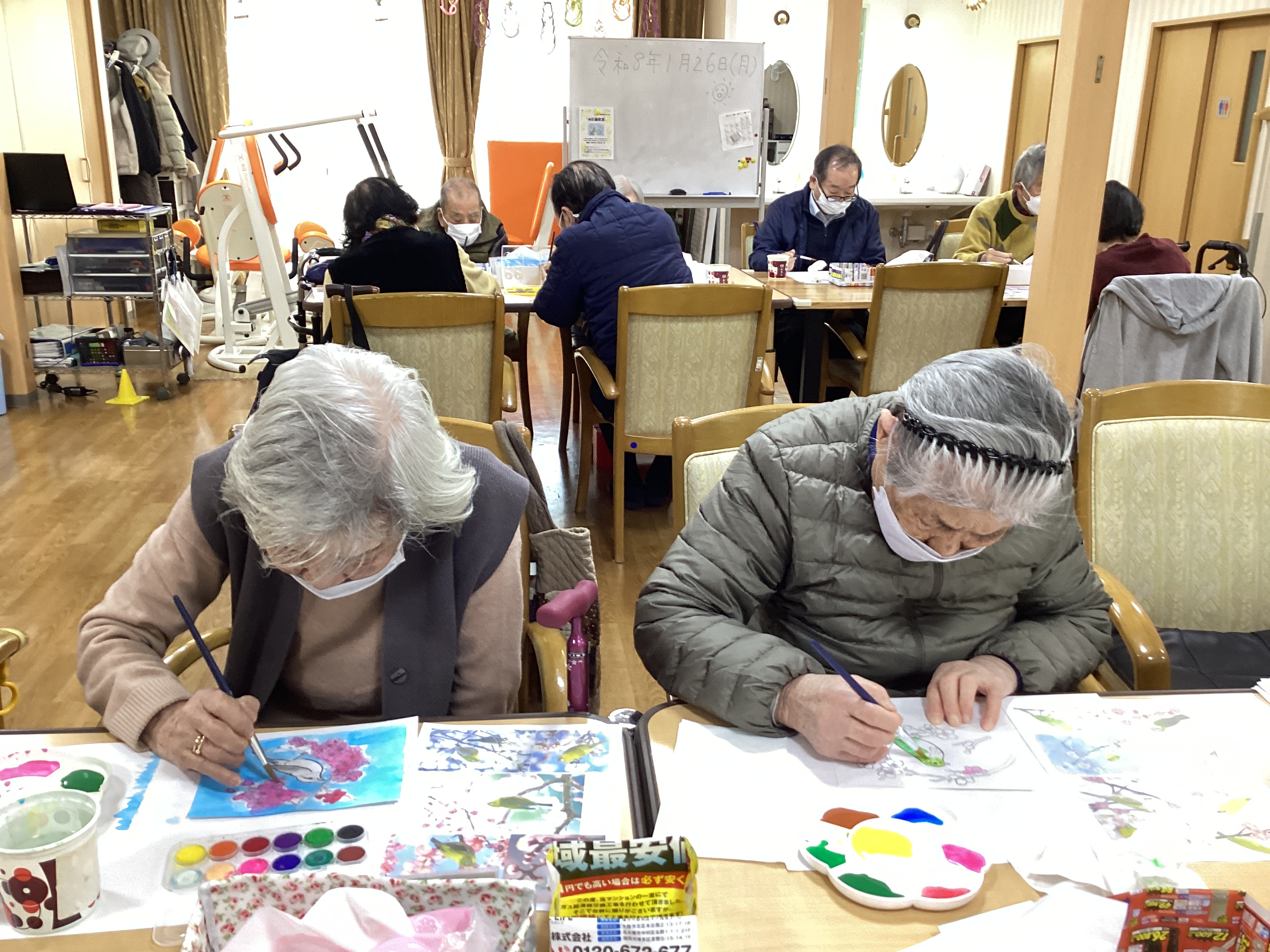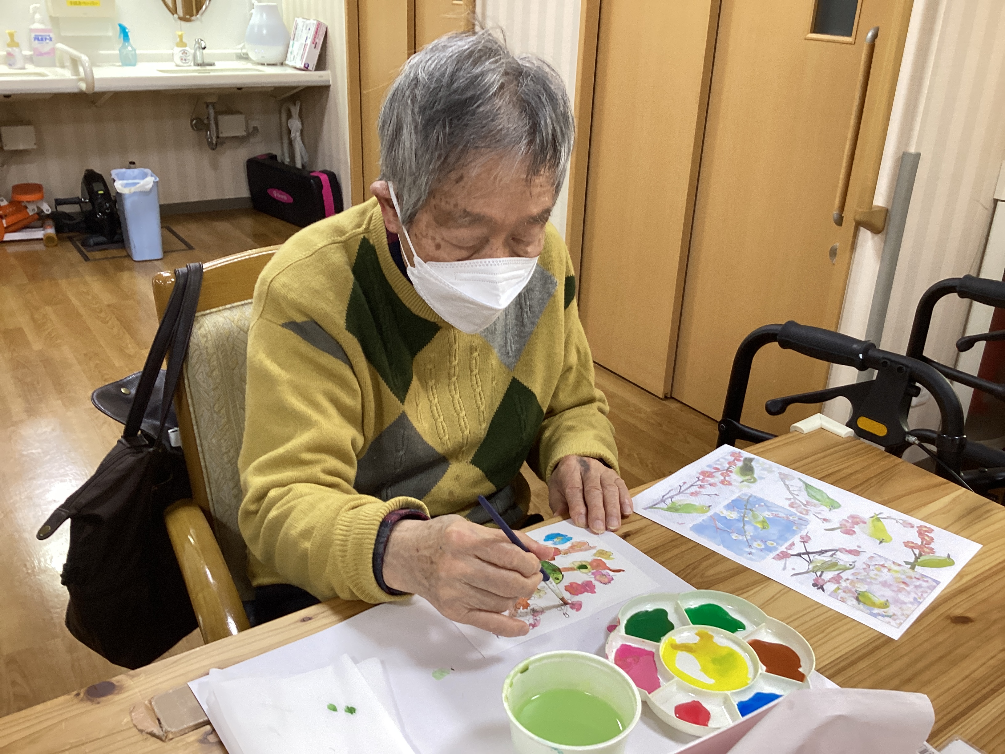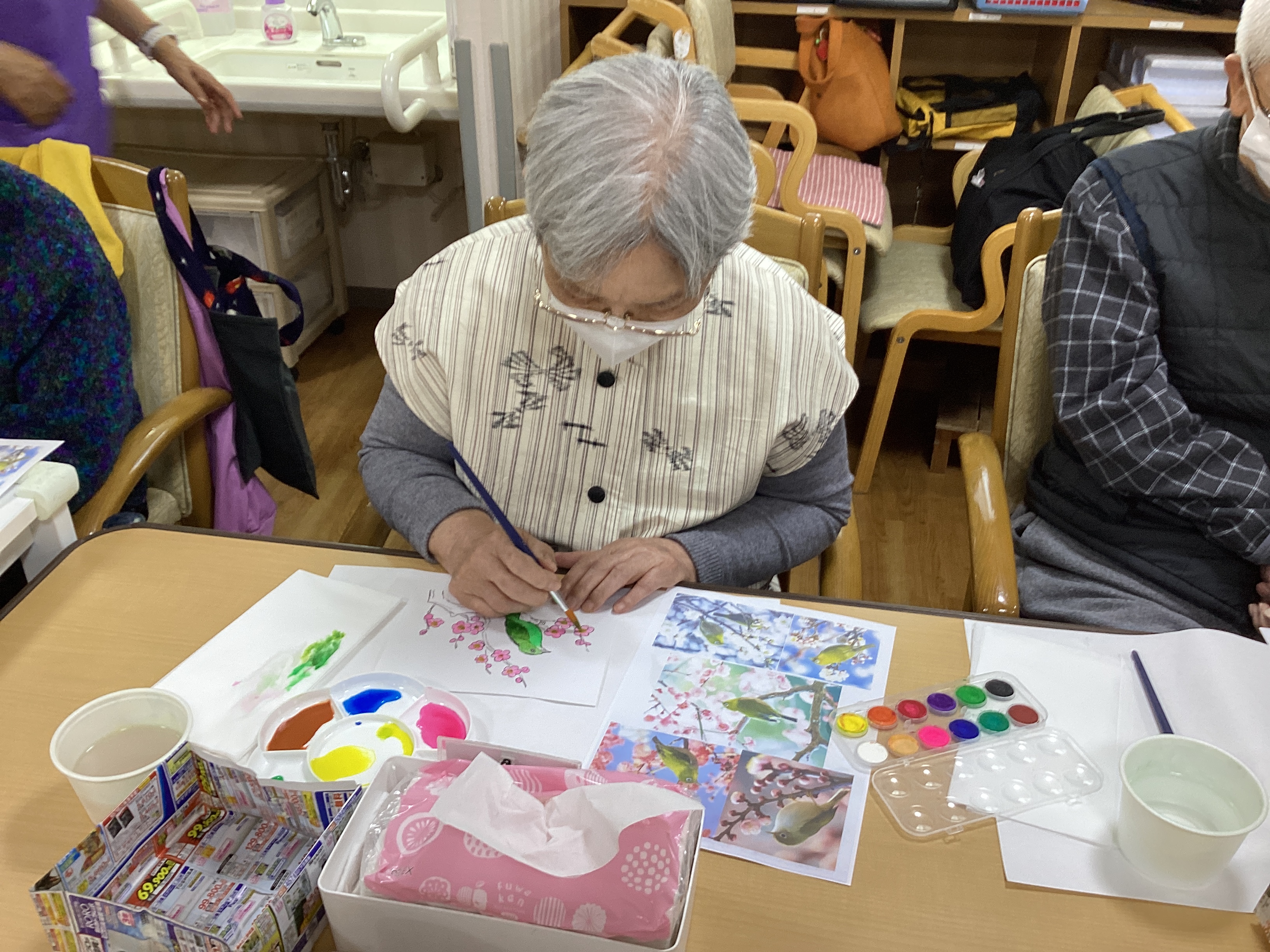 水彩画教室を実施し、梅と小鳥の絵を描きました。一足早く春の訪れを感じられるひと時になりました。