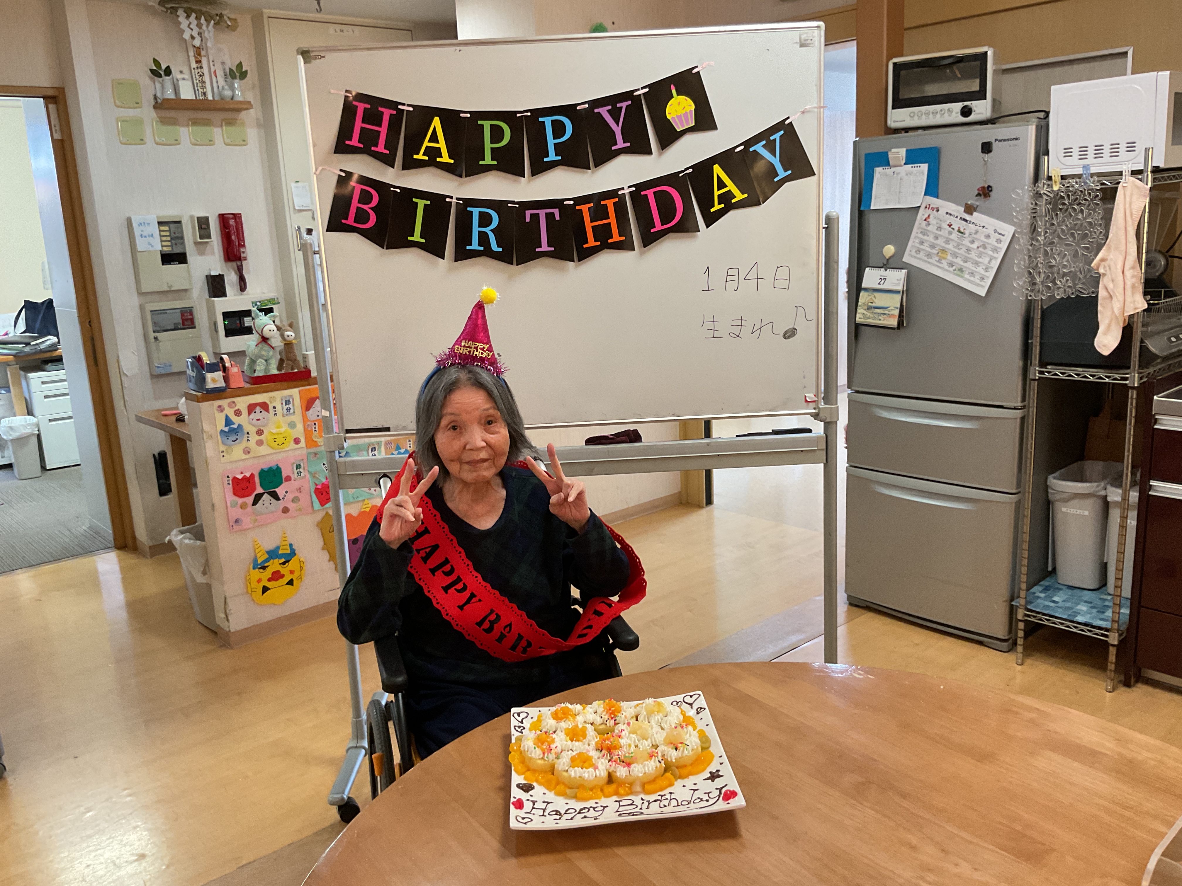先日1月生まれの方のお誕生日会を行いました🎂今月は5名の方をお祝いしました!ケーキはキッチンさんの手作りでとても豪華に作っていただきました!皆様とても良い表情ですね😊お体に気をつけてこれからも元気に過ごしてください!