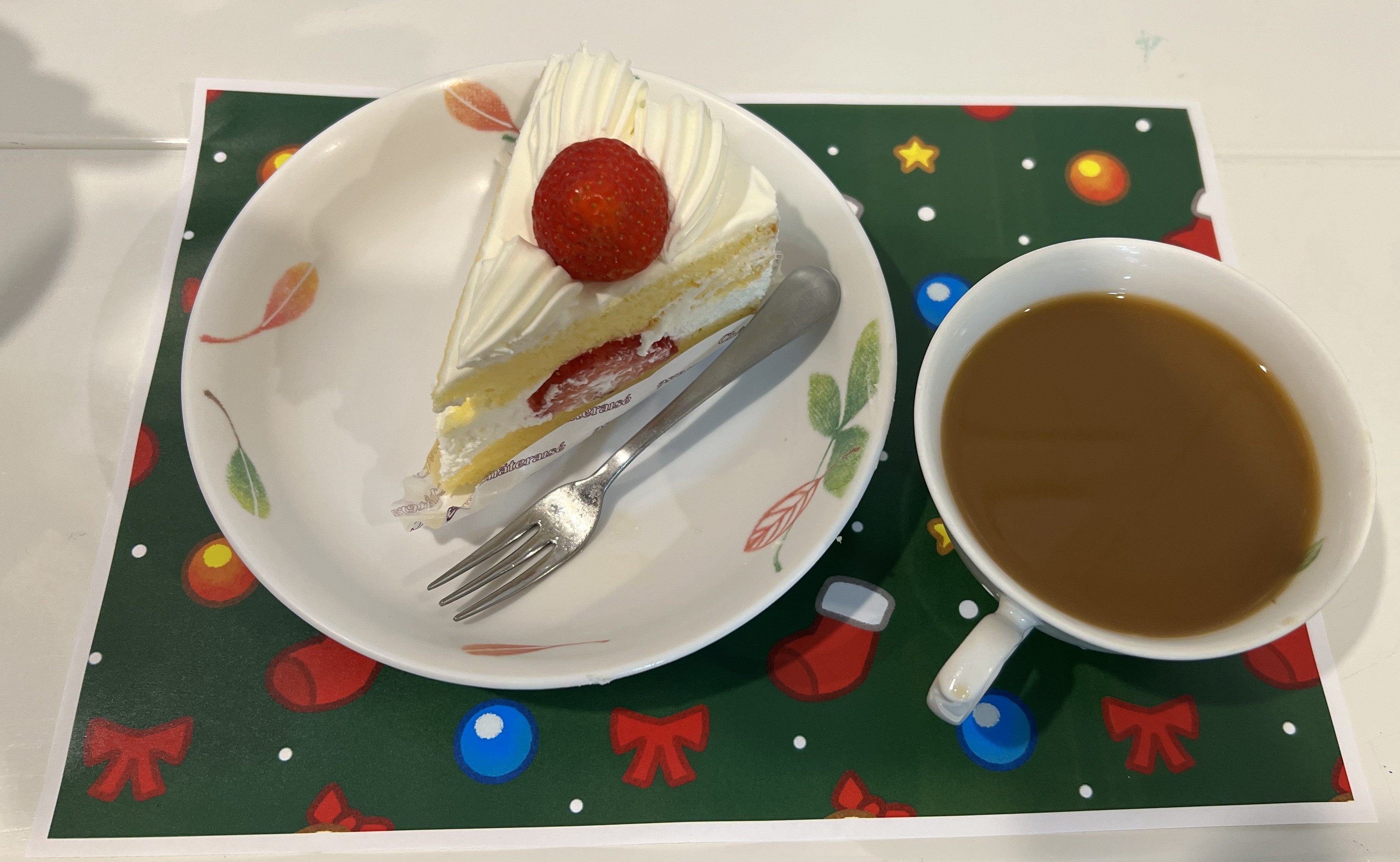 クリスマス会のおやつ♪紅茶かコーヒーを選んでもらいケーキと一緒にいただきました。 イチゴのショートケーキとても美味しかったです♬