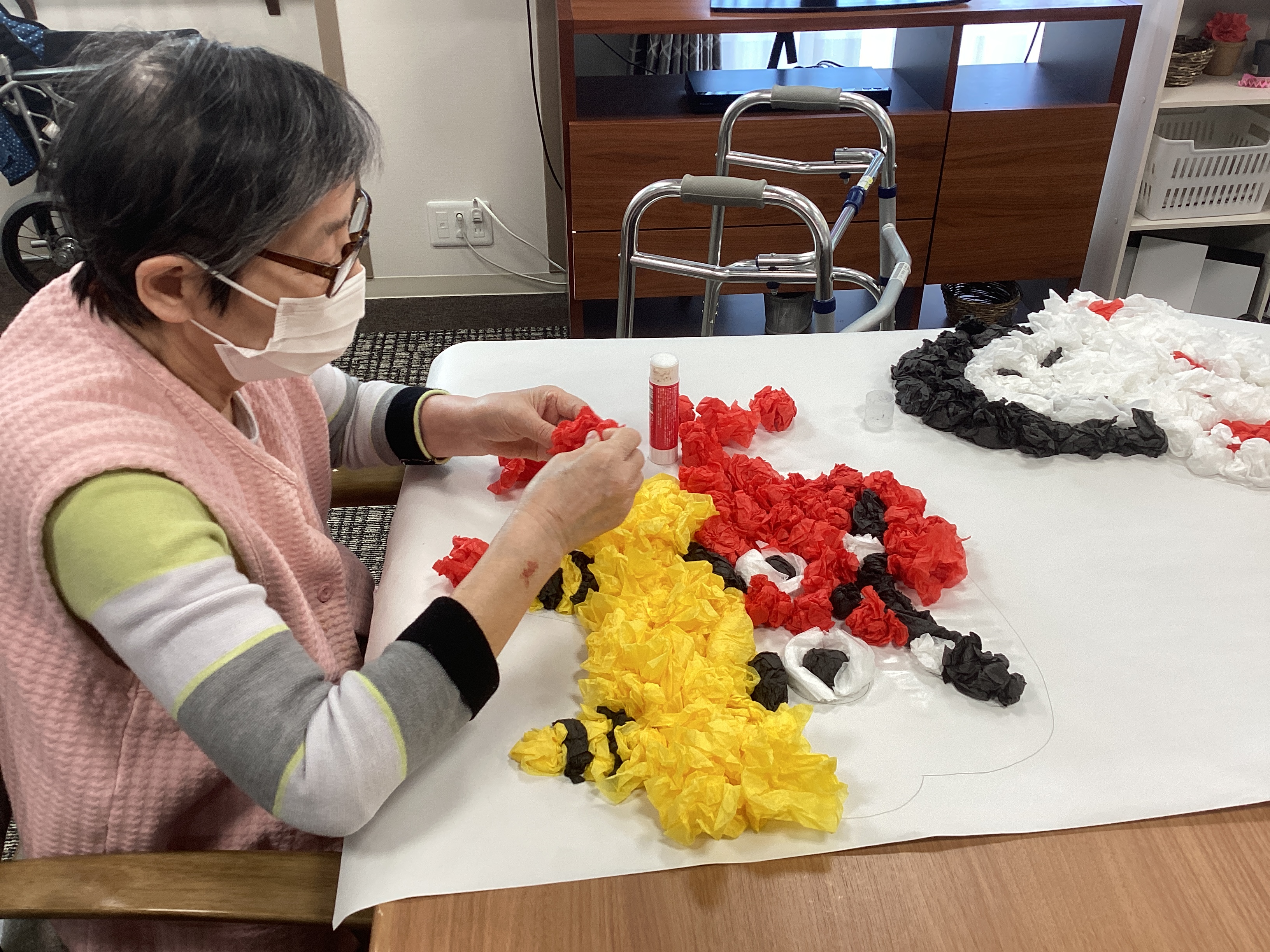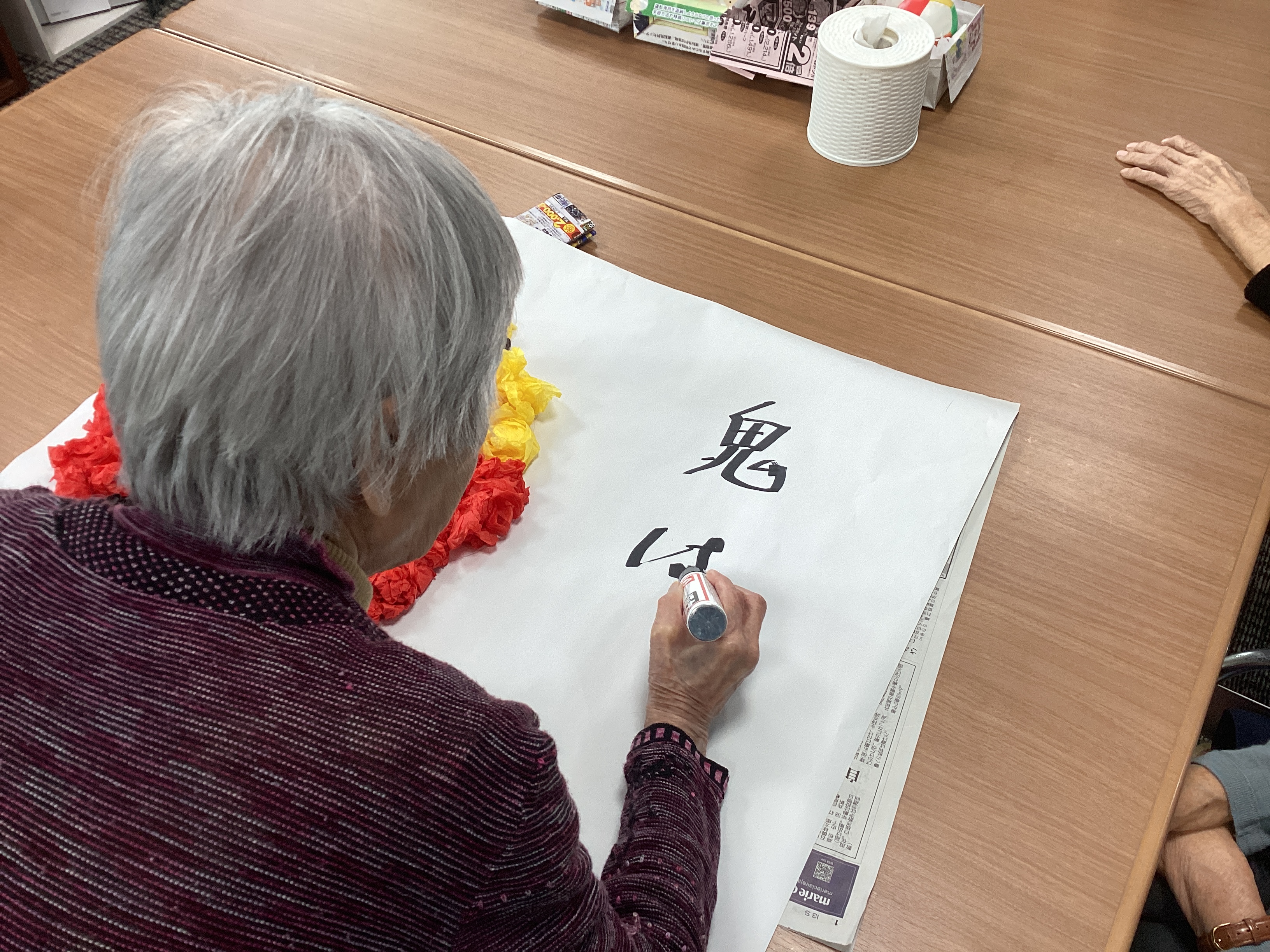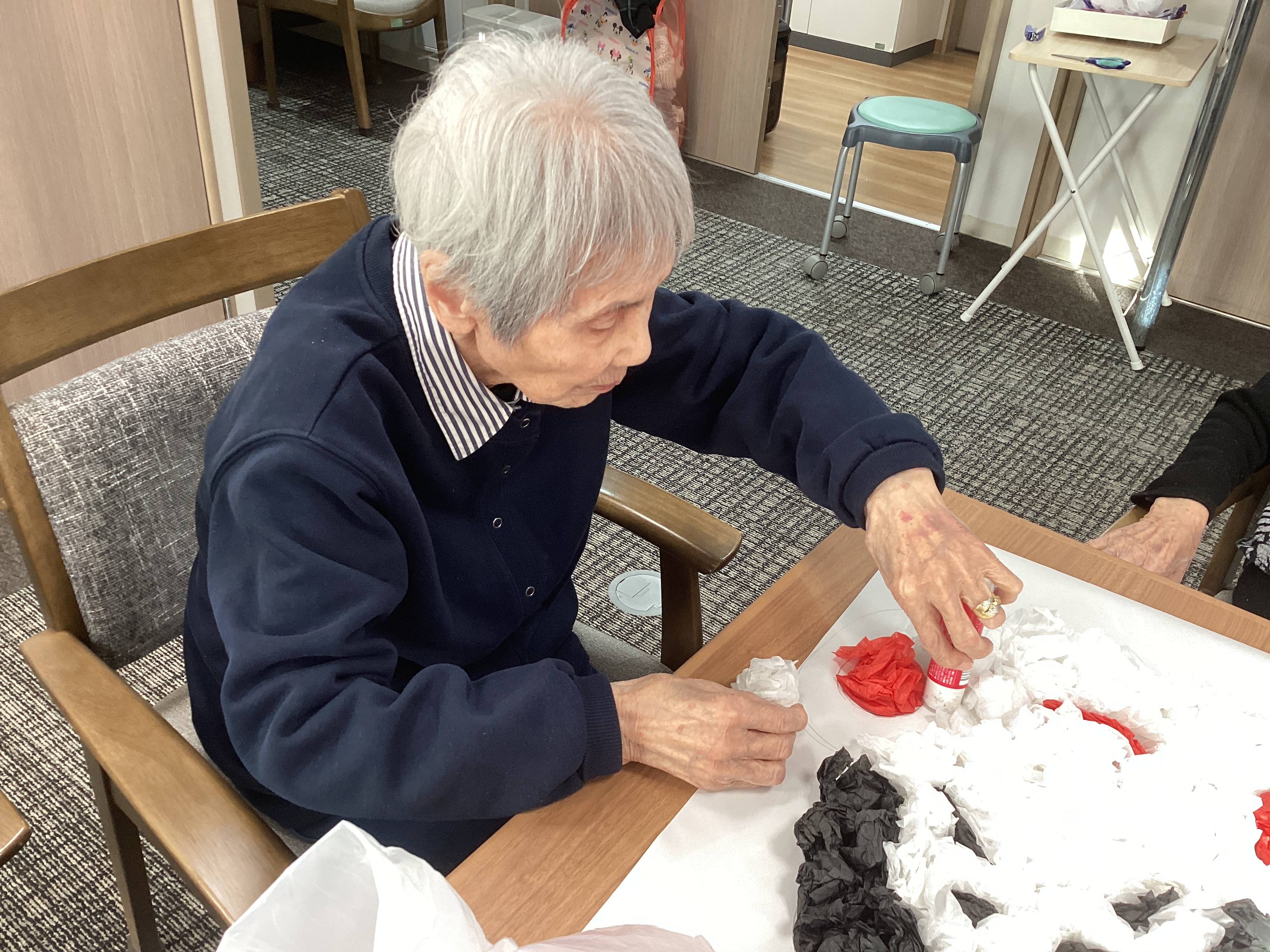 2月の壁画は赤鬼とおかめ!お花紙をくしゃくしゃにしたもので形作ってみました!「鬼は外、福は内」の文字はご利用者様に書いて頂きました!綺麗!!!