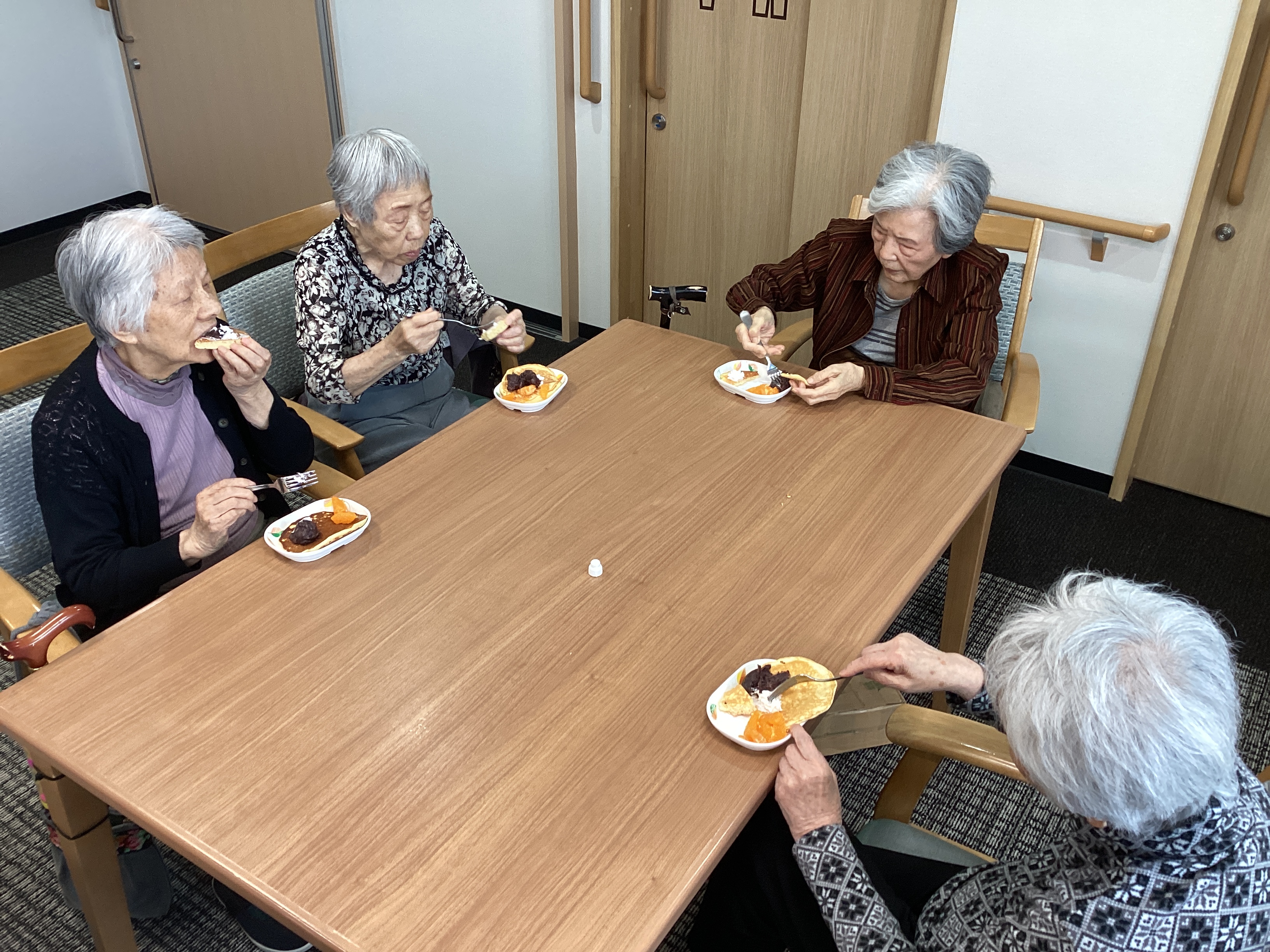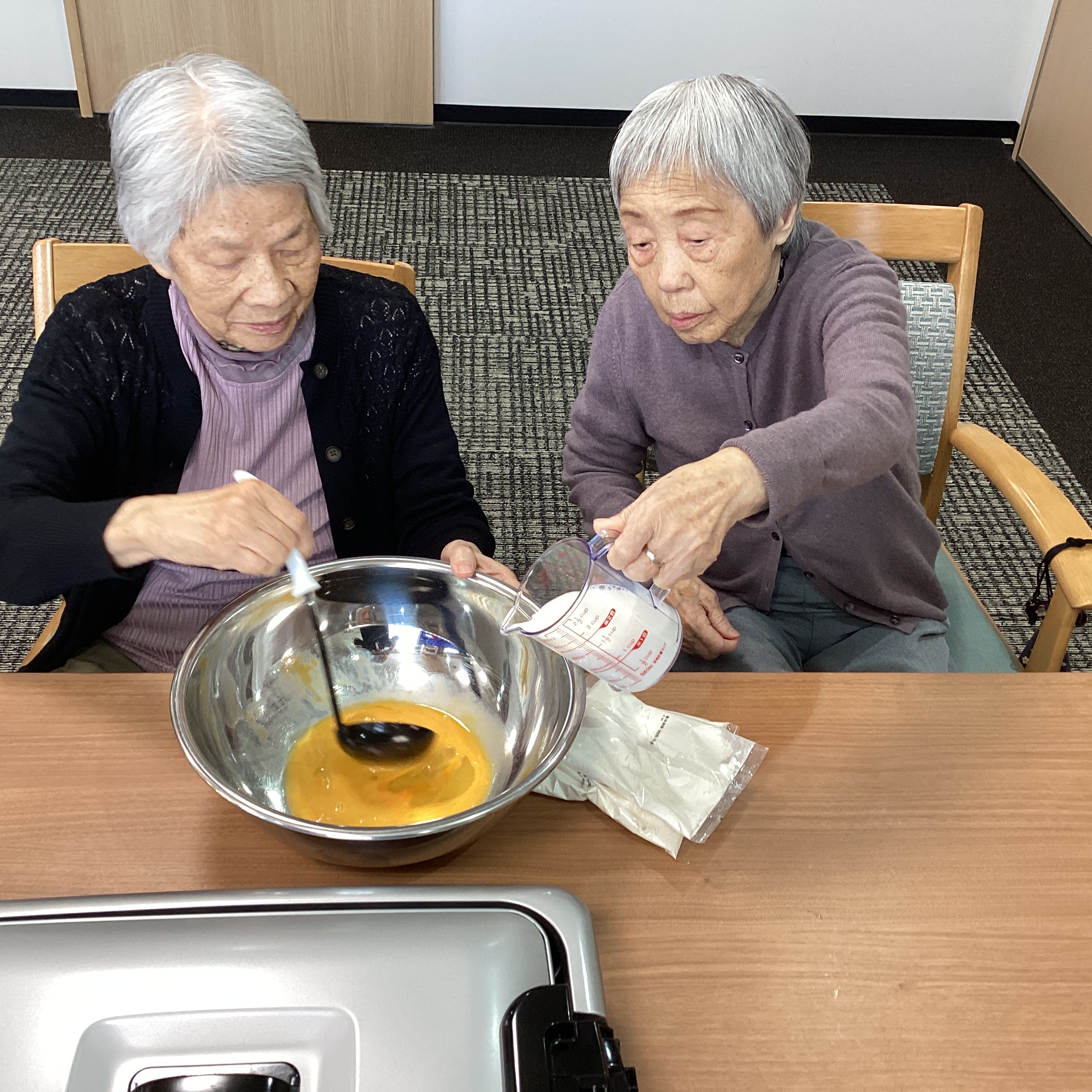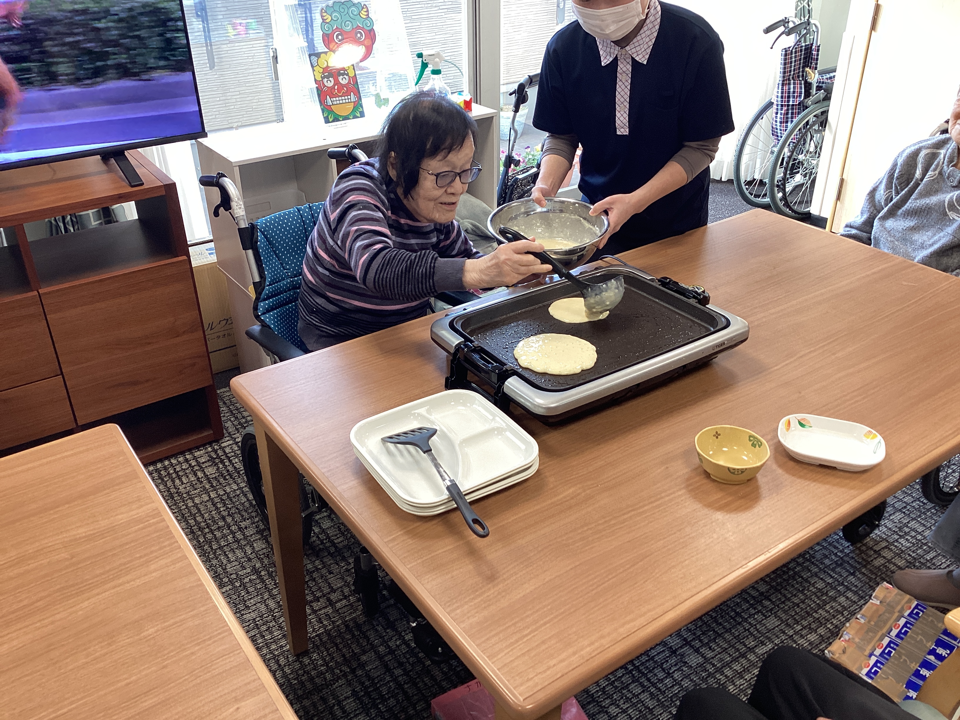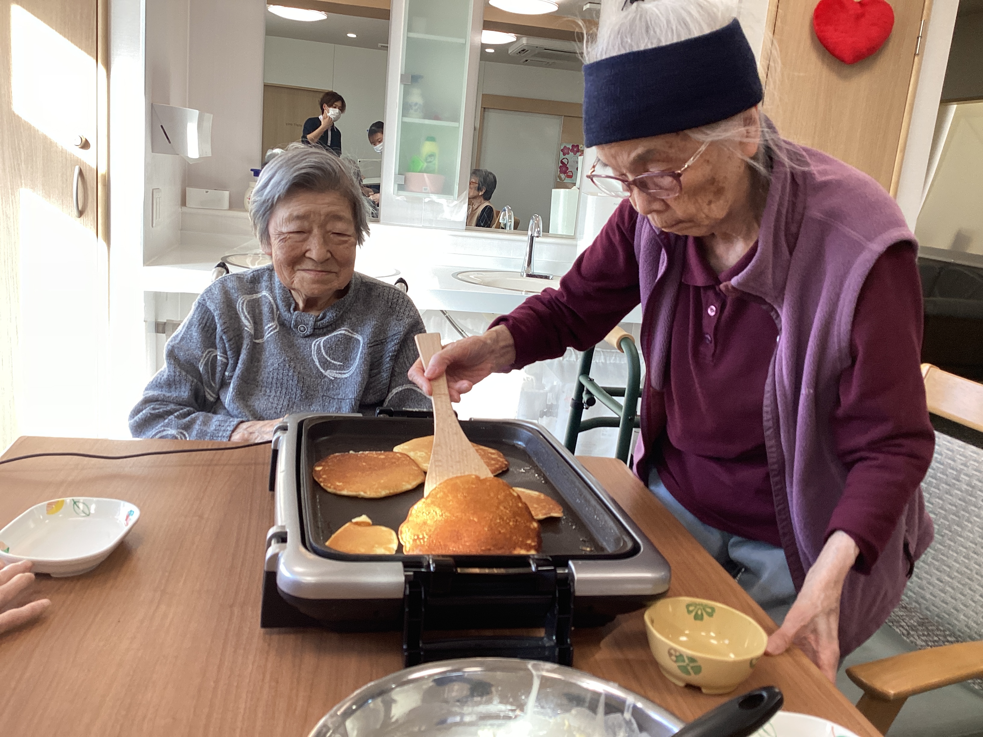 皆様でホットケーキを焼きました。 生地を混ぜるところから皆様にやっていただきました。 トッピングも盛沢山! 手作りはより一層美味しく感じます😊