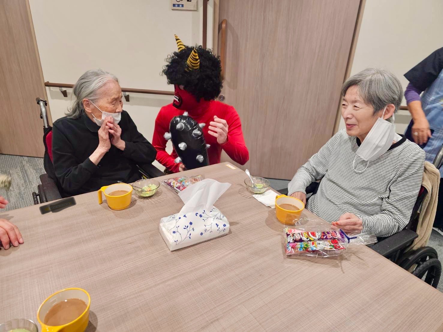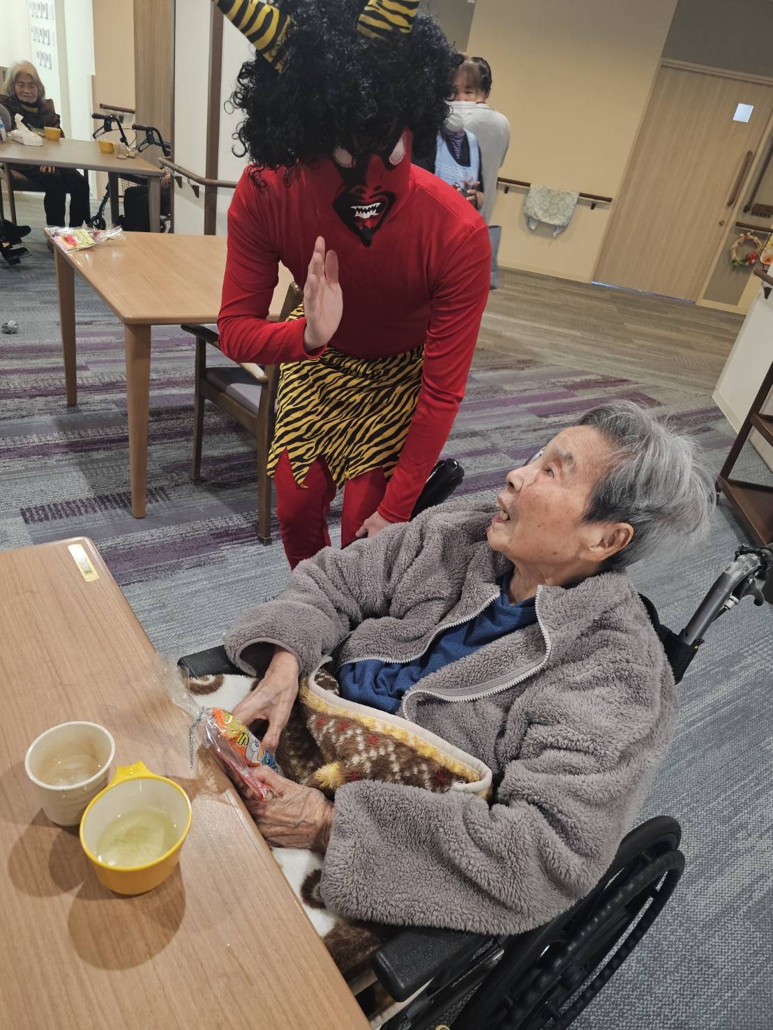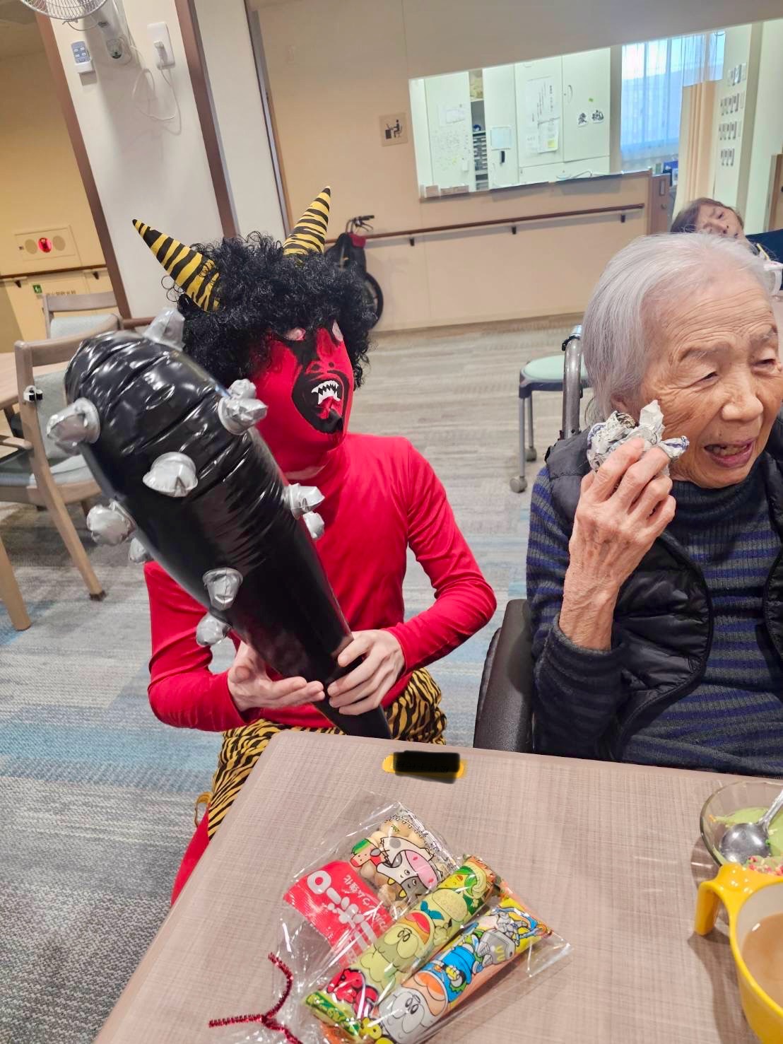 節分の本日、ミモザ前橋に鬼が来ました。 可愛いお面をつけた鬼と、こわいこわい赤鬼!!鬼の突然の出現に利用者様はビックリしていましたが、「鬼は外、福は内」とみなさんと共に鬼退治。笑顔あふれる楽しい午後のひと時でした♪