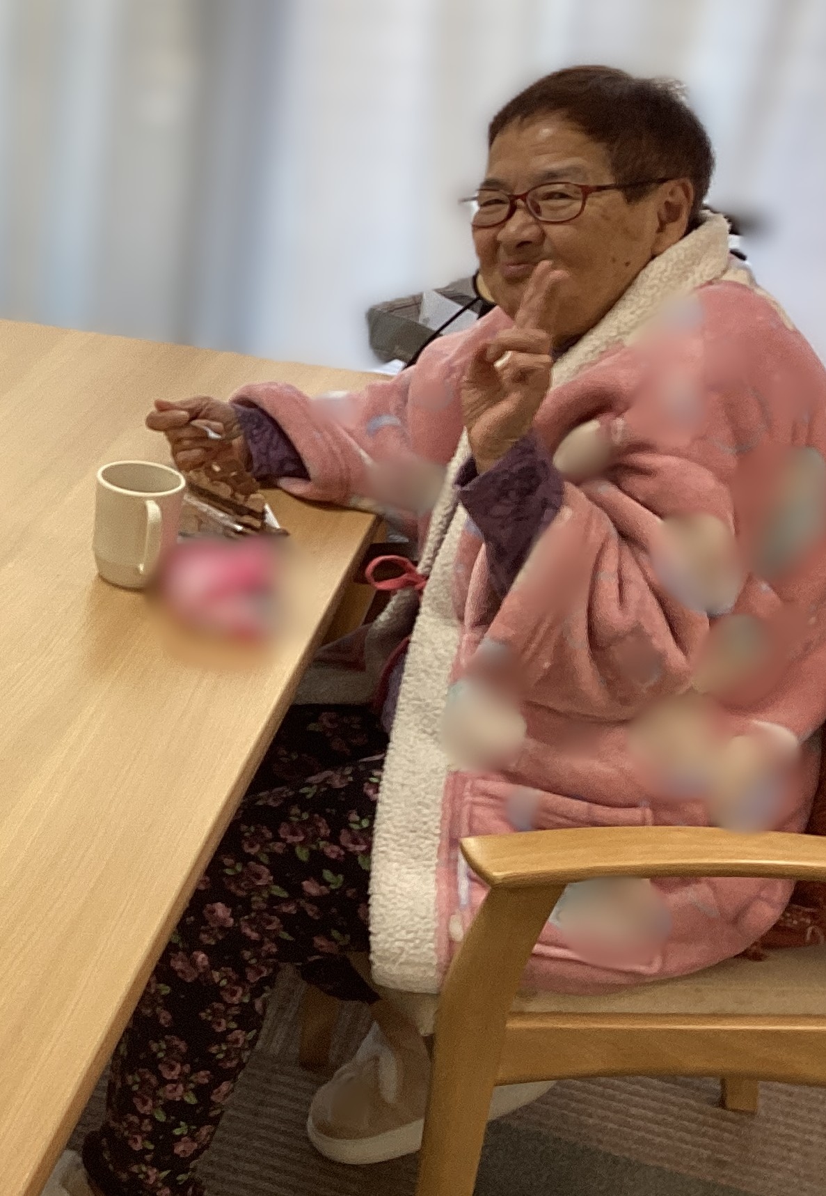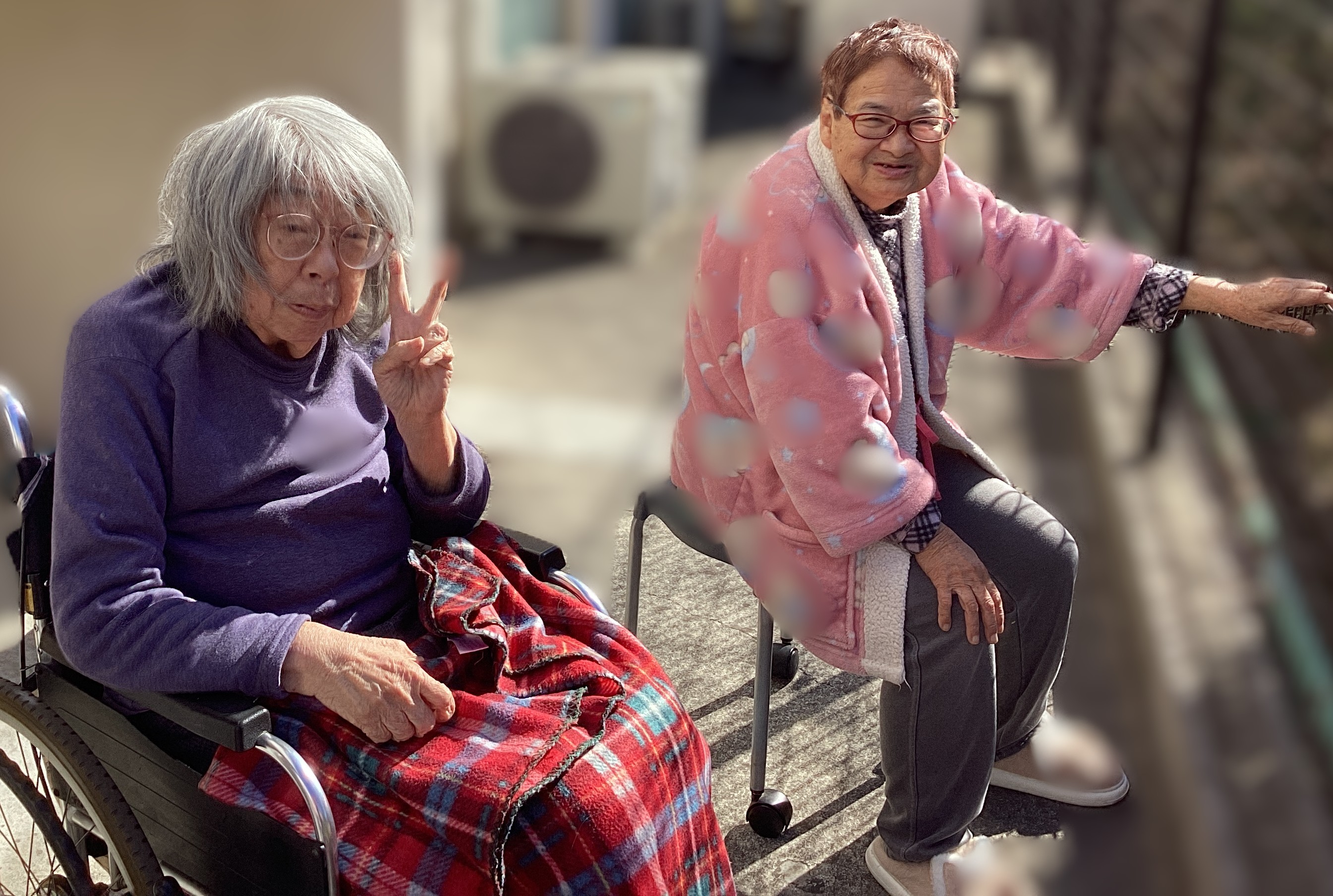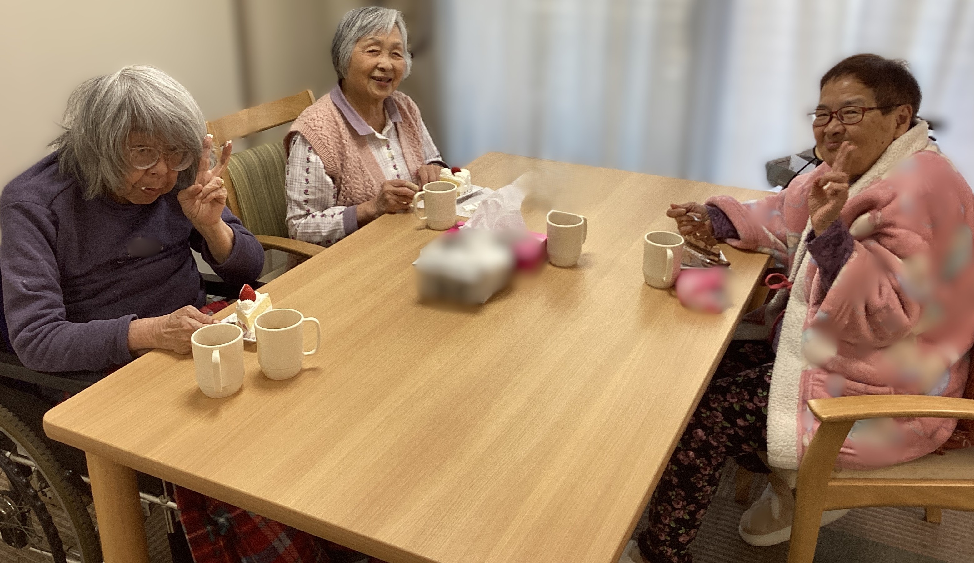 🎂2月お誕生日会🎂主役はこちらの方です🎉お誕生日ケーキを召し上がり冬の柔らかい陽ざしの中で仲良しご利用者も✌サイン✌ご本人も笑顔😊で日光浴🌞お誕生日おめでとうございます🎉