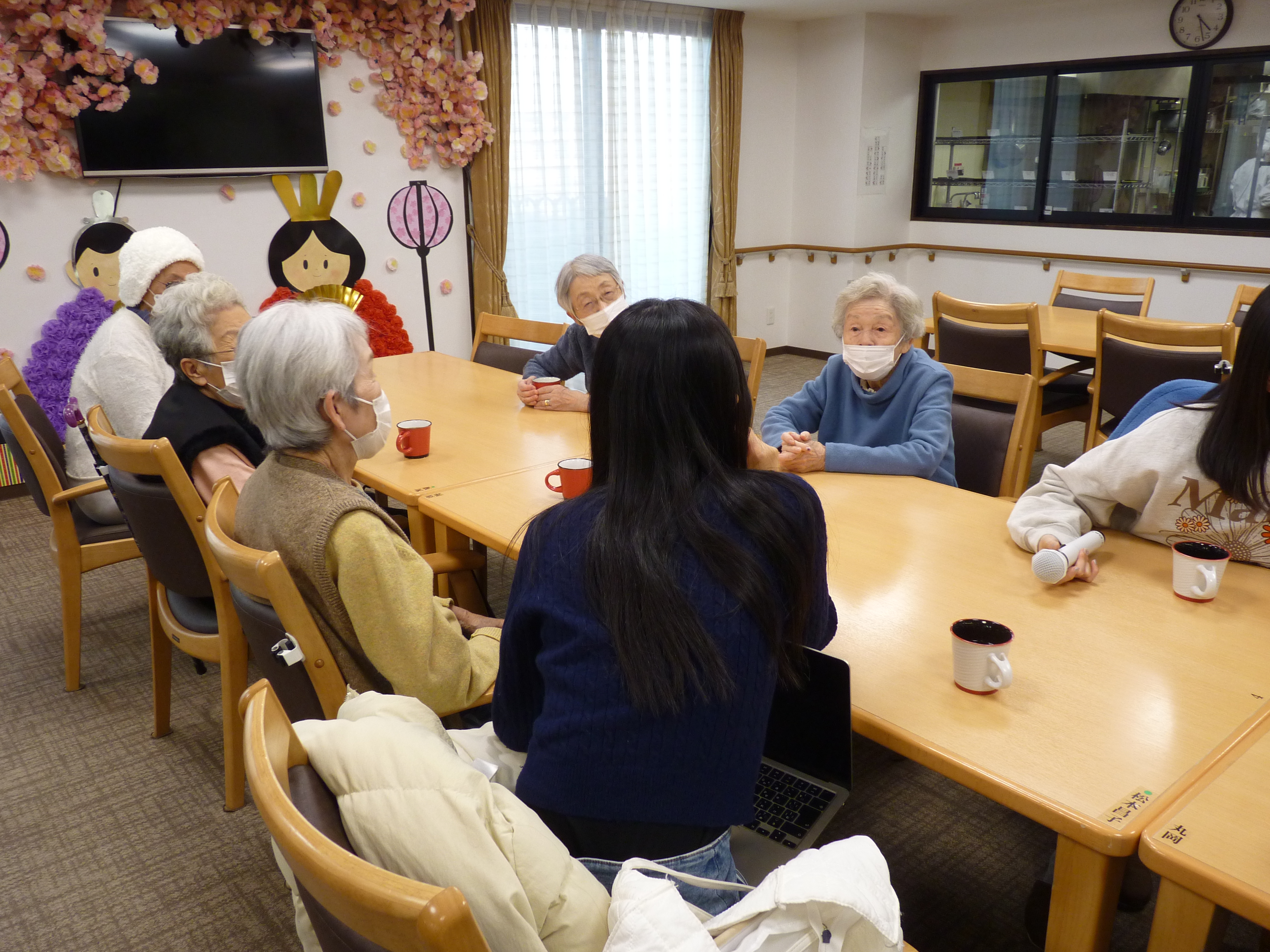 発表のため花水木苑のご入居者にお話を伺いたいとK大学付属高校の生徒さんが来所しました。活発な意見が色々と飛び交い楽しい時間になりました。お二人が優勝できますように、花水木苑のみんなで応援しています!