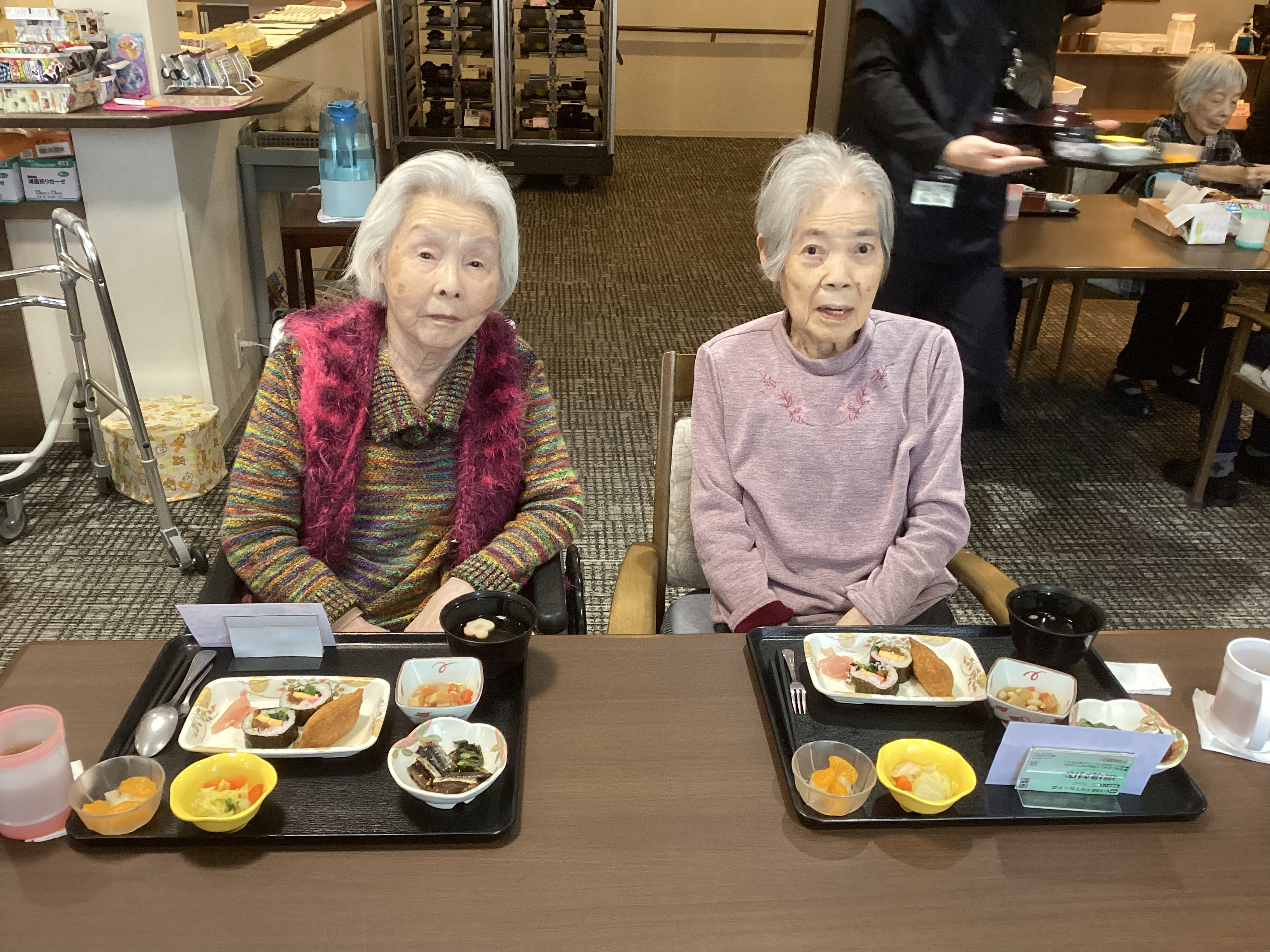 節分に合わせて巻き寿司、いなり寿司のメニューが提供されました。 また、おやつにはオニの可愛らしいお菓子もあり皆様楽しまれていました。