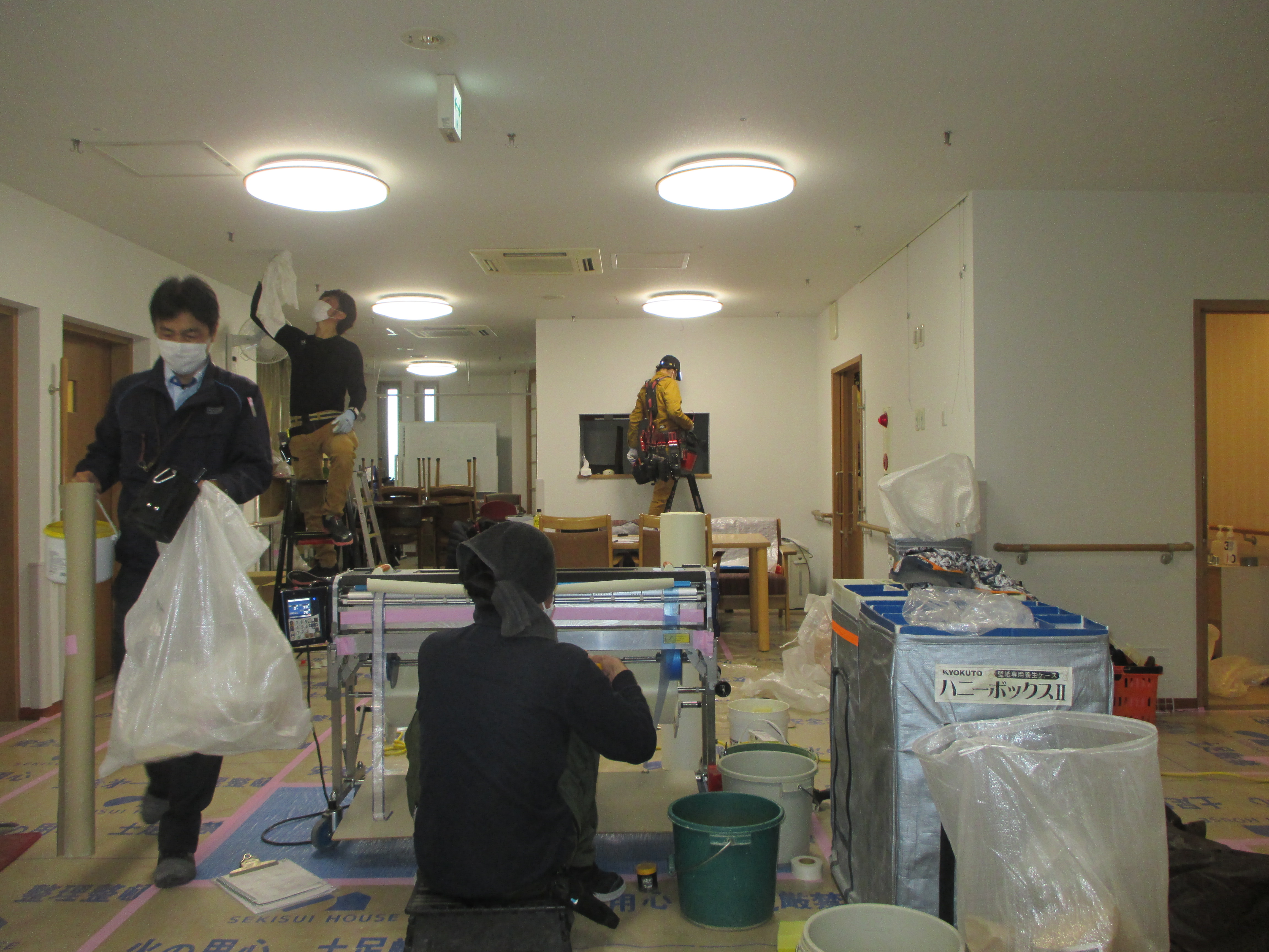 皆様が集う食堂や通所フロア他の壁紙張り替え完了。新しい壁紙に包まれたフロアでは、ご利用皆様の表情も明るく、雛人形と共に穏やかな時間が流れています。環境を整える事も大切なケアの一つと考え、これからも安心して過ごして頂ける場作りに取り組んで参ります。