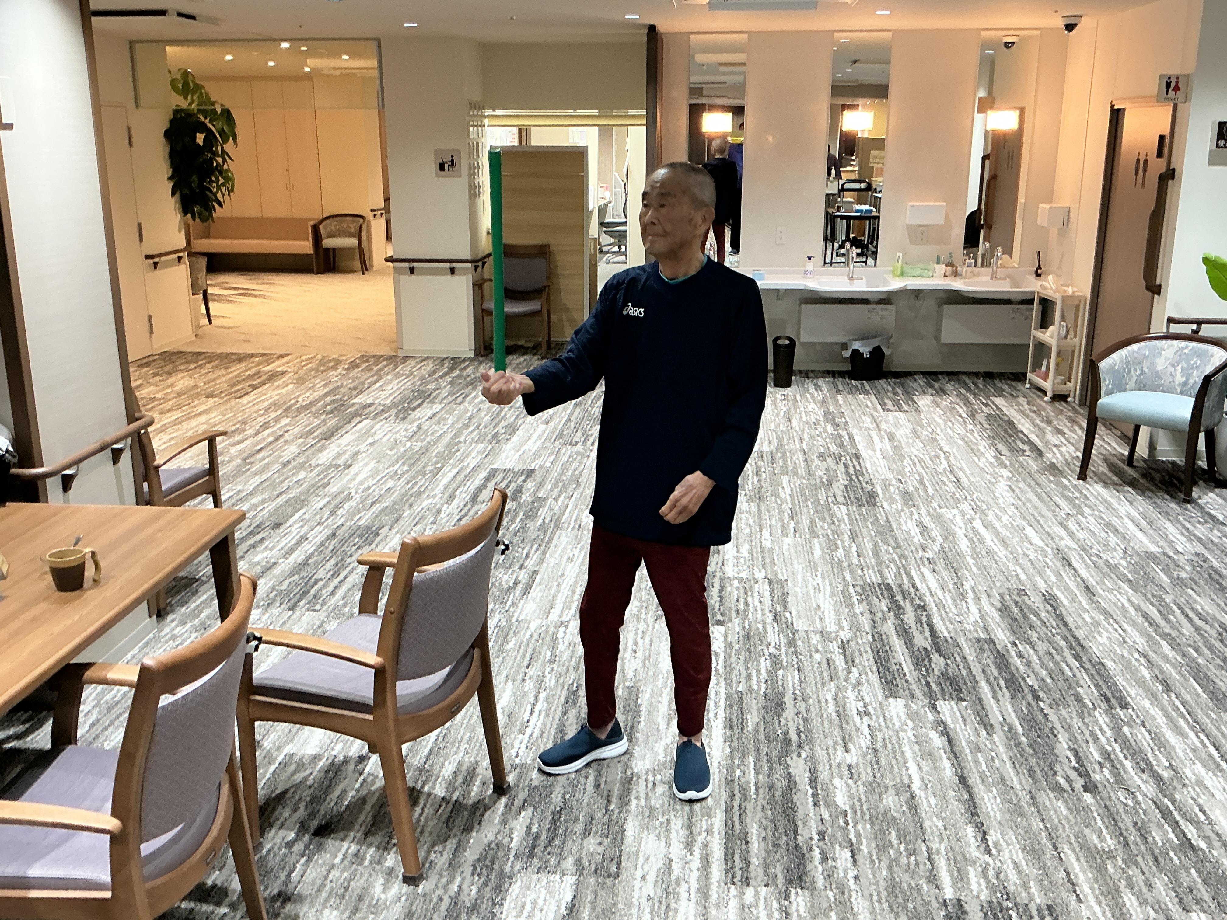 今日はおやつの後に棒体操。職員と一緒に棒を動かし、凝った体を柔らかくします。最後に棒で肩をたたいて肩こり解消。終わった後は皆さん肩が軽くなったのか、両肩を動かす姿が見られました