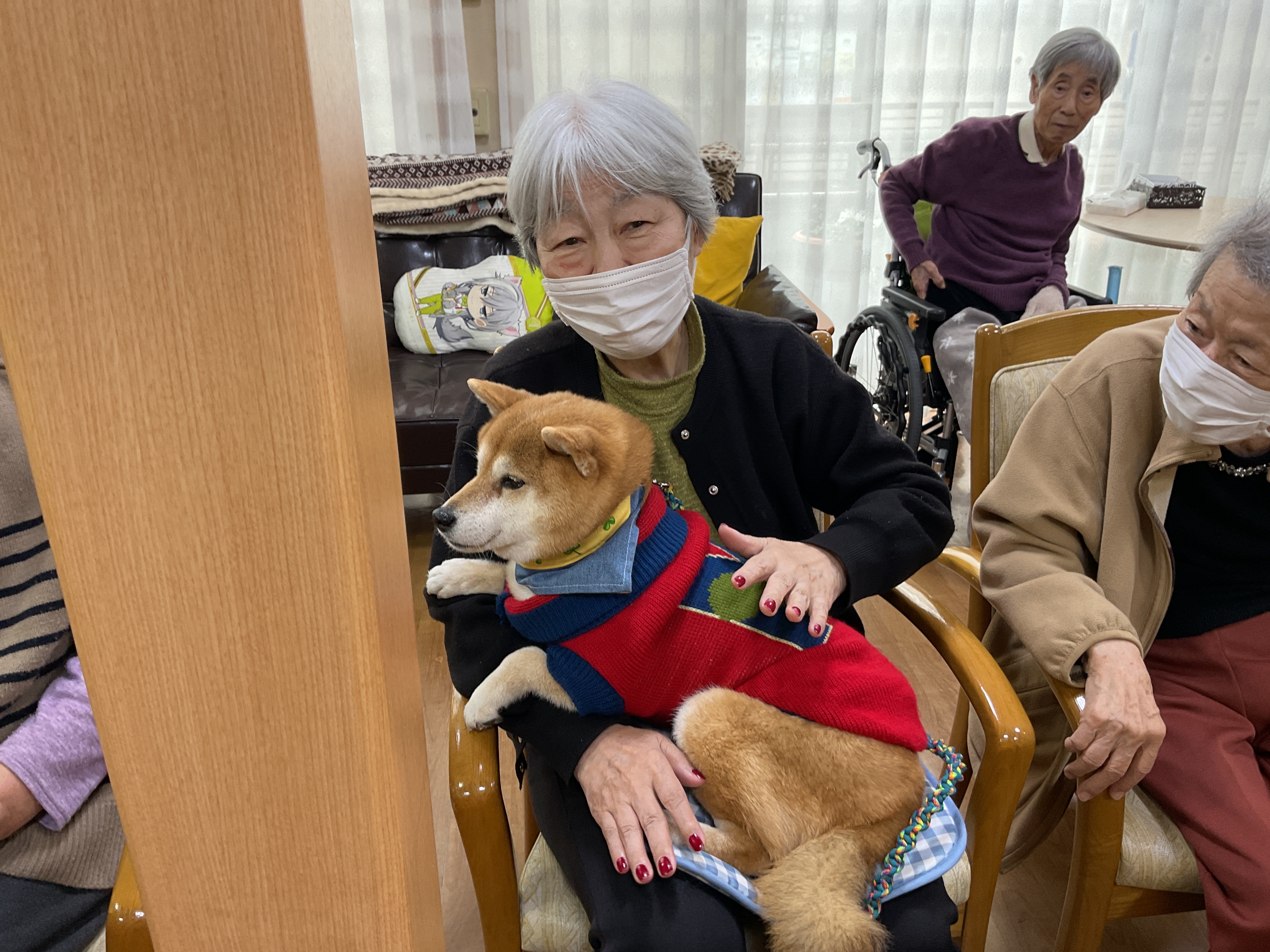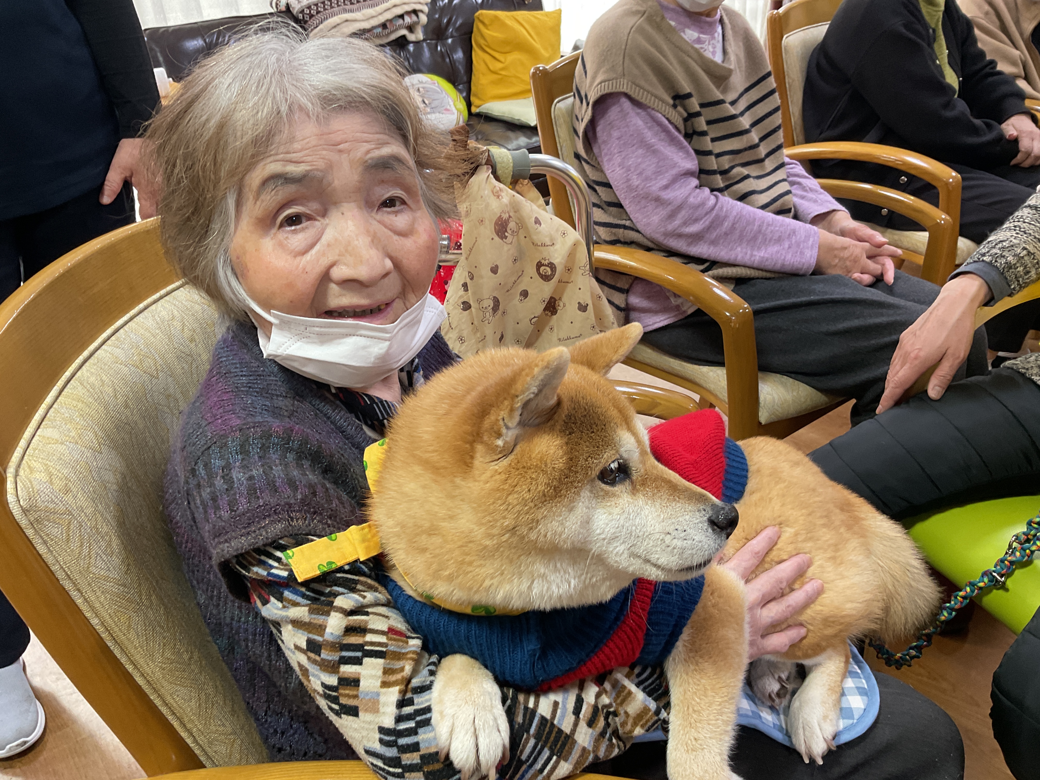 てくてくつるみさんのワンちゃん達が、ドックセラピーに来て下さいました。以前犬を飼っていたことを思い出しながら穏やかな表情で 皆さん癒されてました。