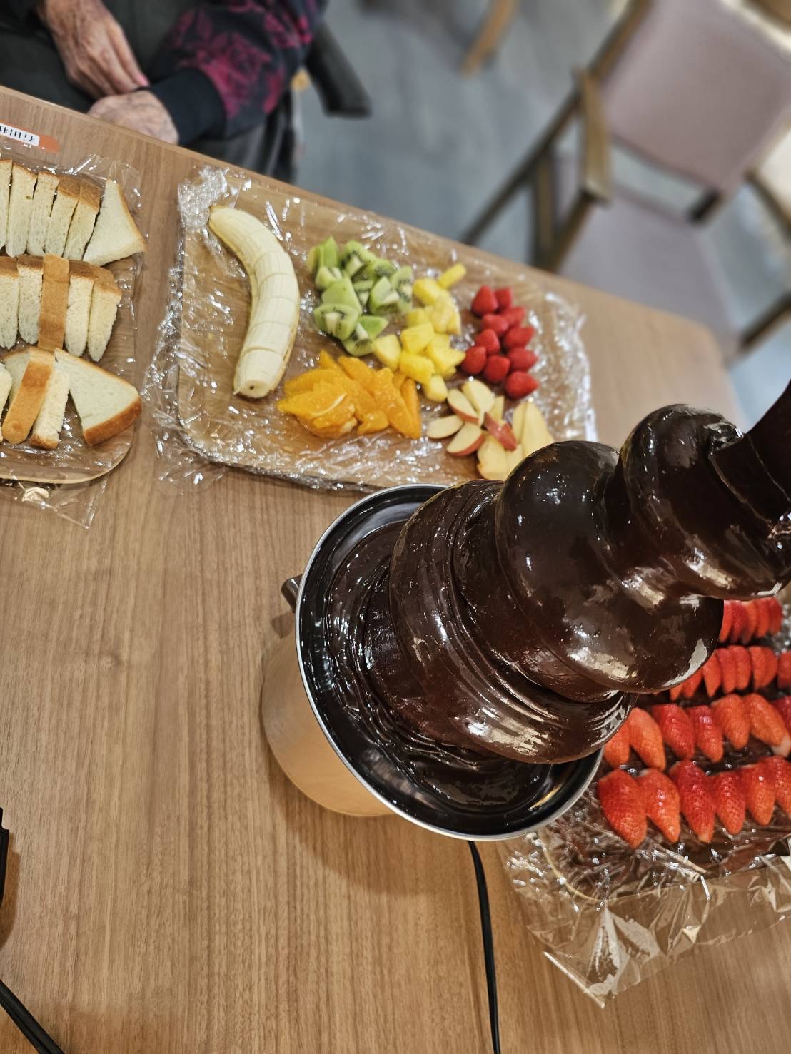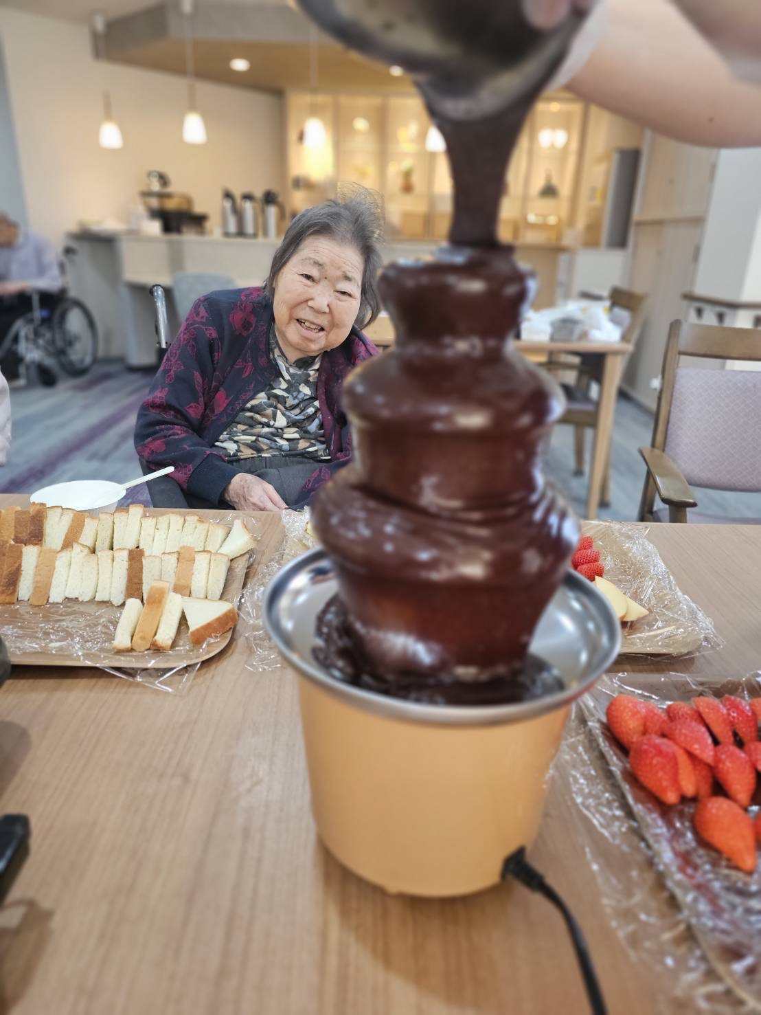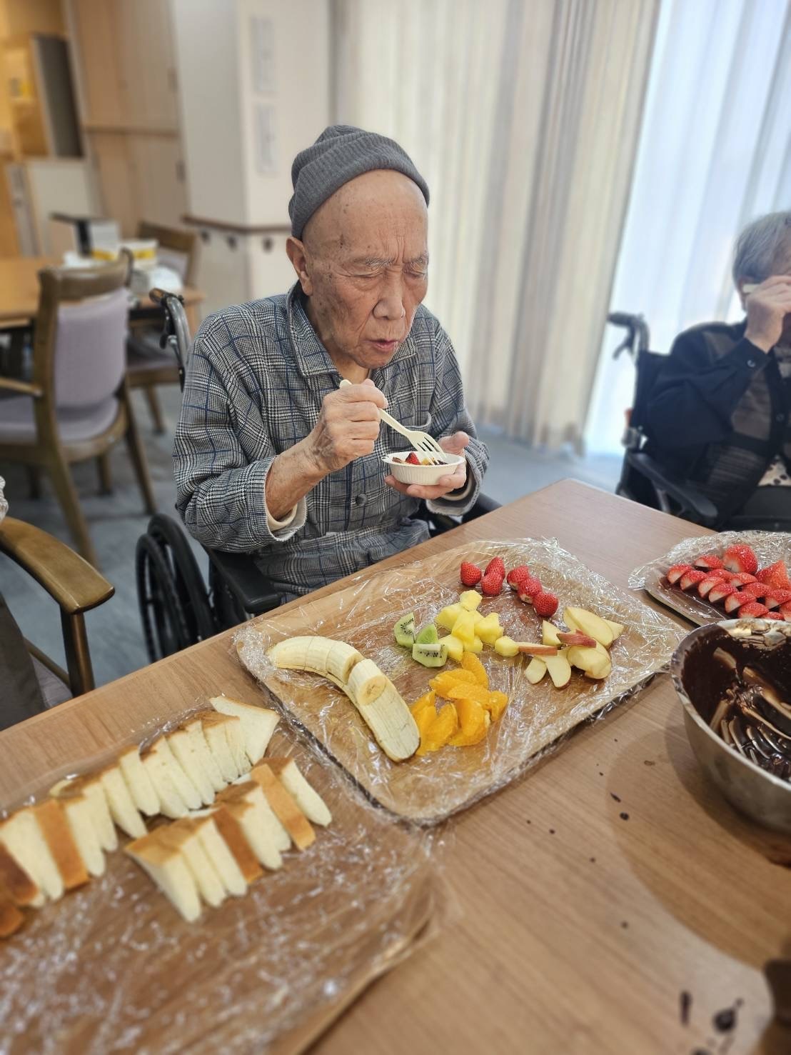 今年のバレンタインは、12日、13日と2日間に分かれて、チョコフォンデュをしました。 チョコはミルクとブレンドし、イチゴ、林檎、オレンジ等のフルーツをたくさん用意しました。 初めてチョコフォンデュをした利用者様が多く、大変好評でした🍓