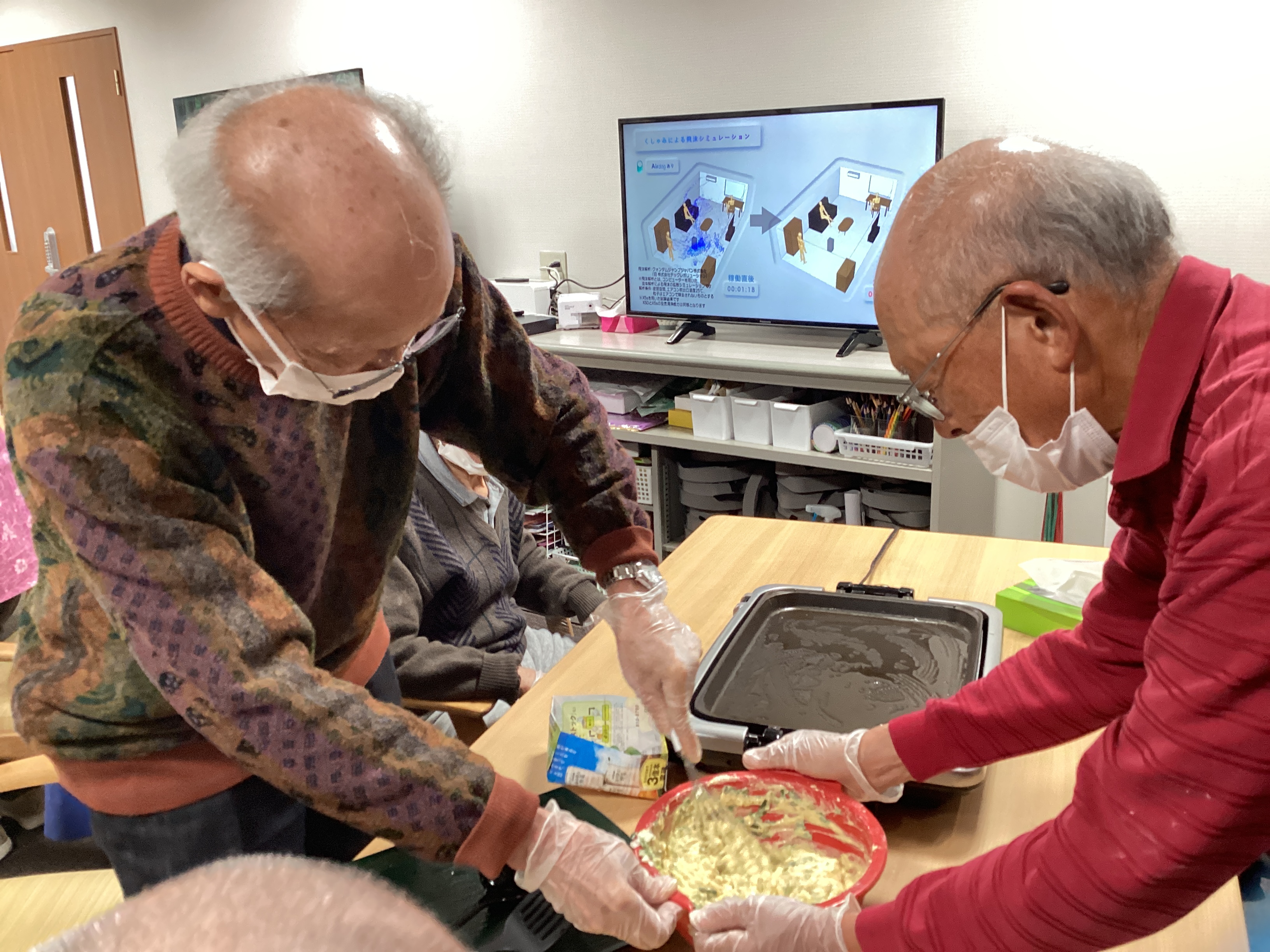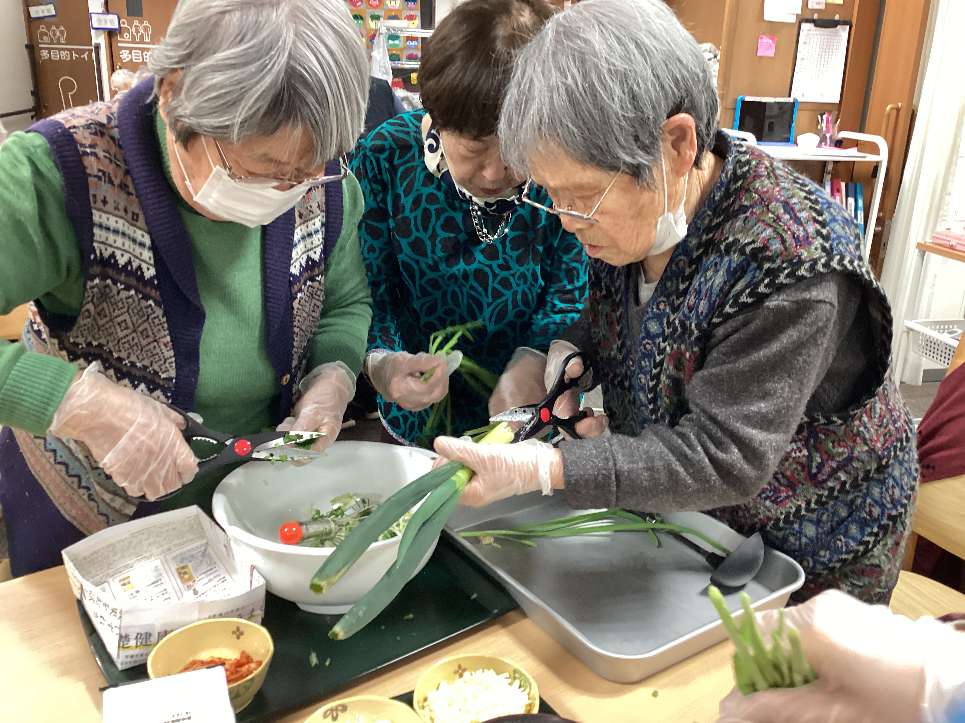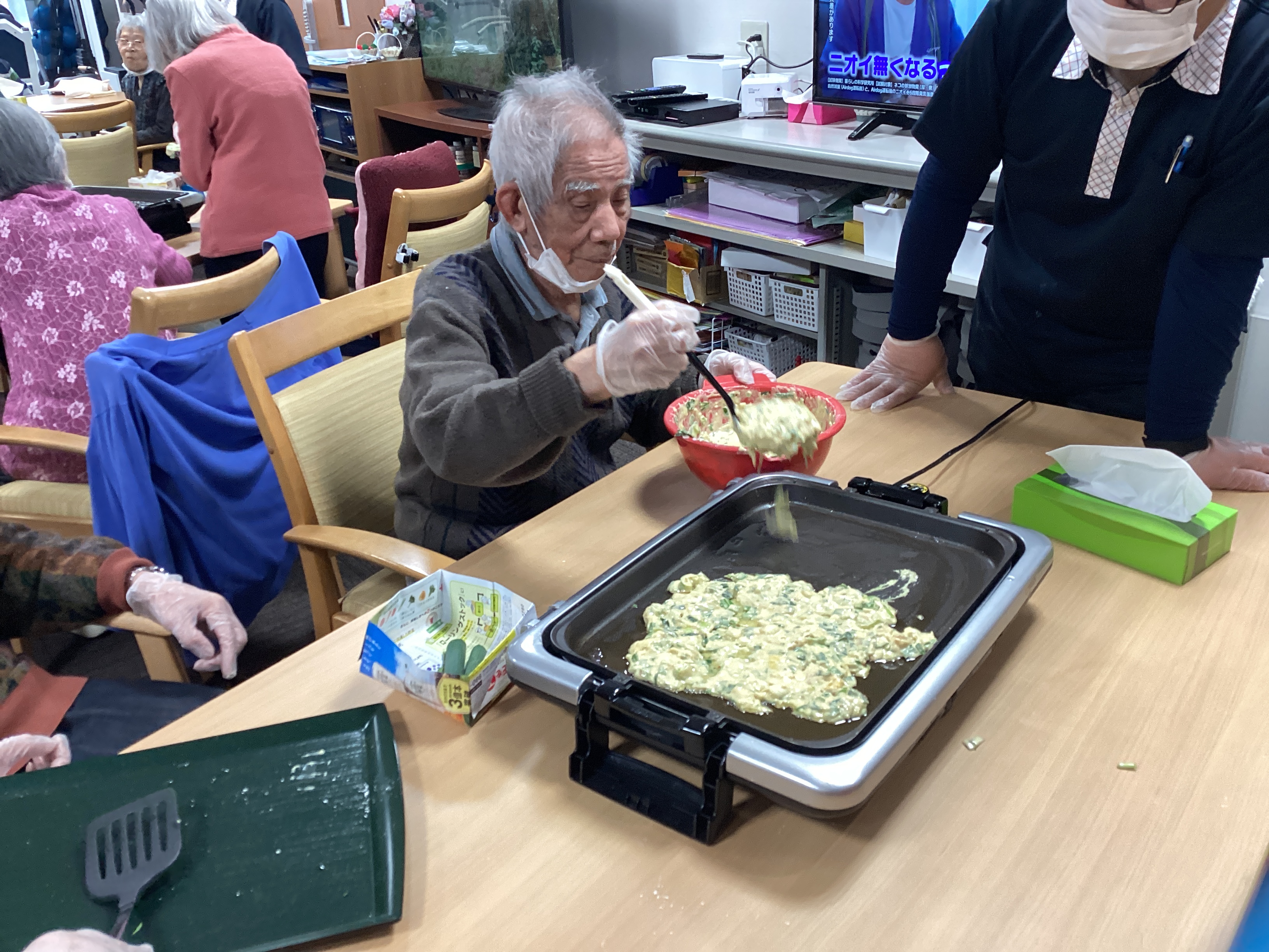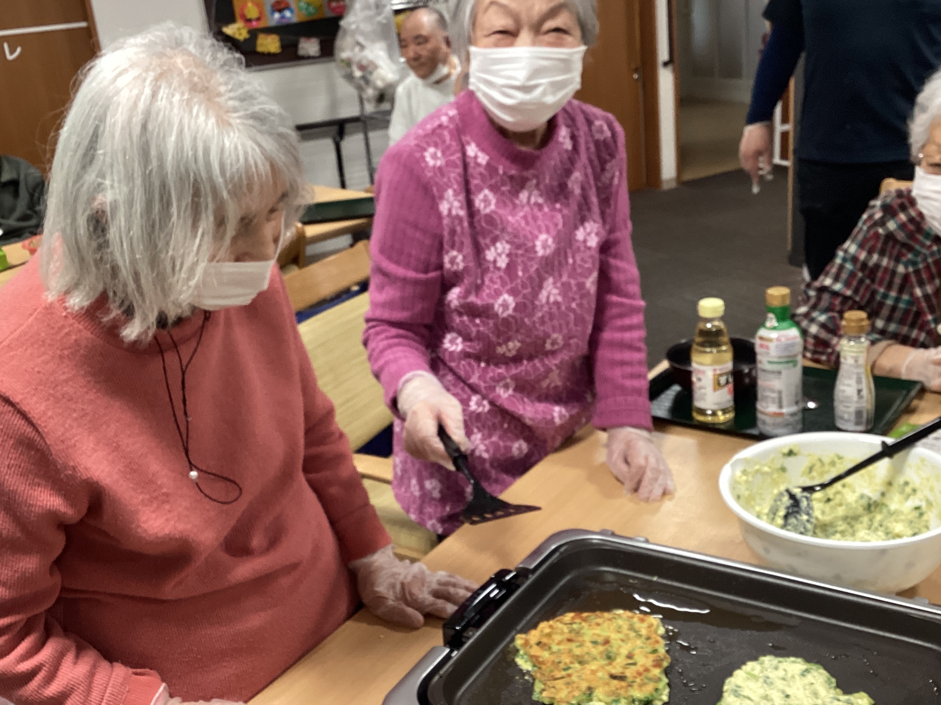 野菜を切る係、生地を混ぜる係、焼く係等 同じテーブルのご利用者と役割分担をして 美味しいチヂミが完成しました♬