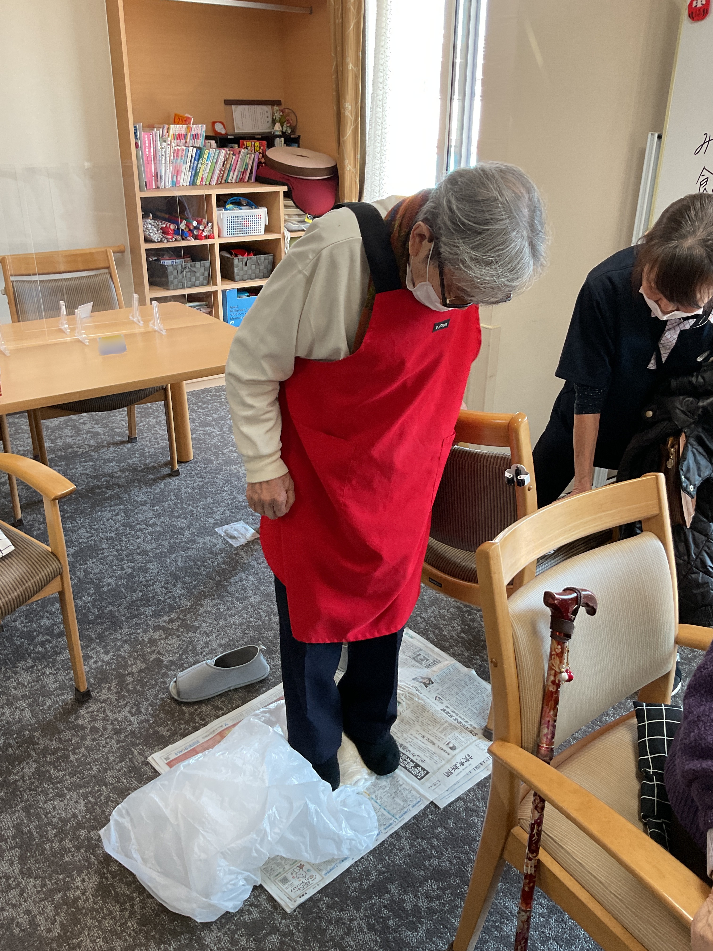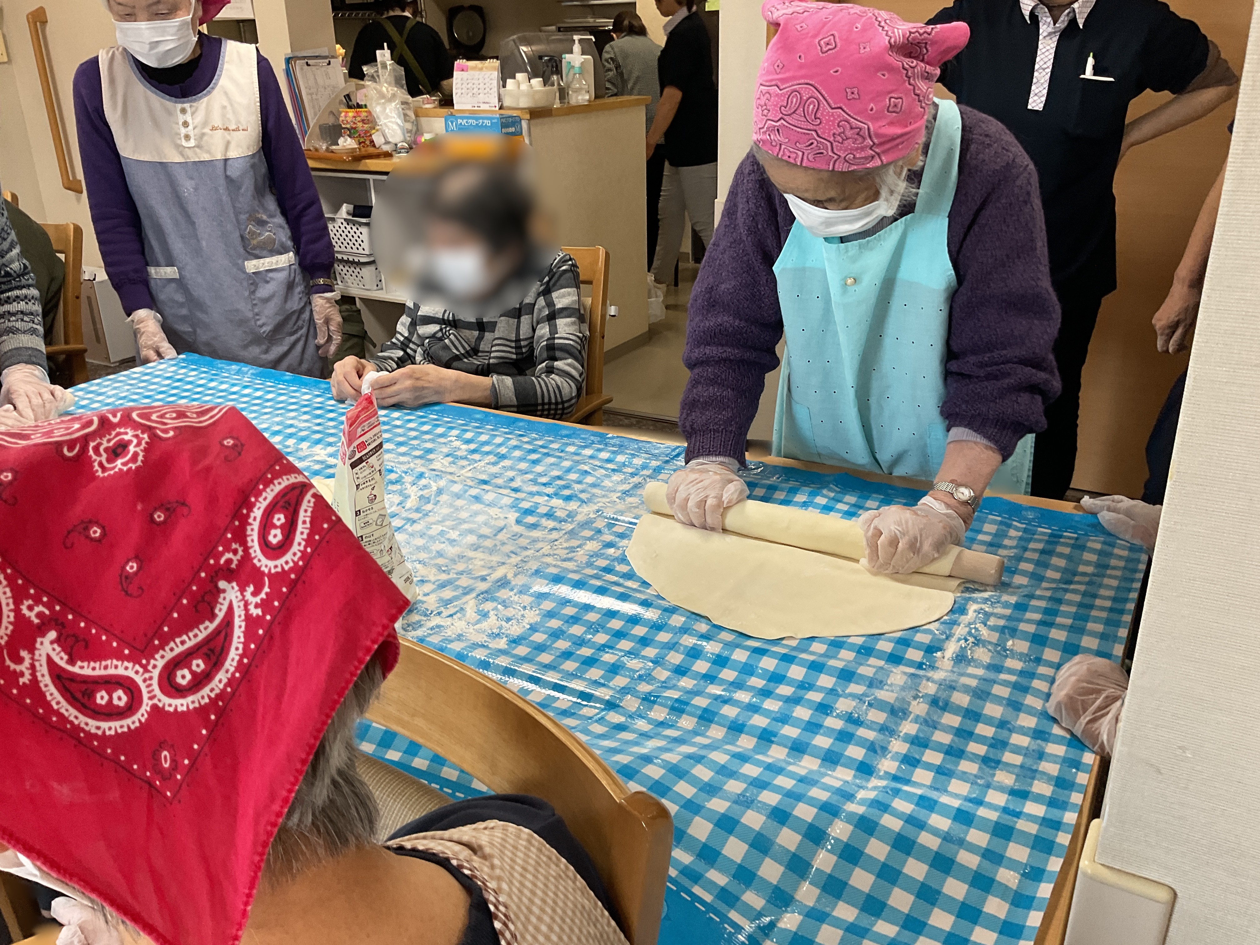 うどん作りのレクレーションを開催しました。 小麦粉からこねて、足で揉み、麺棒で伸ばしました。 出来上がったうどんはおやつにいただきました。