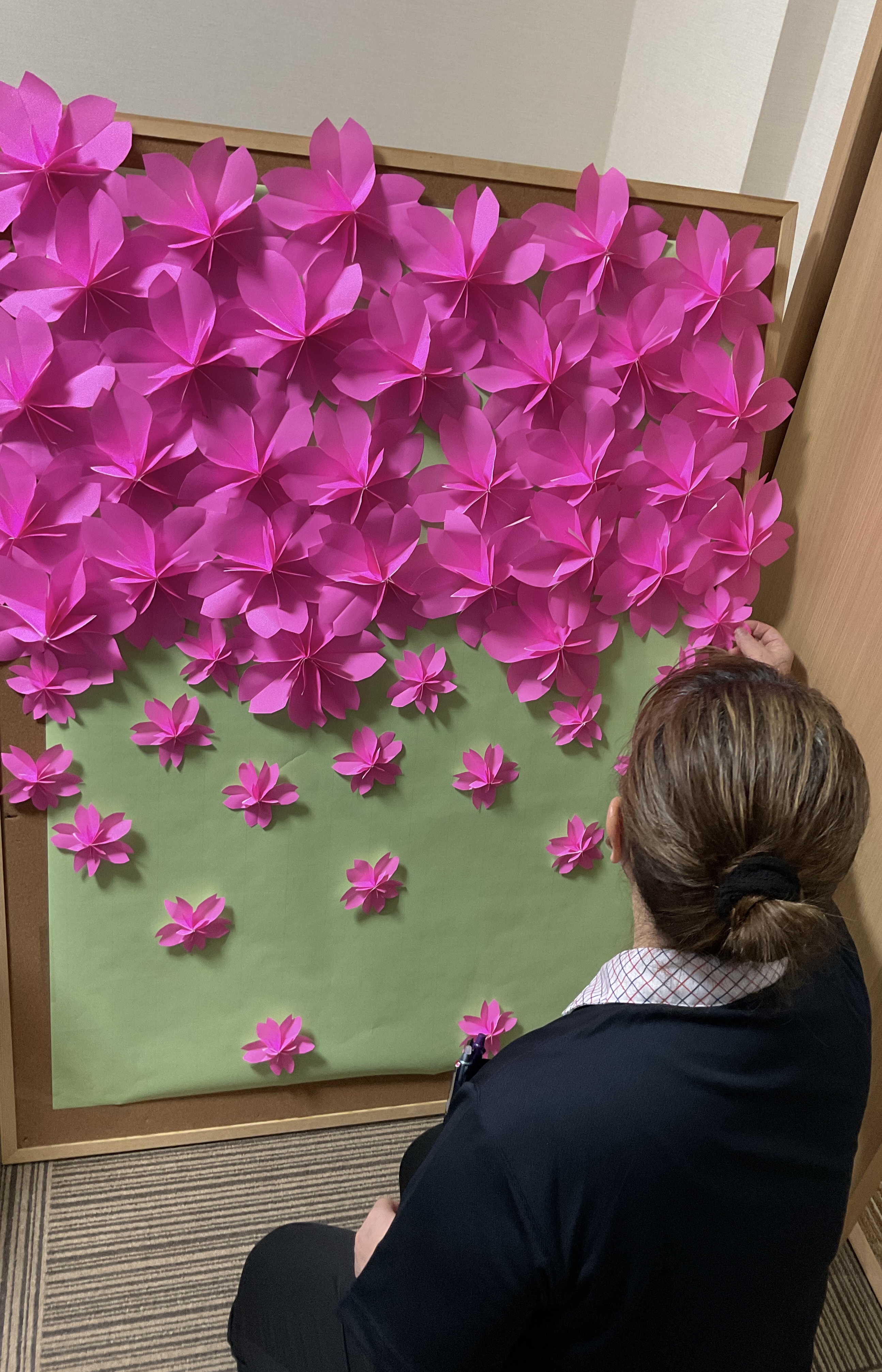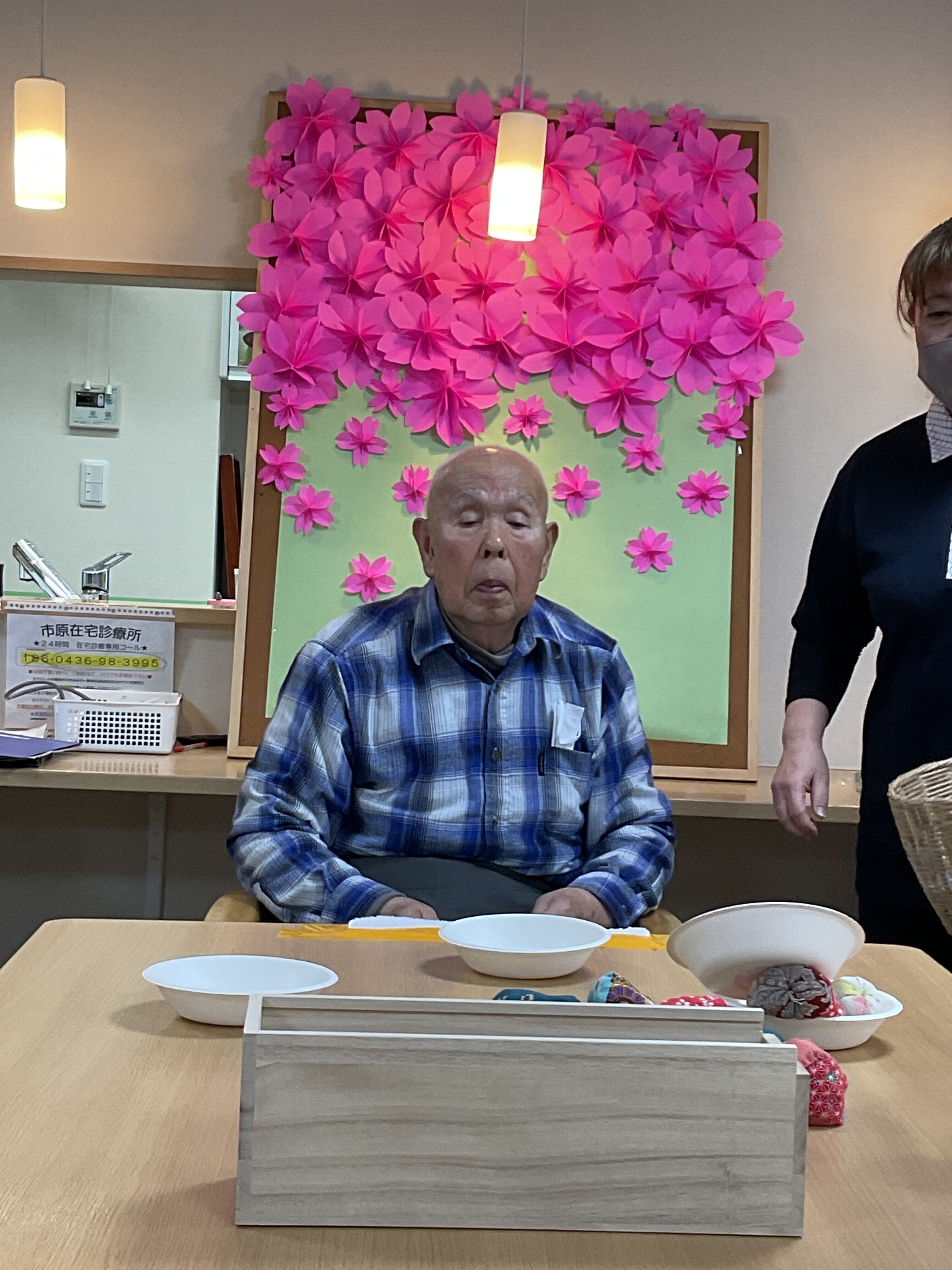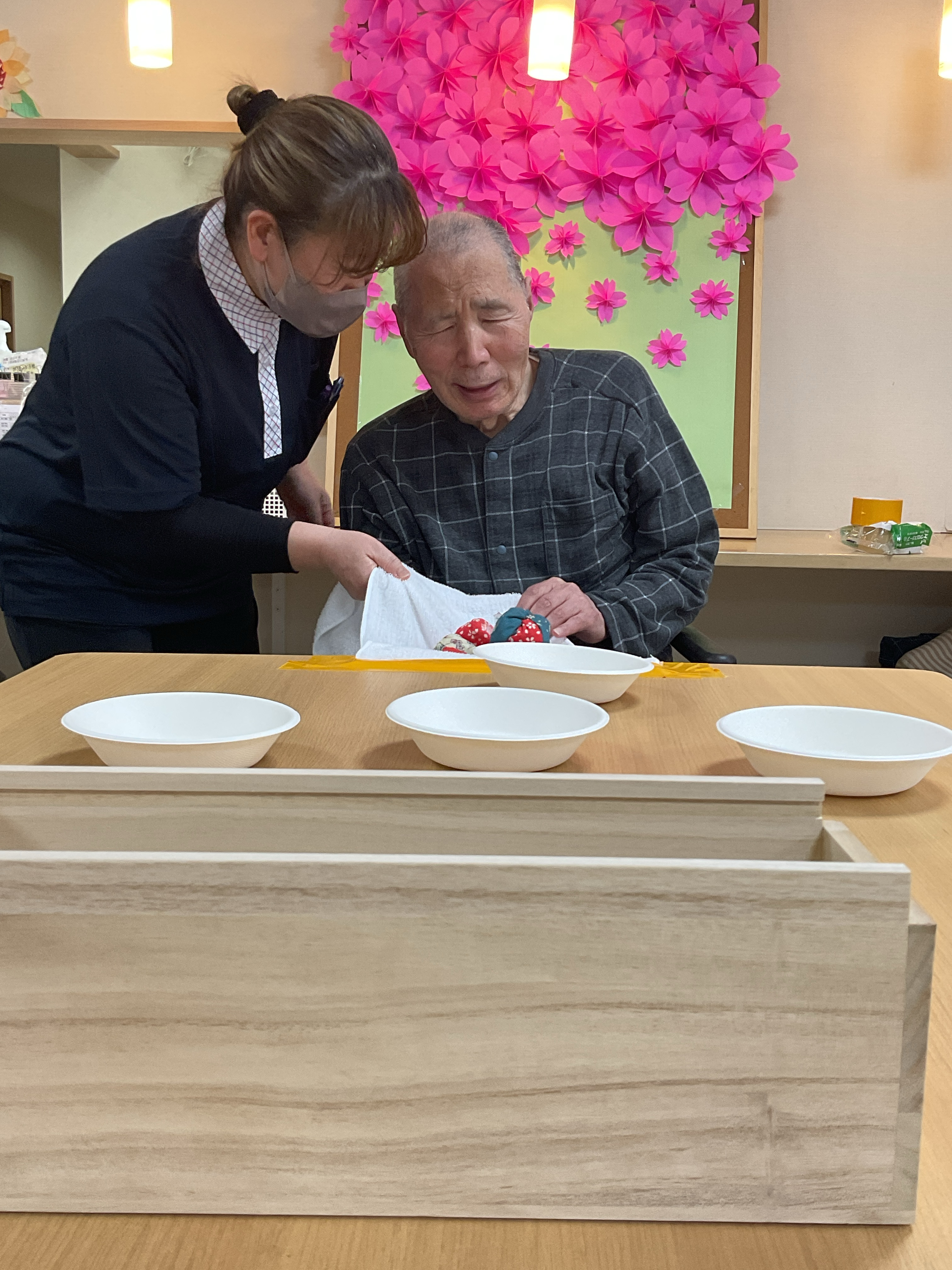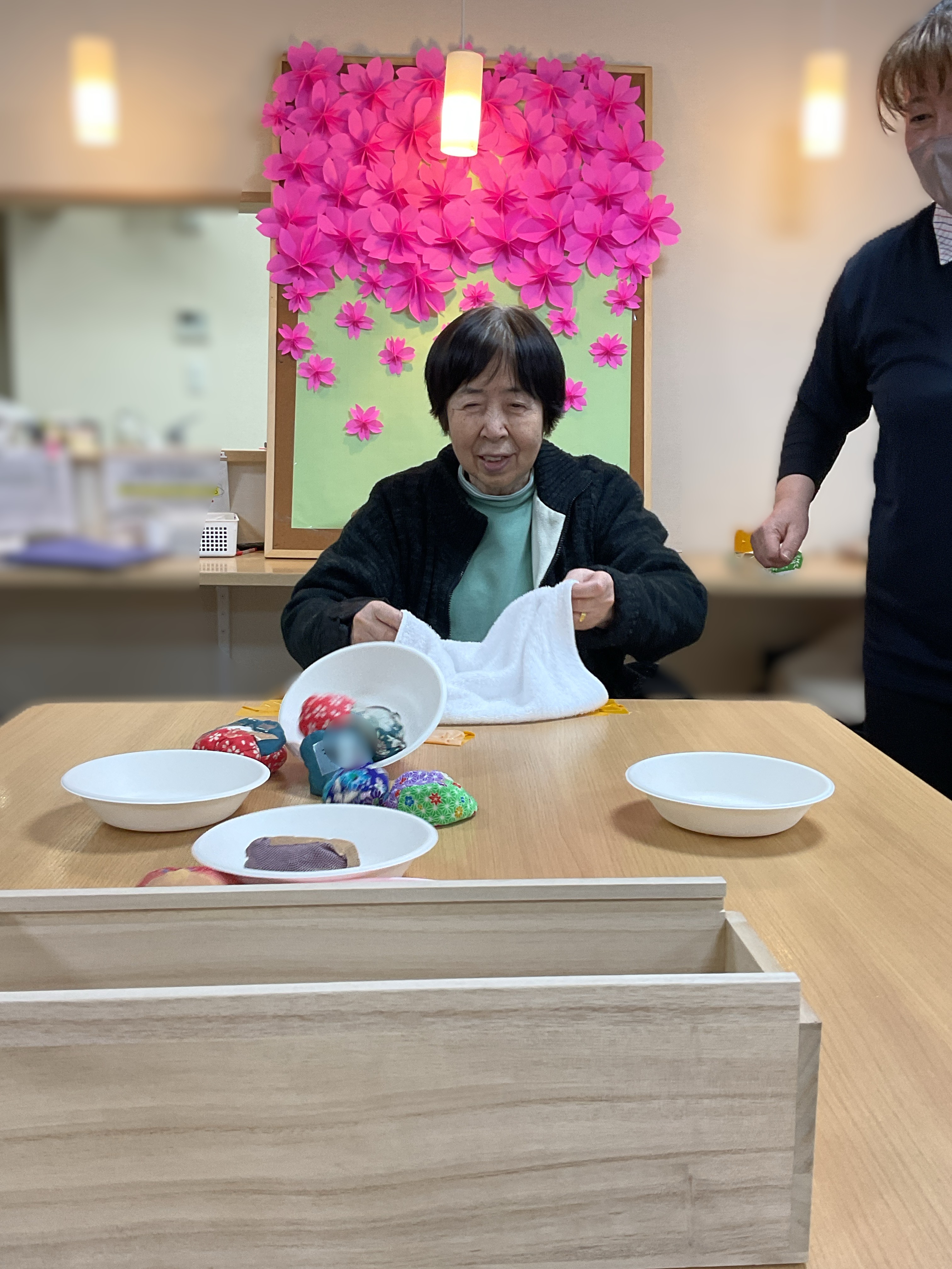 今回のレクレーションはお手玉ポン! 机に固定したタオルにお手玉を乗せ、勢い良く飛ばし箱に入ったら点数になります🎉 お手玉がどこに飛ぶかわからずハラハラドキドキでした😄 背景の櫻の壁紙は職員の手作りであり、とても丁寧かつ綺麗に作られています…🙂
