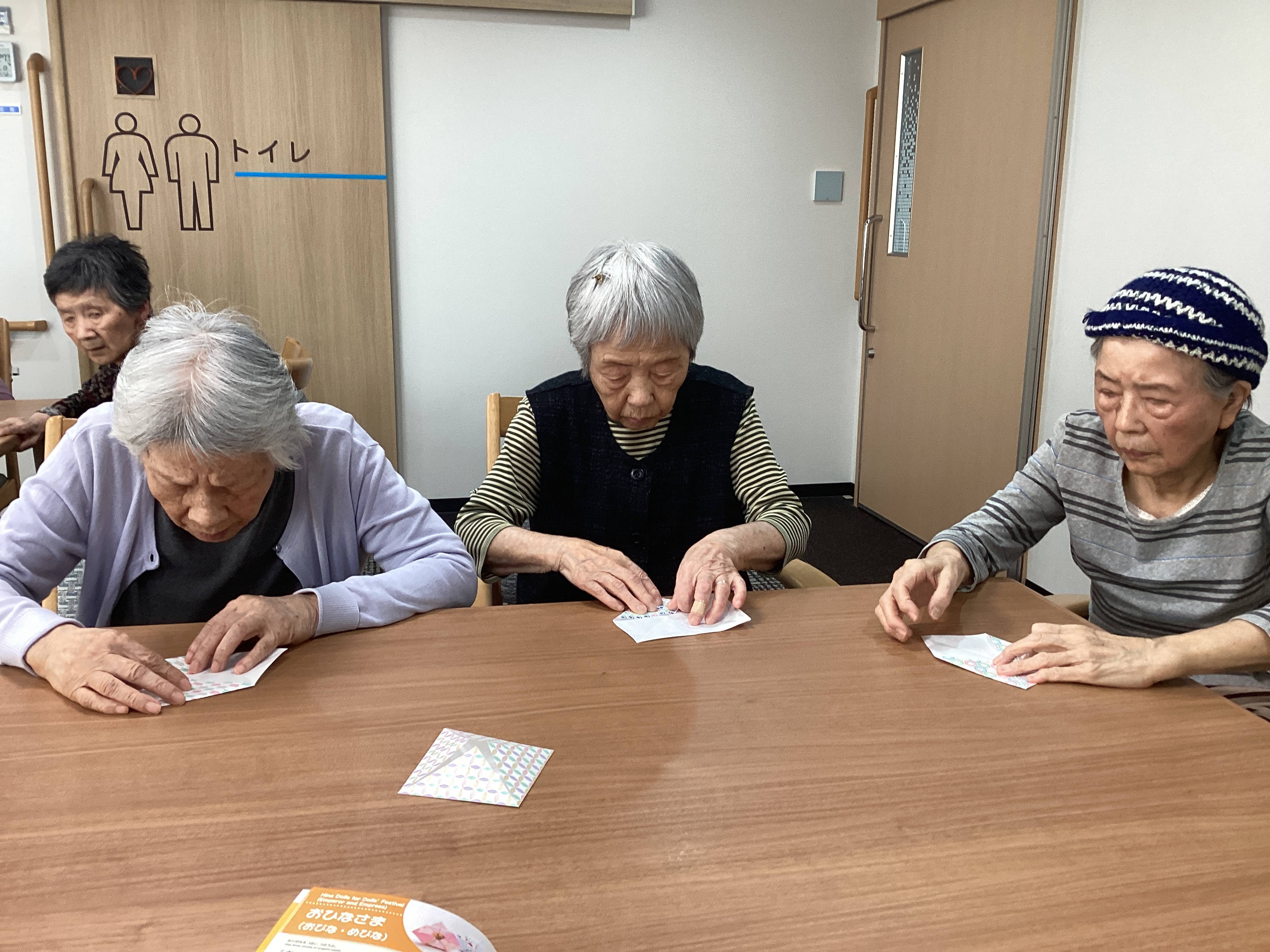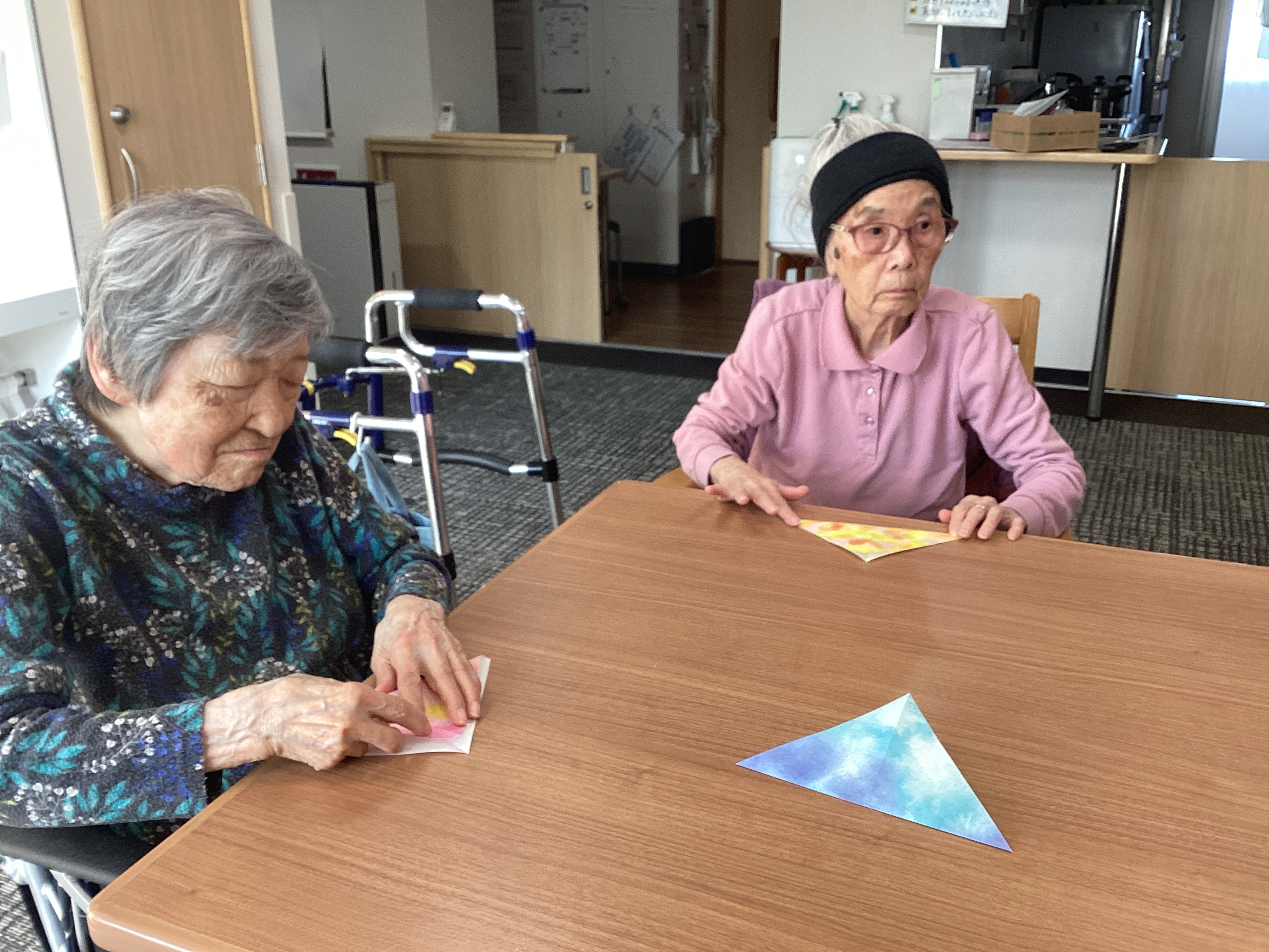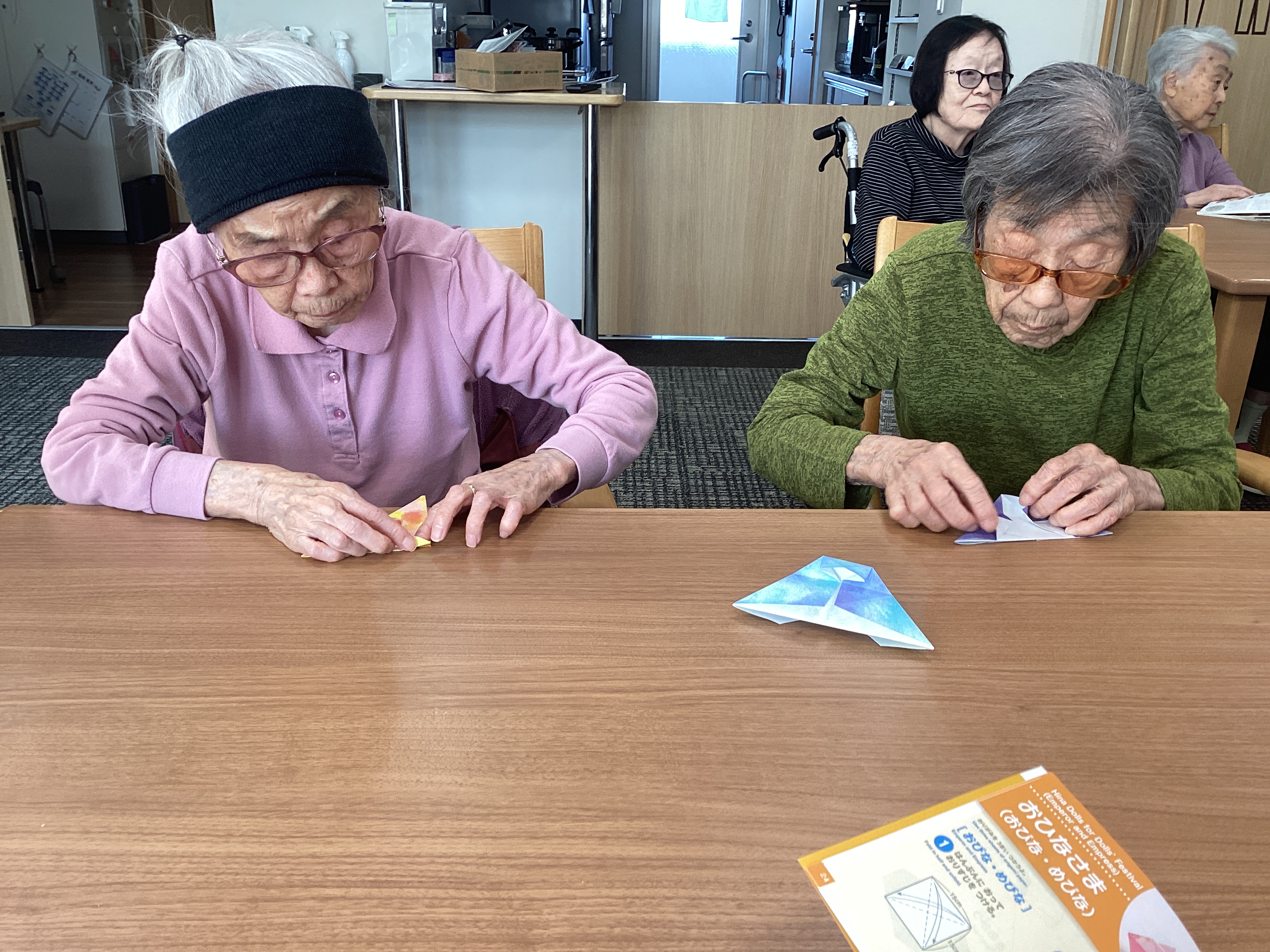 最近は折り紙ブームです。 鶴、ウサギ、お雛様など様々なものを作り、飾っています。そのおかげで施設内が華やかです。 細かなところも皆様丁寧に作られています。 次は何を作ろうかな🤔