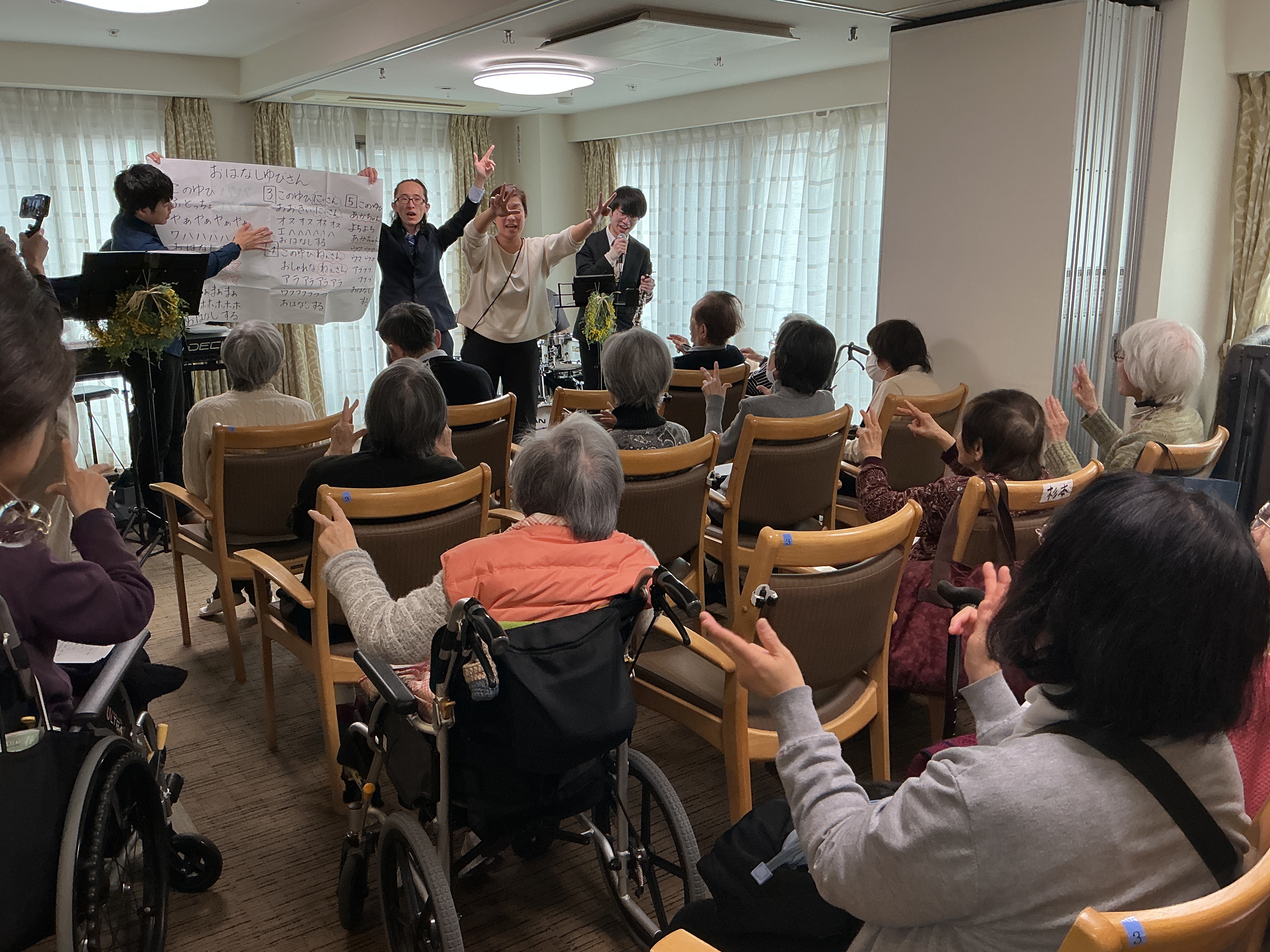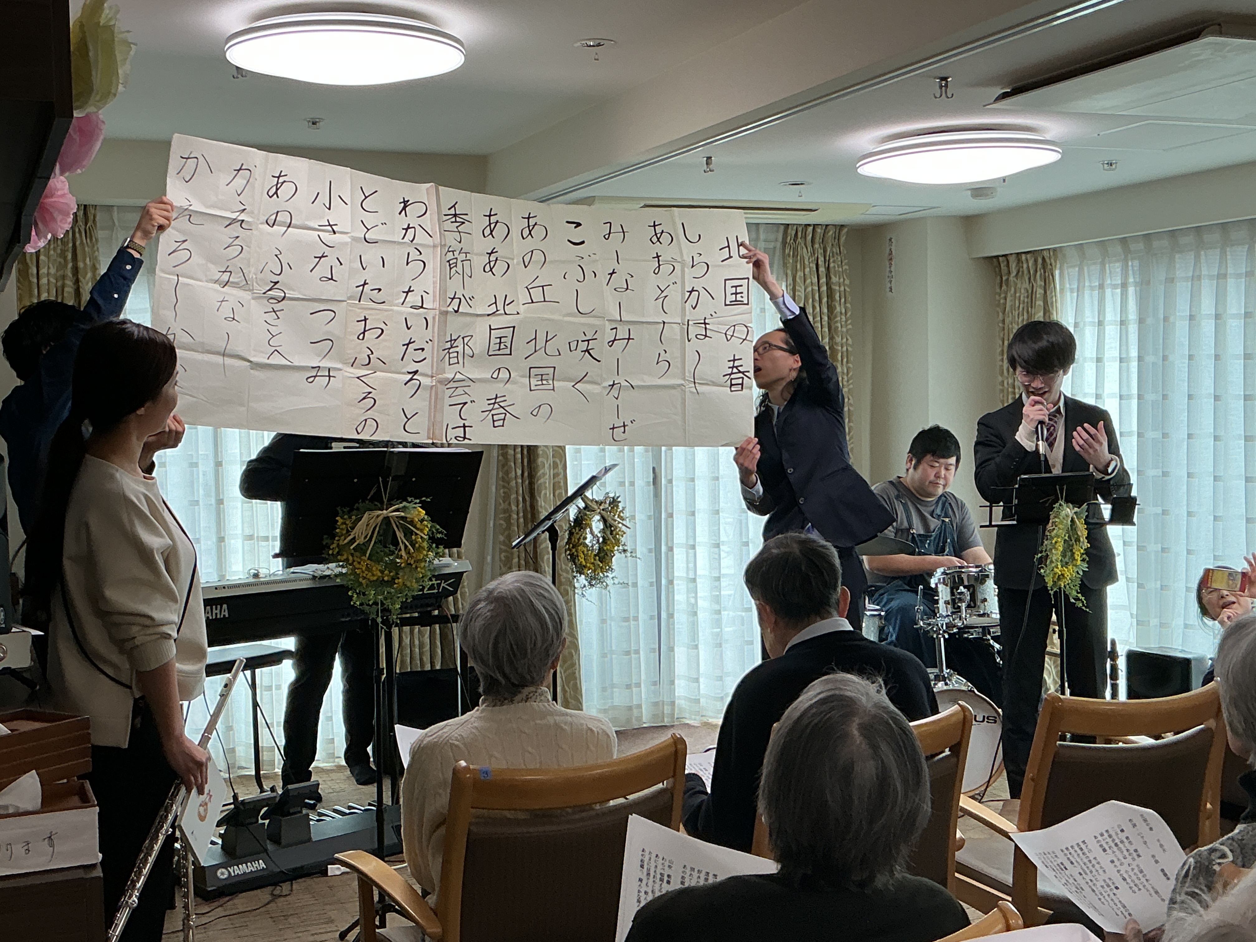 2月20日(金」ミモザ楽団の皆様が久我山施設に来訪されました。ご家族も参加され、日頃、聞く事が出来ないとステキな演奏を生で聞く事が出来て貴重な体験でした💐
