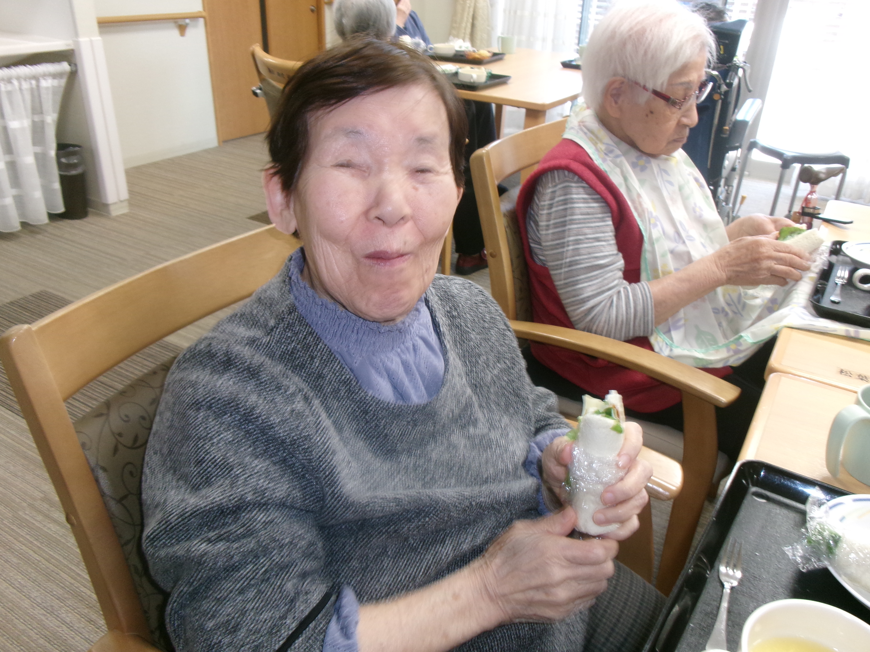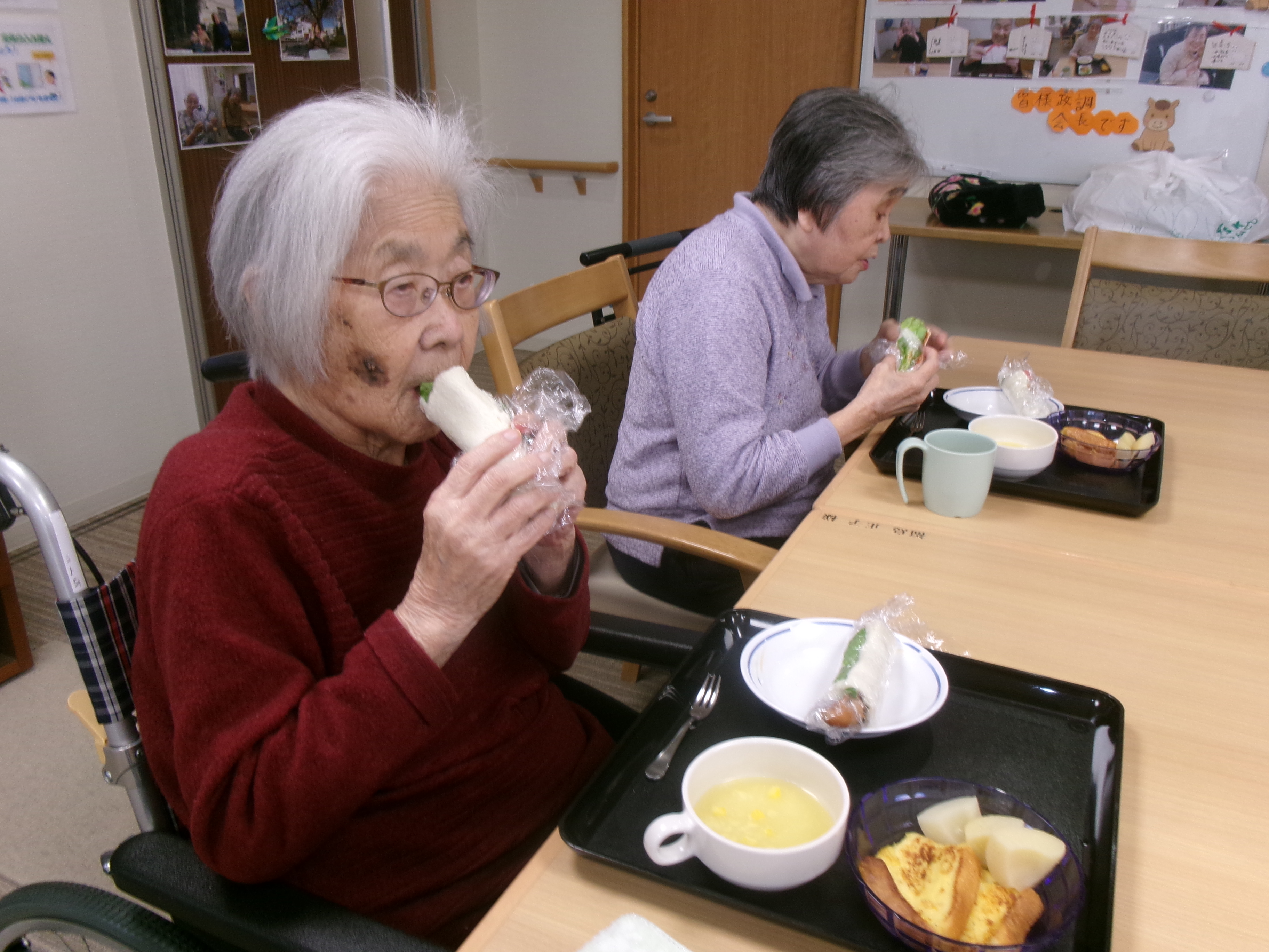 お昼ご飯は手作りのロールサンドです。パンを伸ばしロングウインナーやポテトサラダをくるくる🎶フレンチトーストの液作りも作っていただきました。出来立てのロールサンドは別格ですね(⌒∇⌒)