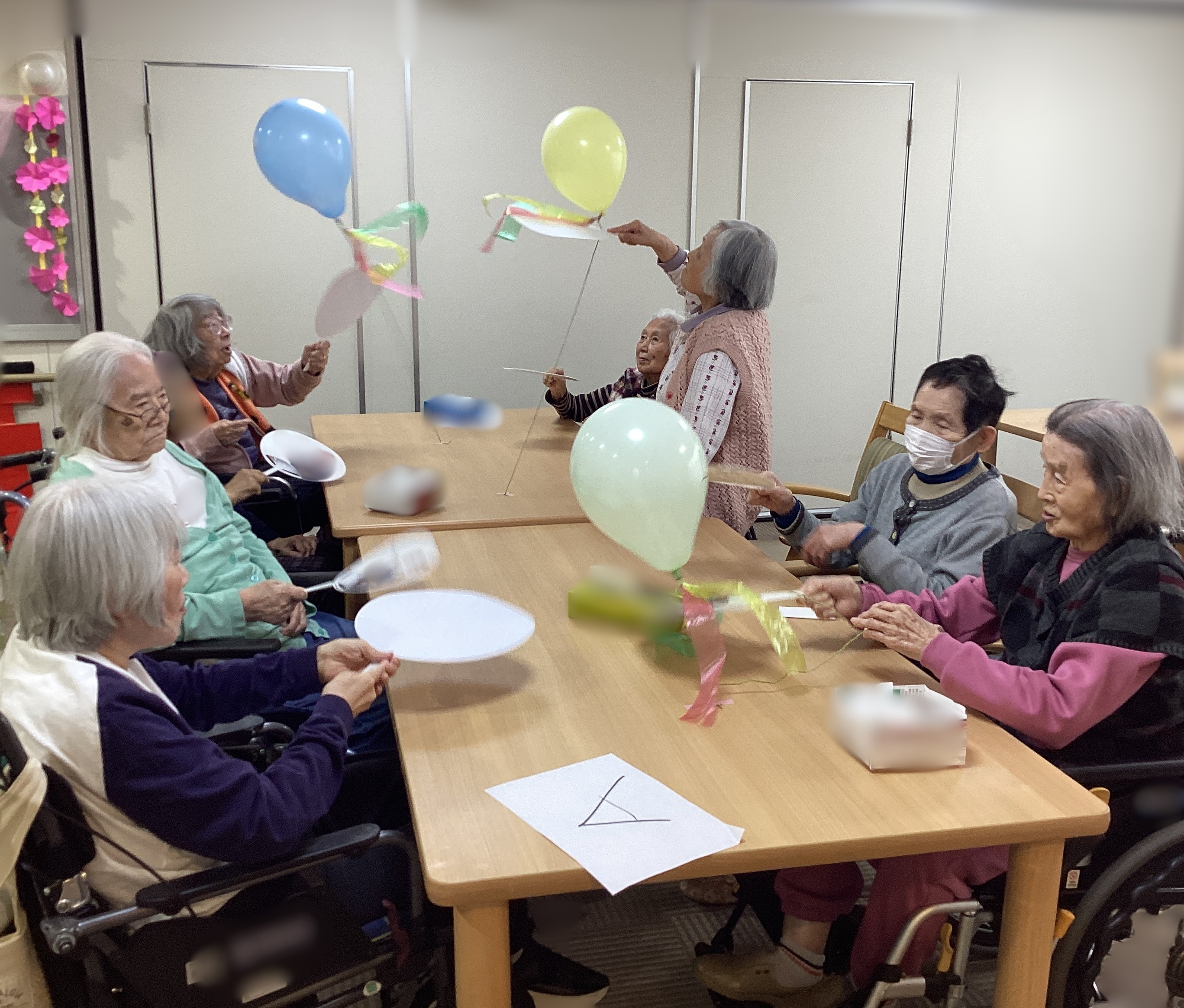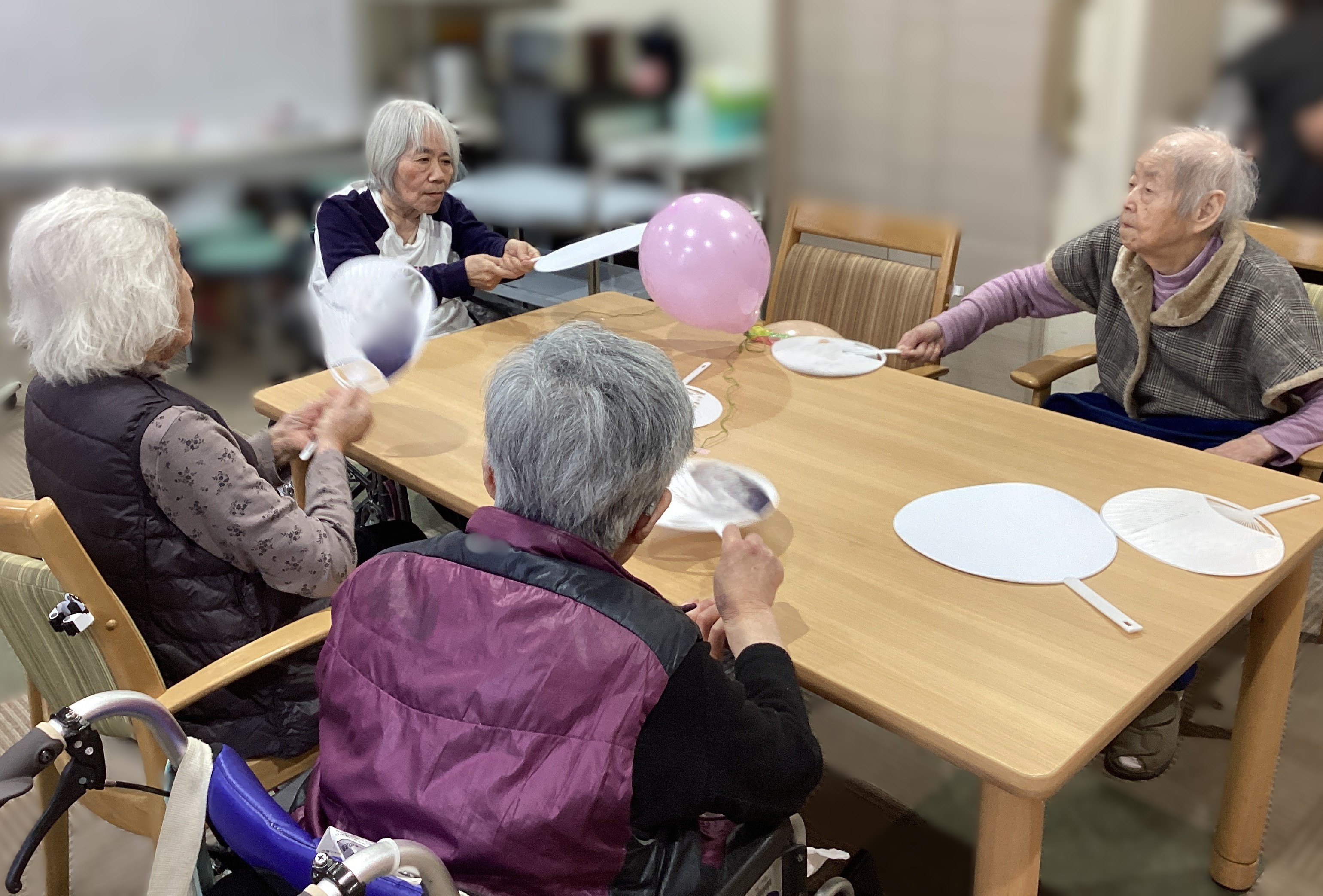 🎈風船に似顔絵を描き羽根つきのように🎈風船を協力して浮かせるレクリエーションを行いました。皆様チームワーク良く頑張って🎈風船を長く浮かせてひと汗💦かきました。