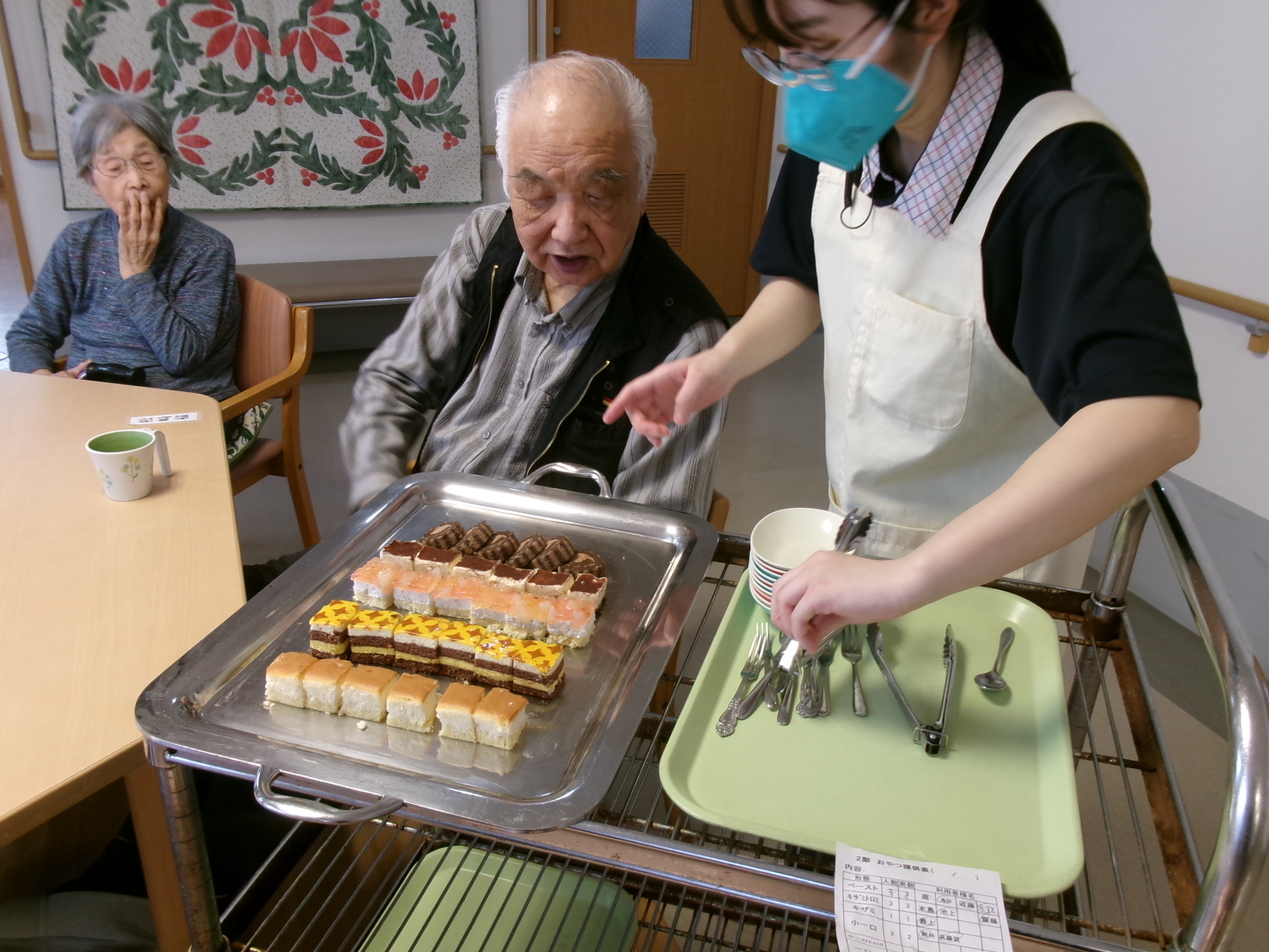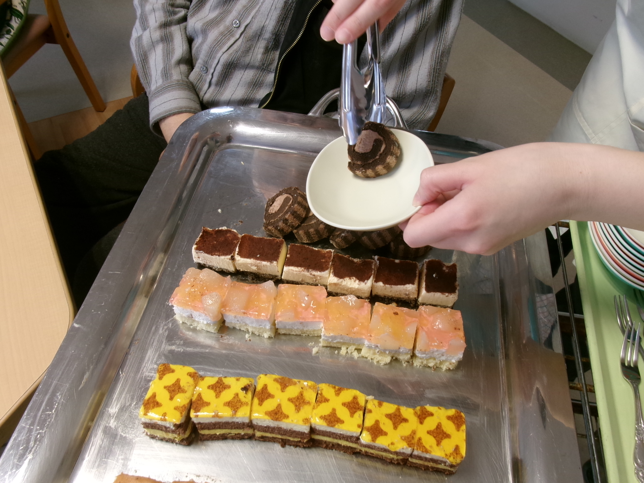 うらやましい、ではなく、月に一度のお楽しみ。 ケーキバイキングを実施させていただきました。 5種類の中から3個なのが悩ましいですね。 食事形態に併せてご用意させていただきました。 皆さんならどれを選びますか?