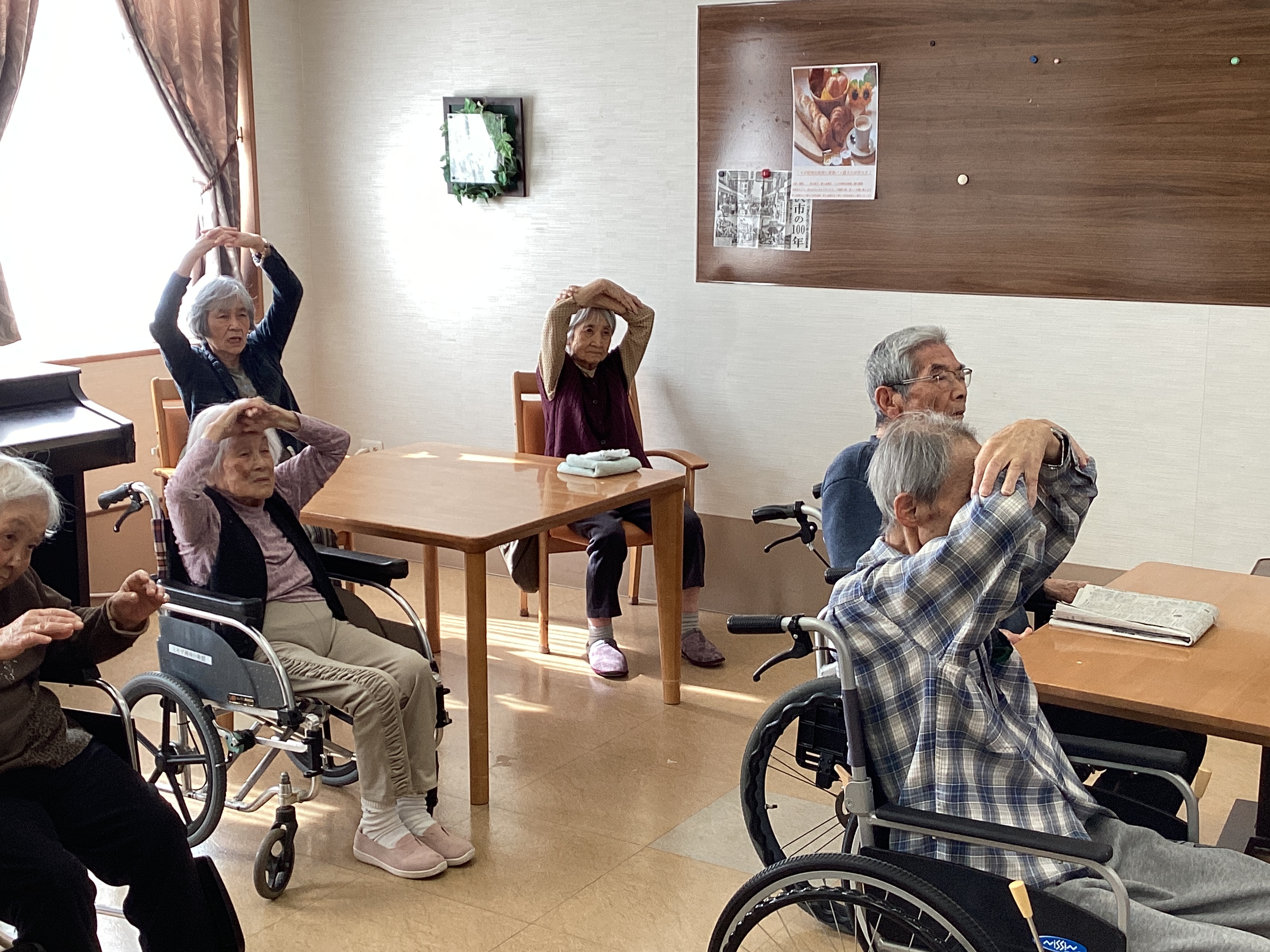 日常の様子をパチリ!笑いあり、体操など、施設内元気に過ごされています!