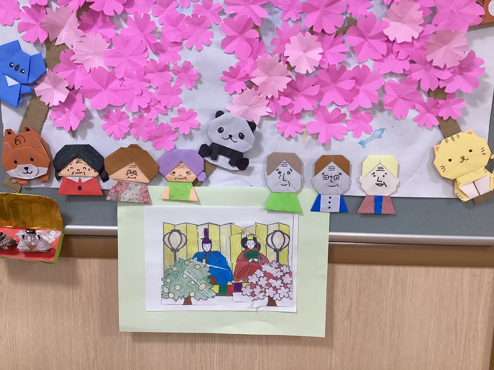 フロアの掲示板に、ひな人形の折り紙と、桜🌸の花びら、笑顔の仲間たちがお部屋を明るくしてくれました