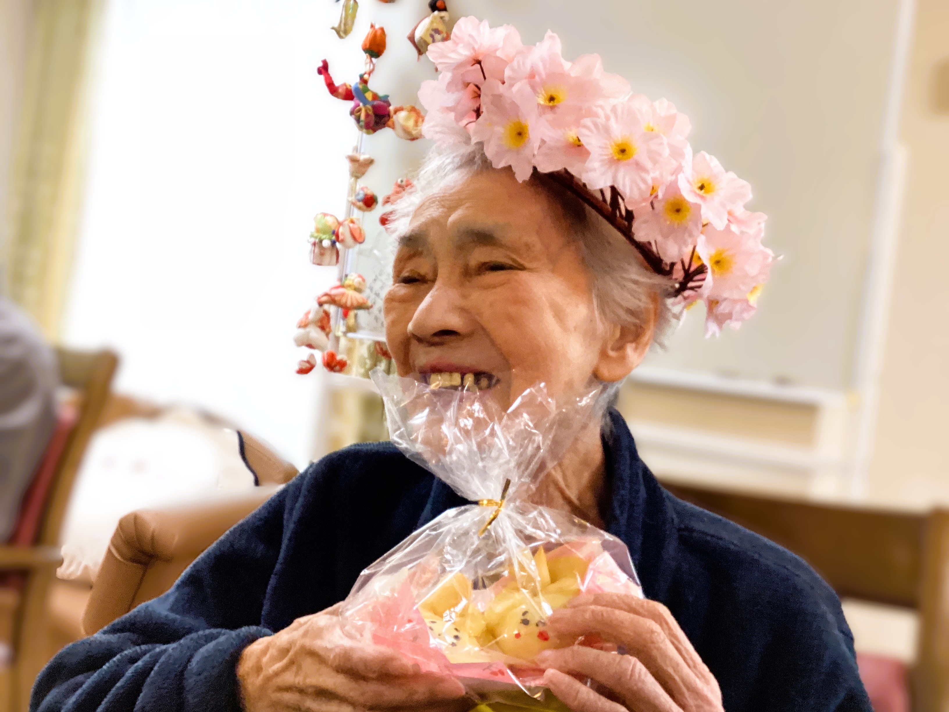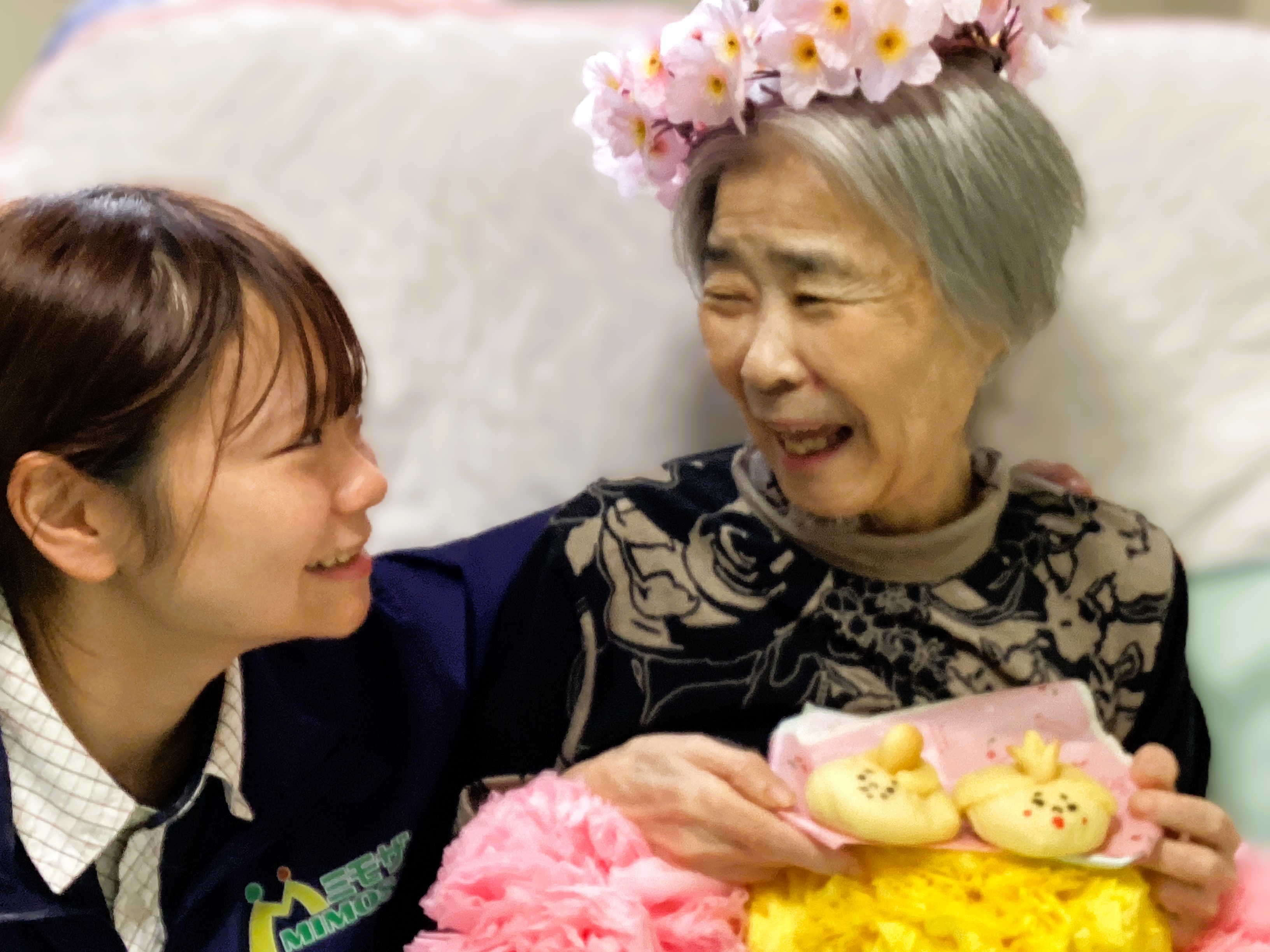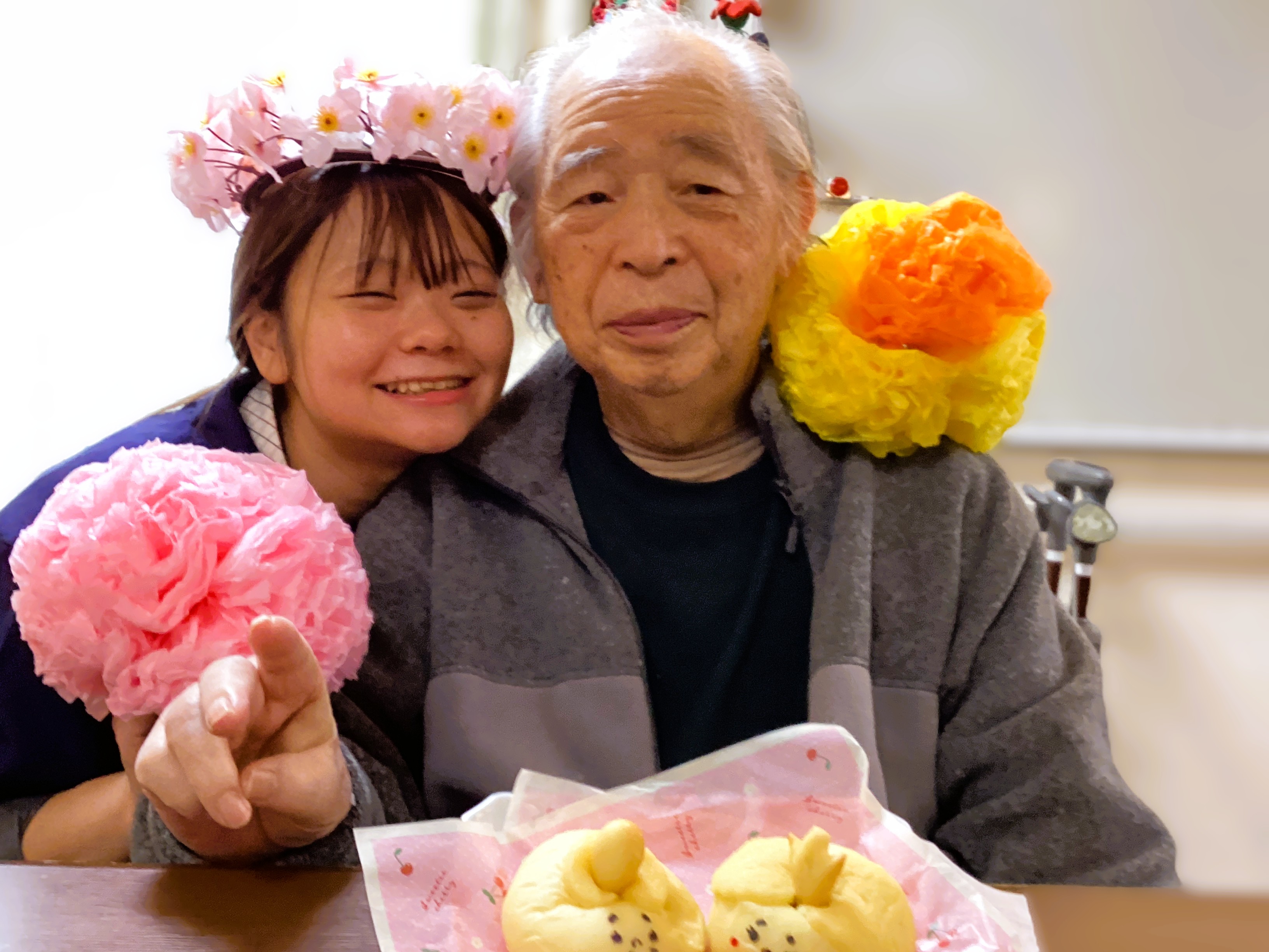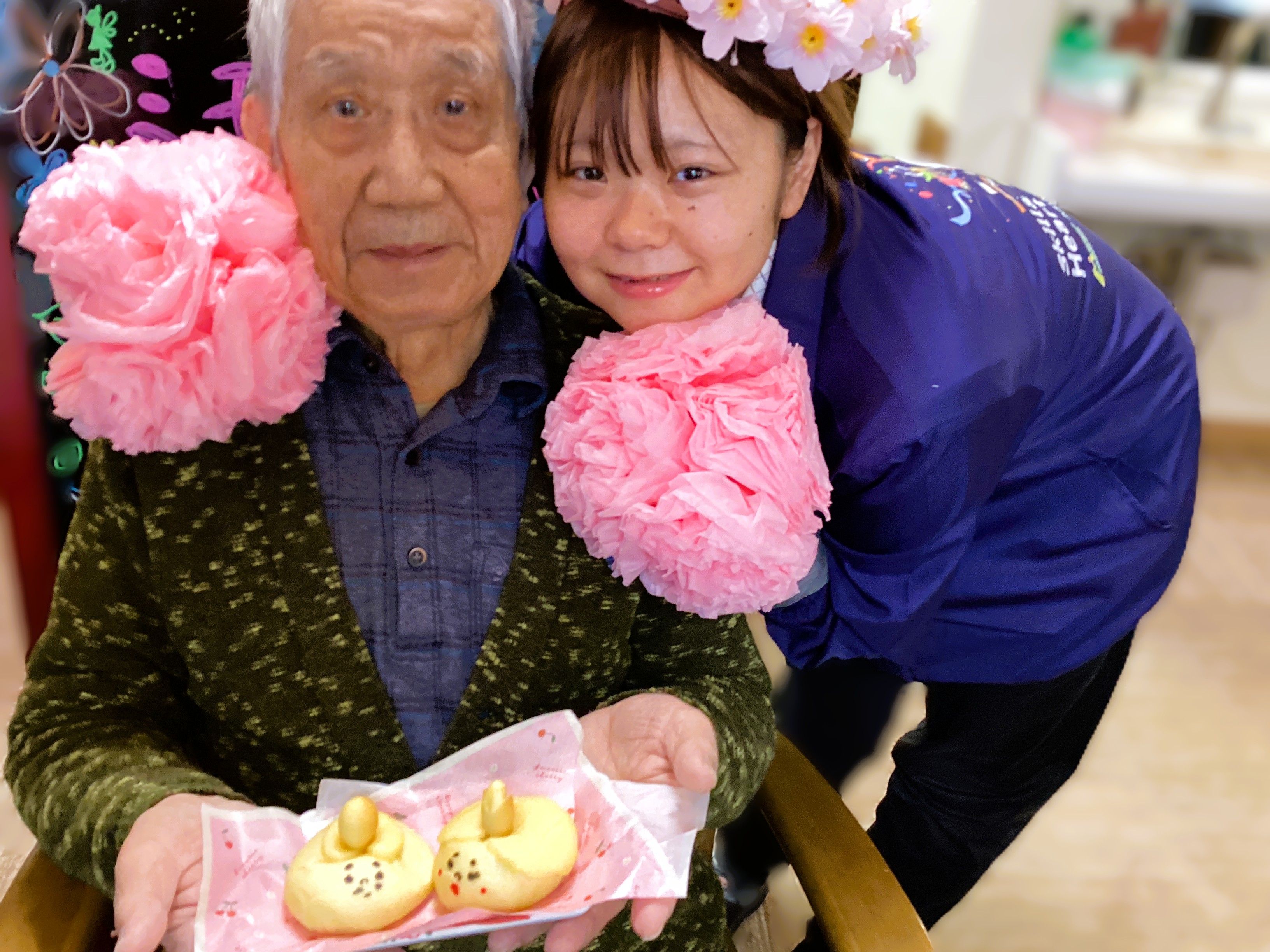 近所のパン屋さんの雛祭りパンでパシャリ!💛 利用者様の笑顔が桃の花の様💛 パンになっちゃったお内裏様とお雛様、これからどうなっちゃうの~!( ´∀` ) わくわくの雛祭りだ~💛