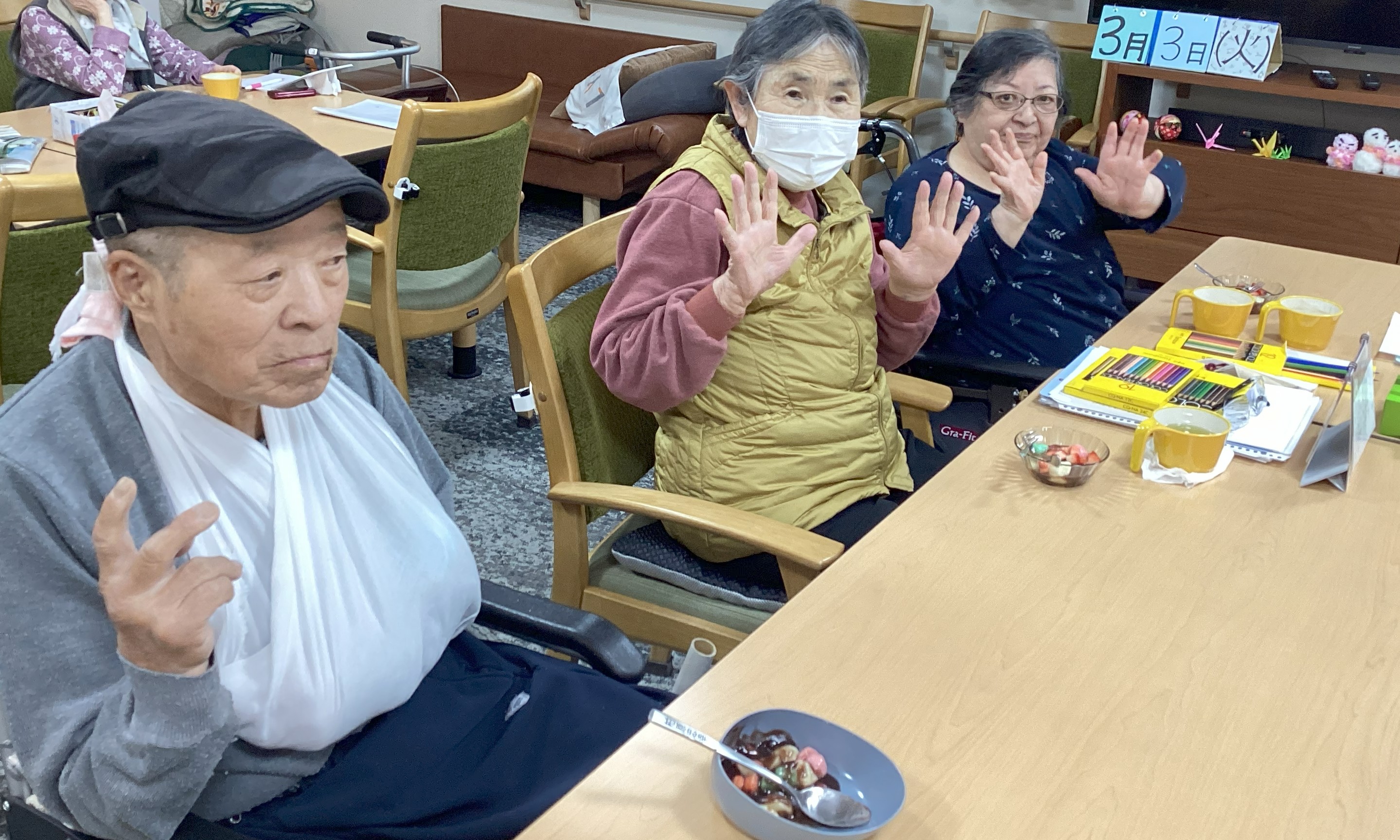 本日はひな祭りとのことで、おやつにお豆腐で作る三色団子をご利用者様と作り、歌をうたった後に、皆さんで食べて頂きました! 「とっても美味しい」「また作って」と喜んでいただきました。ひな祭りを楽しく感じてもらいました。