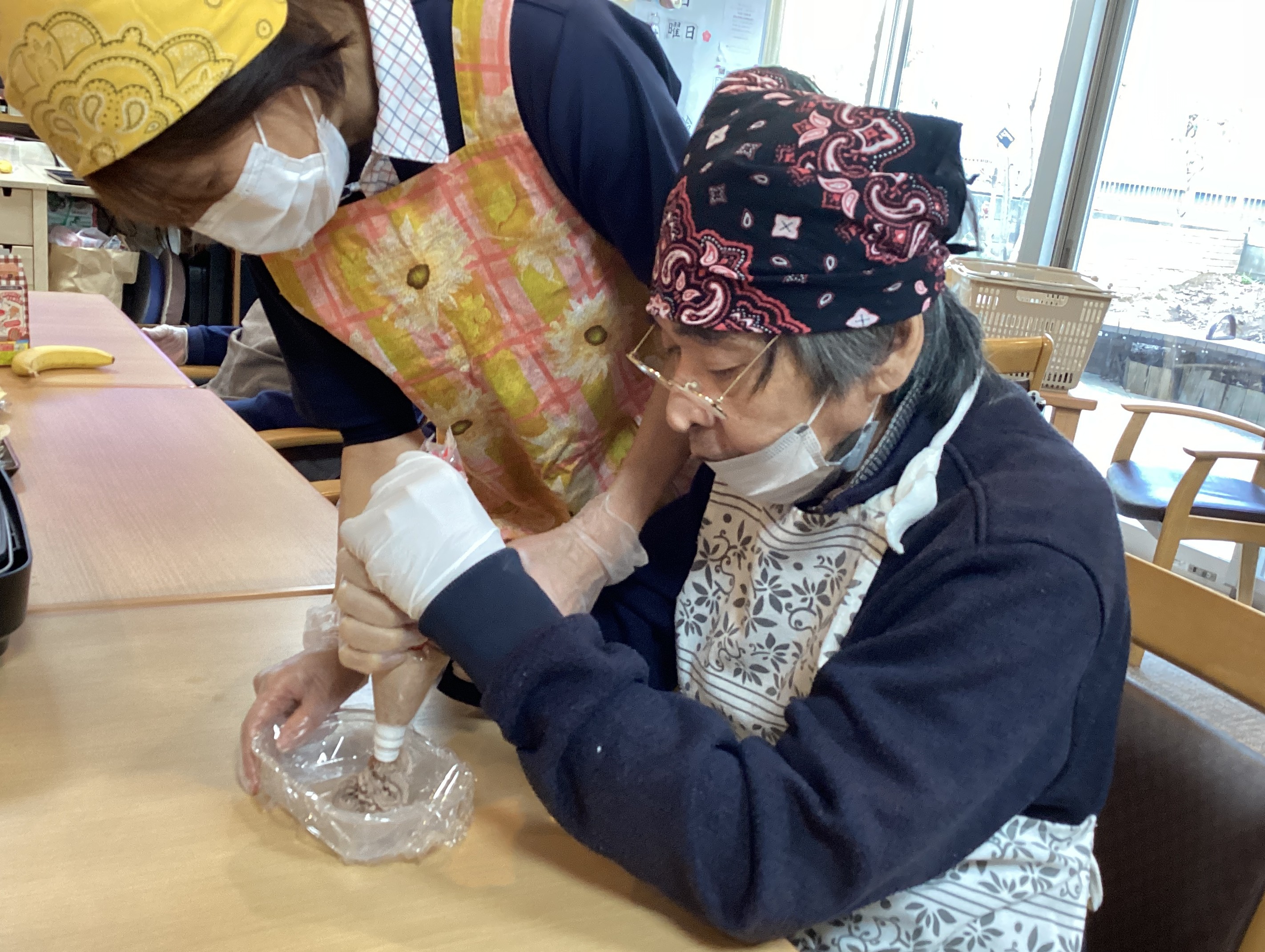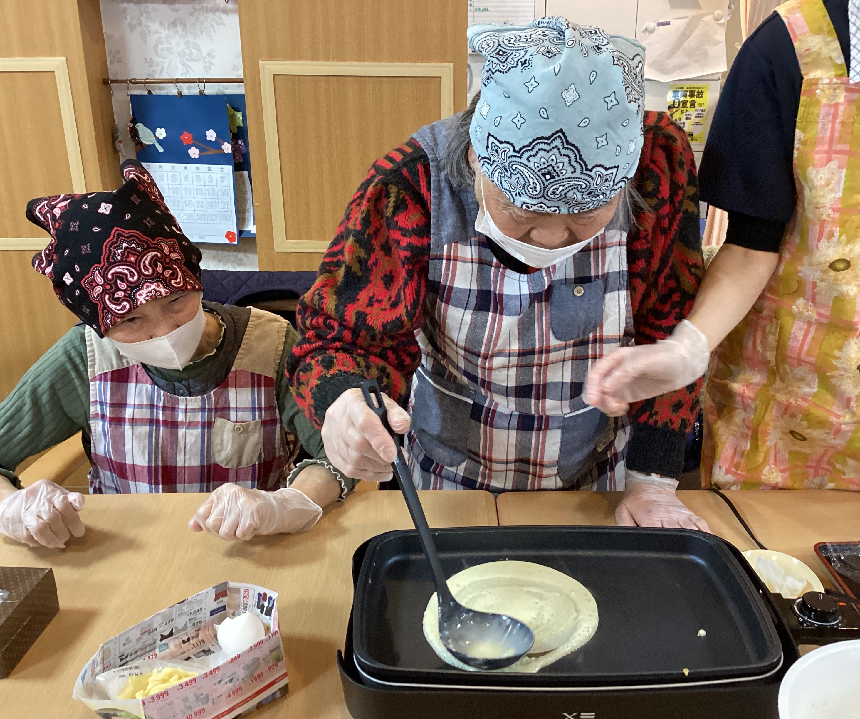 2月のおやつレクは「ミルクレープ」を作りました!! ホットケーキミックスでうすーく生地を伸ばして、生クリームと層にして作りました☆ イチゴ味・チョコレート味と生クリームは毎回違う味でした☺