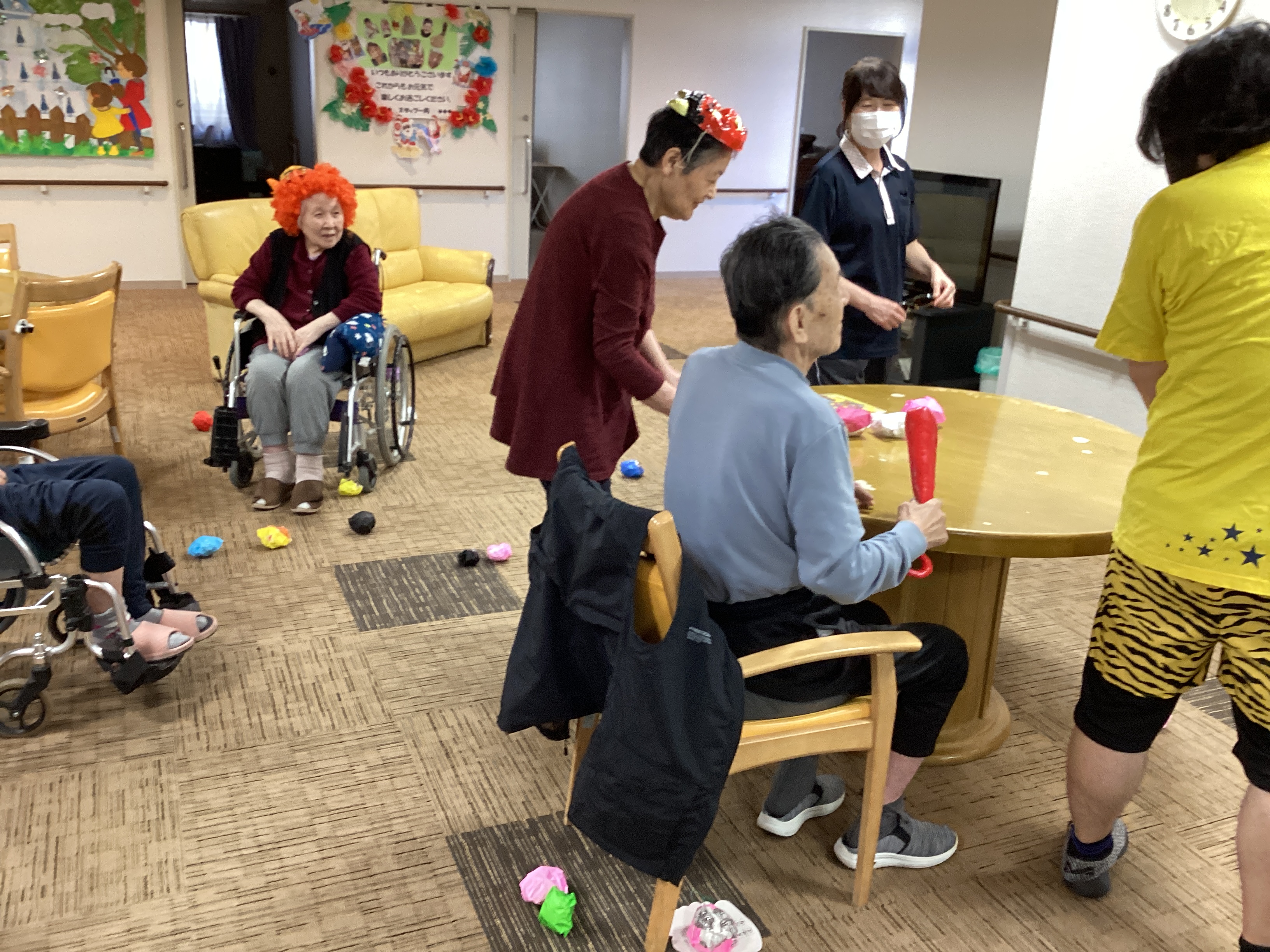 新聞と折紙で作った大きな豆で豆まきを楽しみました。 大きな声で、鬼は~外、福は~内 (^0^)