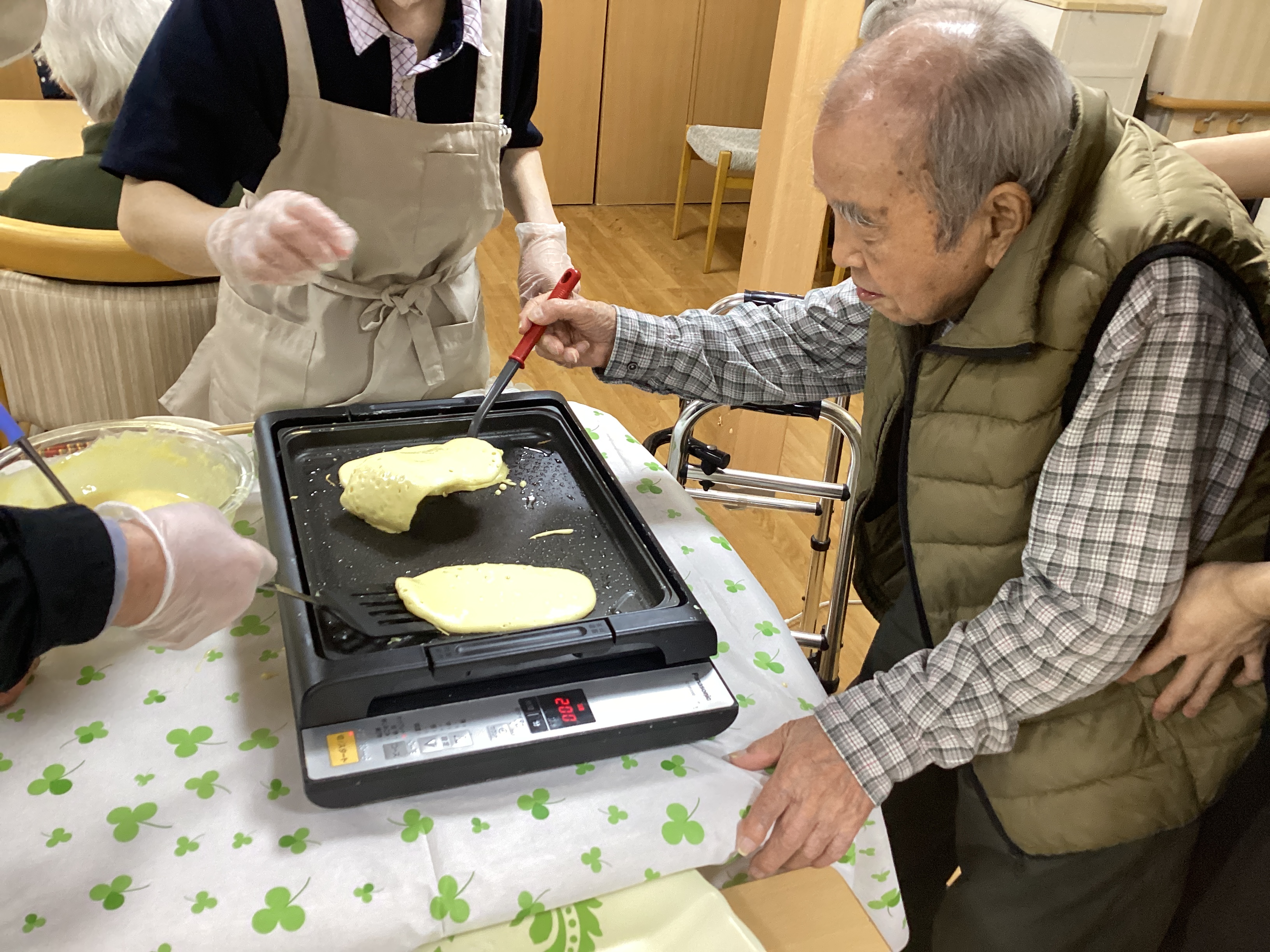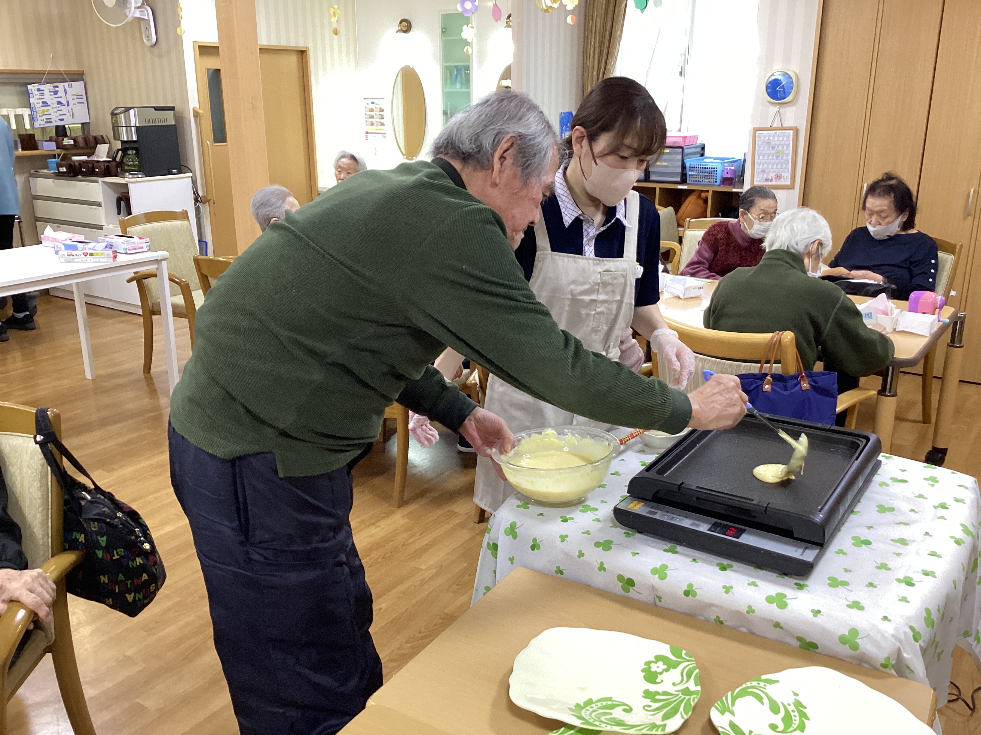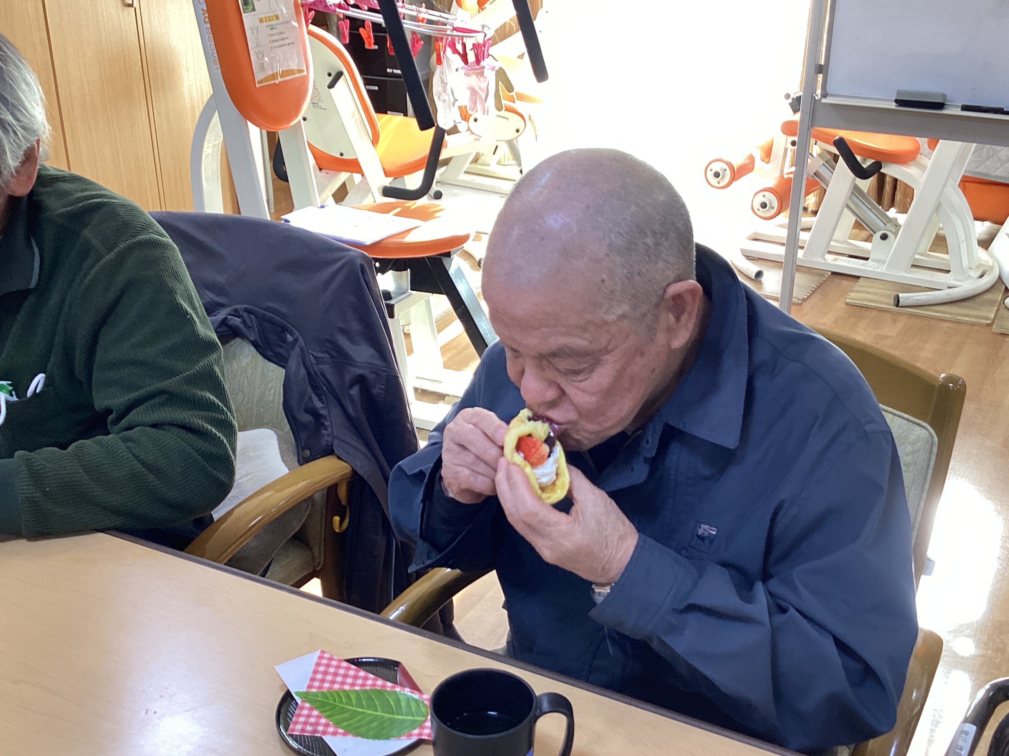 3月4日におやつレクを開催し、皆さんでロールどら焼きを作りました! 巻いた生地をに生クリームとあんこを入れ、果物をトッピングして完成です! 皆さん美味しそうに召し上がりました😊