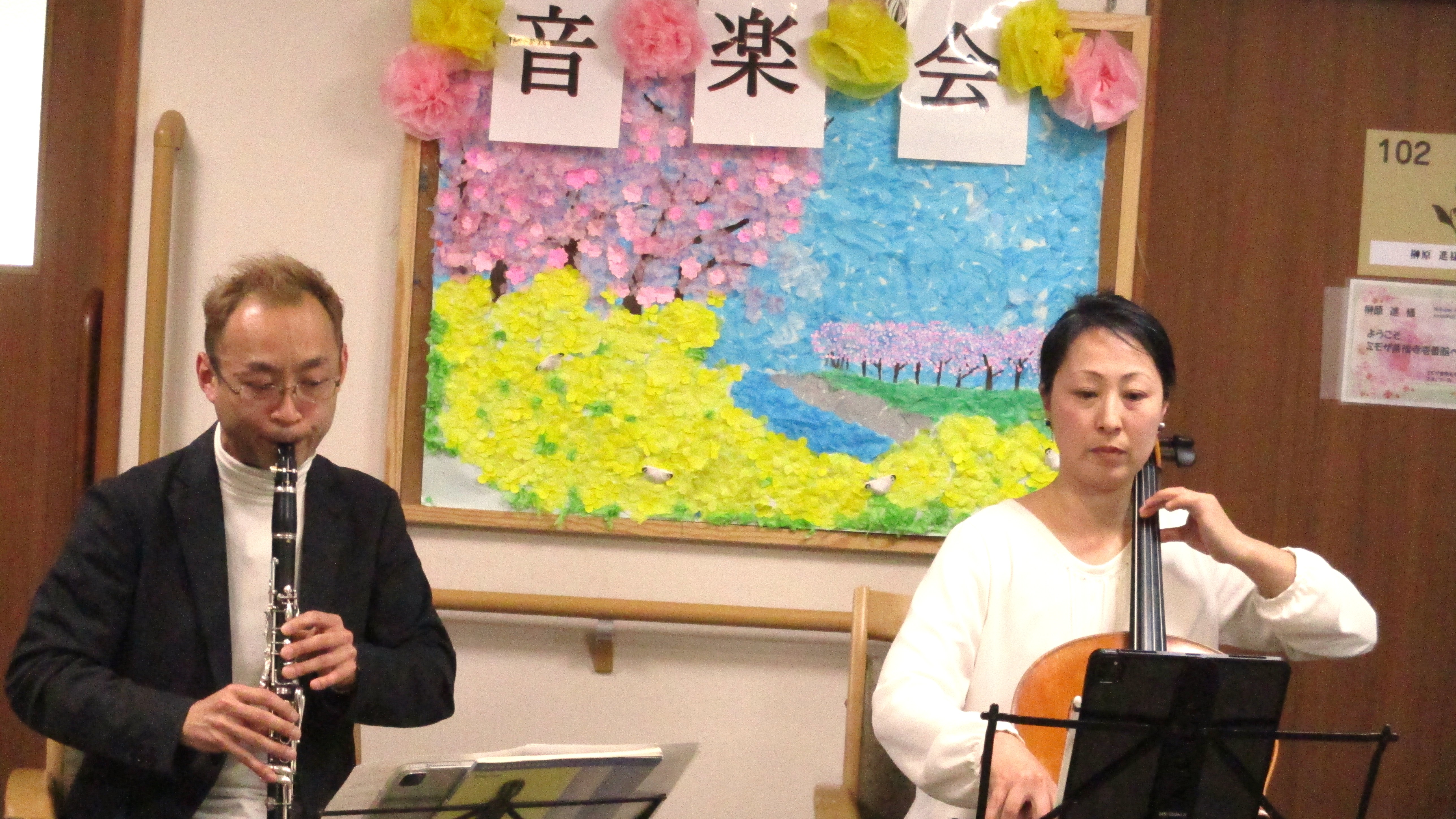 今回入居の家族の方の紹介にてクラシックの音楽会を開きました。クラリネット、チェロ、尺八の素敵な合奏で皆さんうっとりと聞きほれていました☺