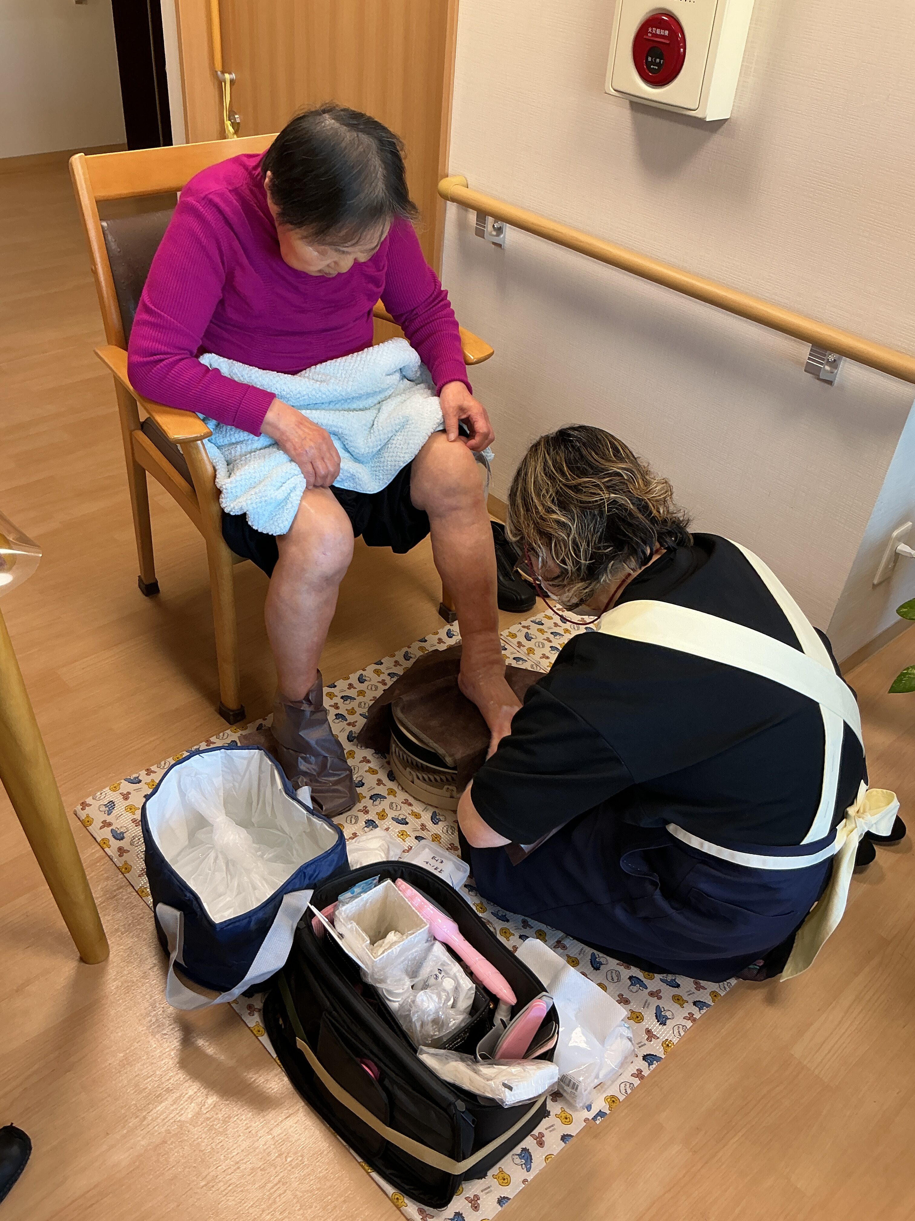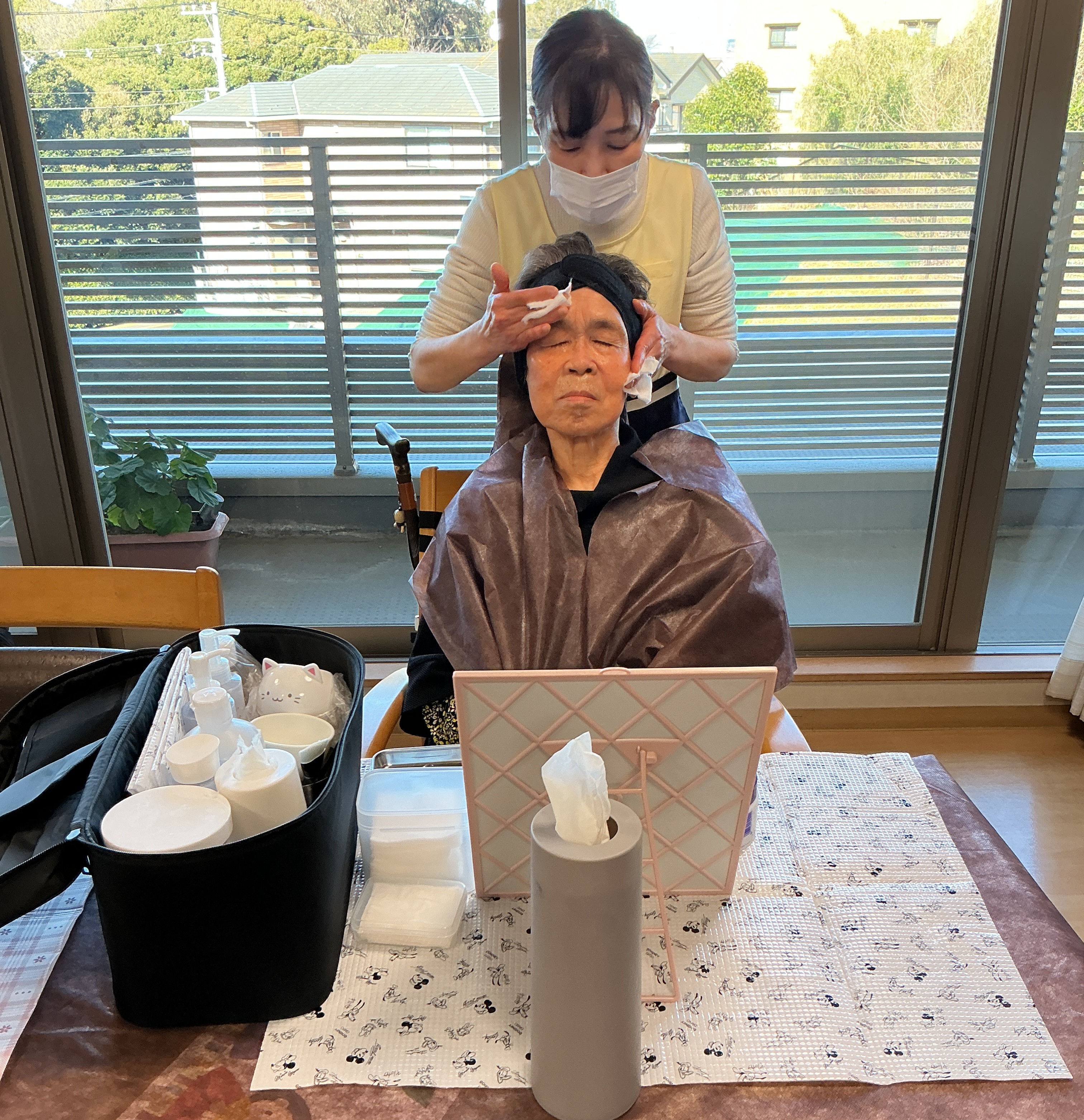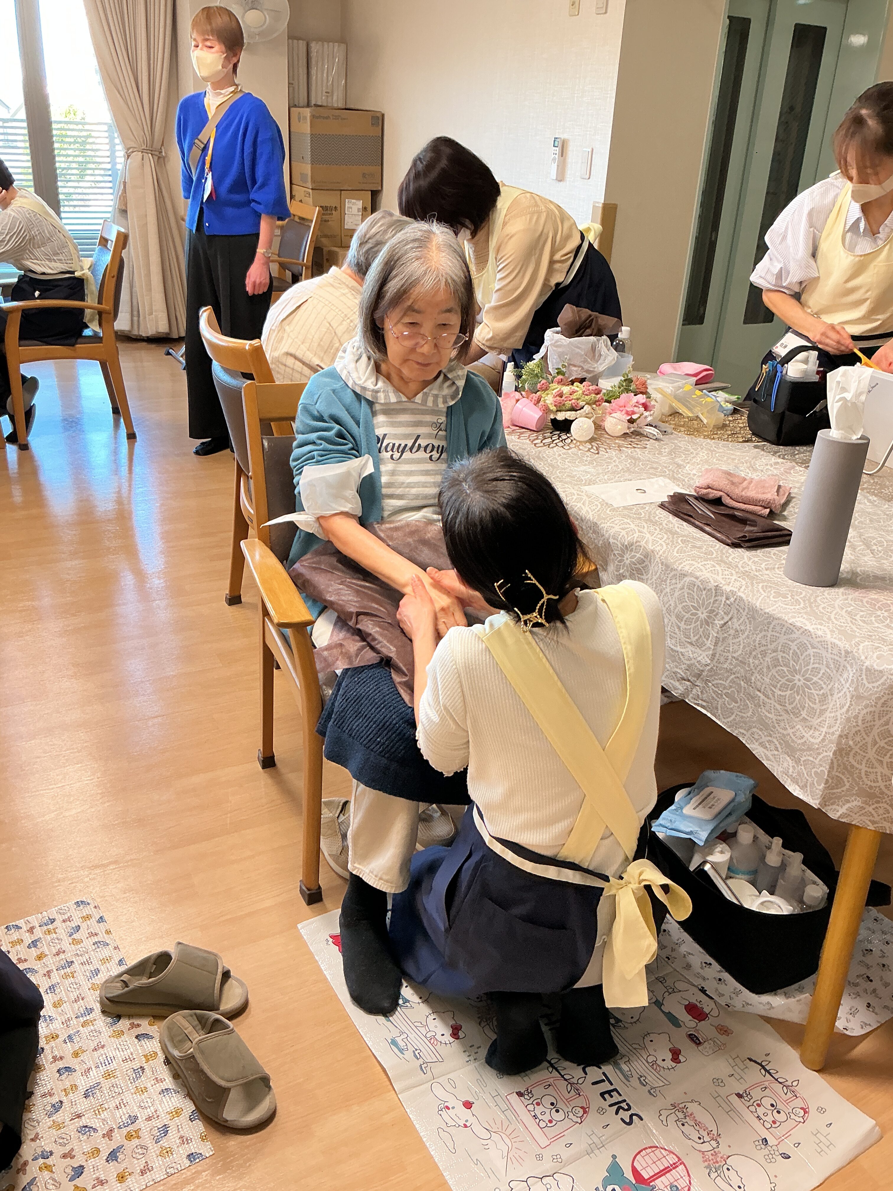 美容学校主催の美容レク。 フェイス、ハンドマッサージ、フットマッサージを楽しみながら施術を受けていました。