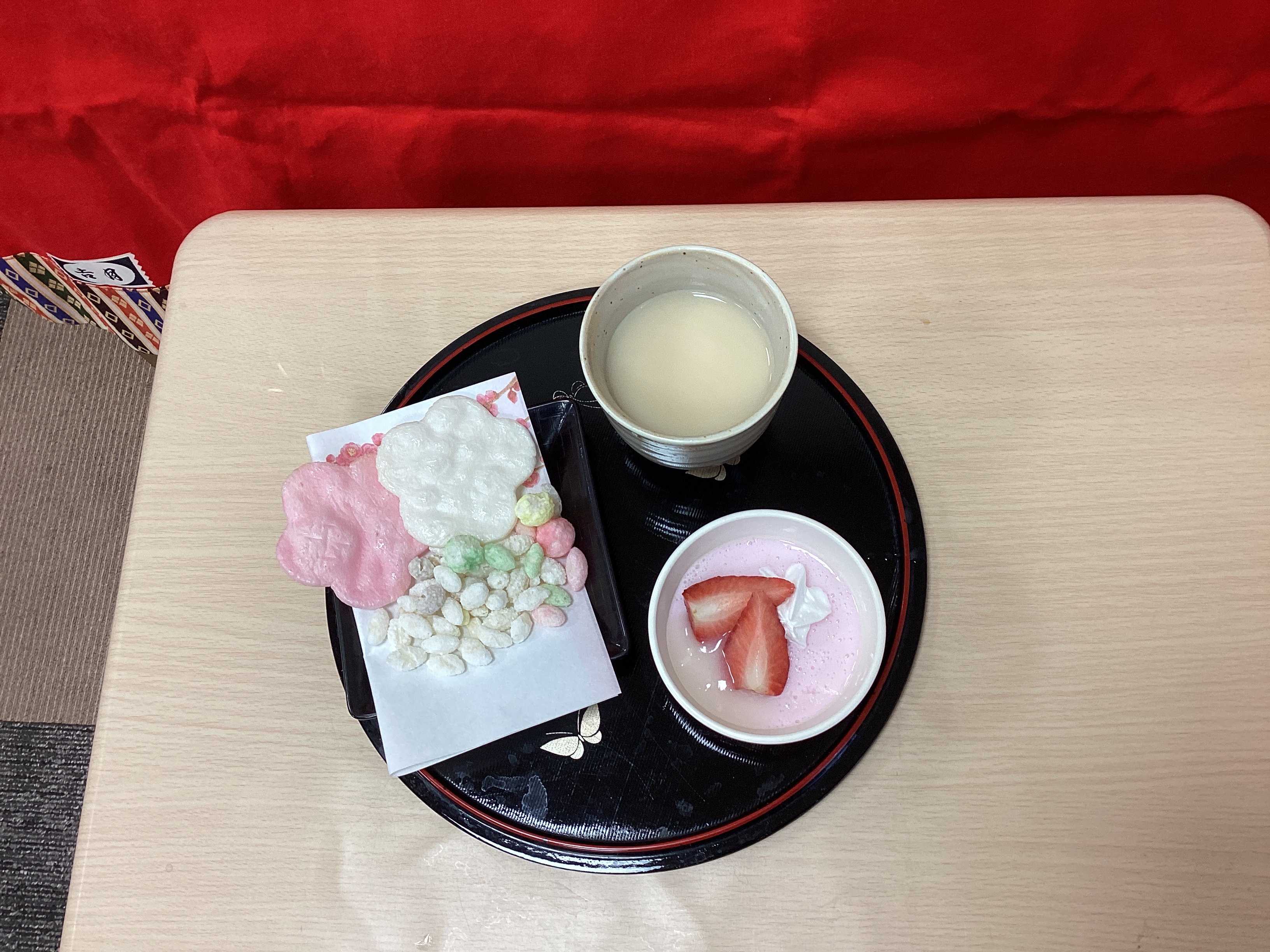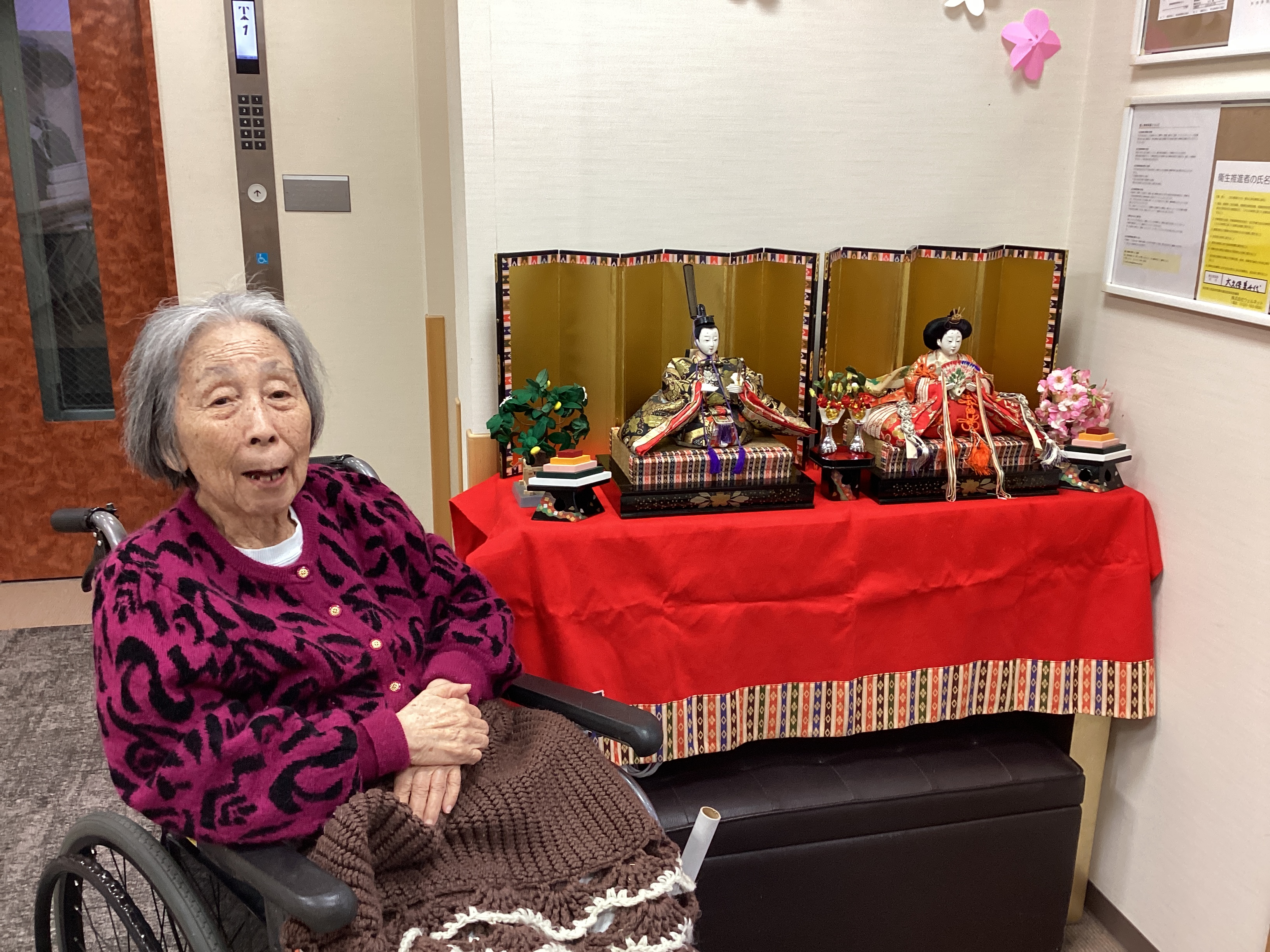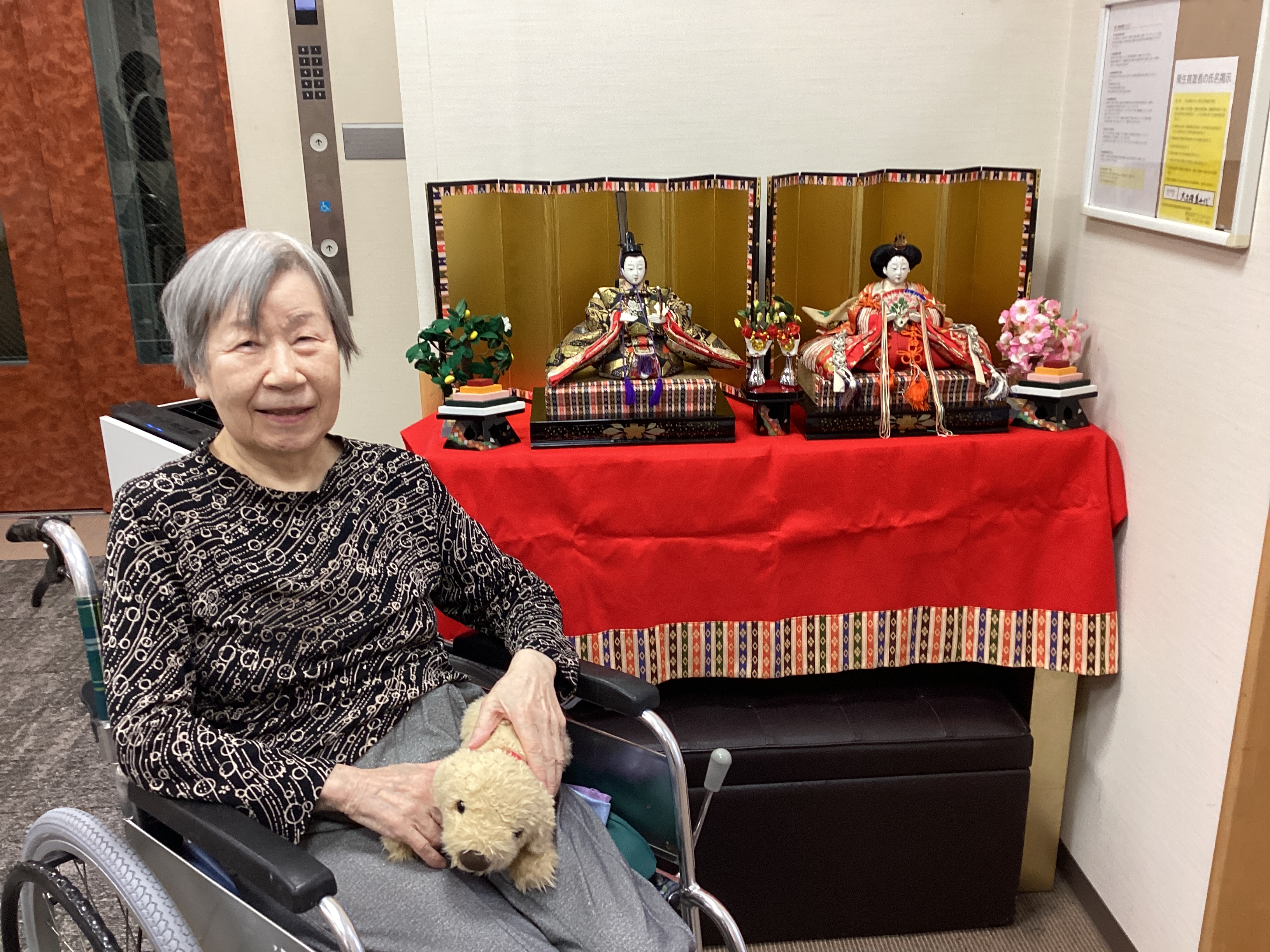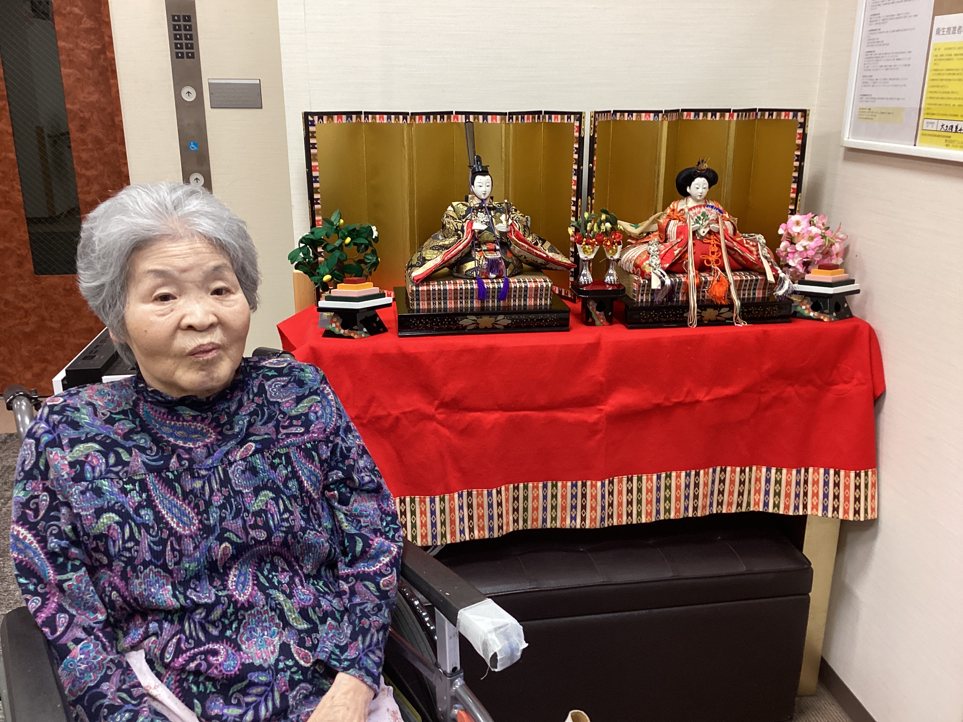 昭和時代の懐かしさを感じさせる人形の顔にご利用者も嬉しそうに、また、ご自身の雛人形の話を思い出されて昔話に花が咲きました🌸
