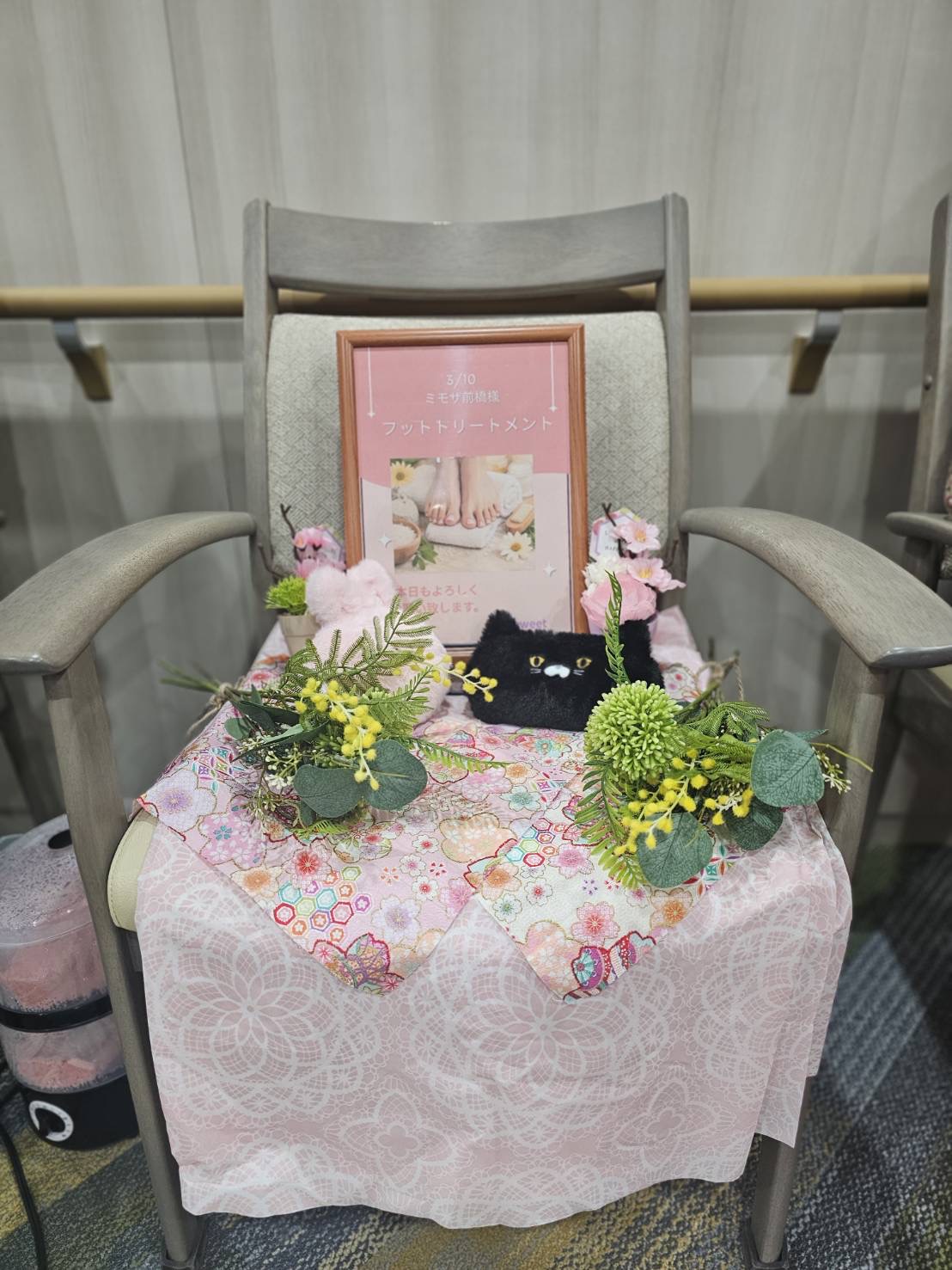 ミモザ前橋では月2回の美容レクリエーションがあります。 今月はアロマフットマッサージ♪施設内、アロマの良い香りに包まれ、利用者様はマッサージに癒されていました。