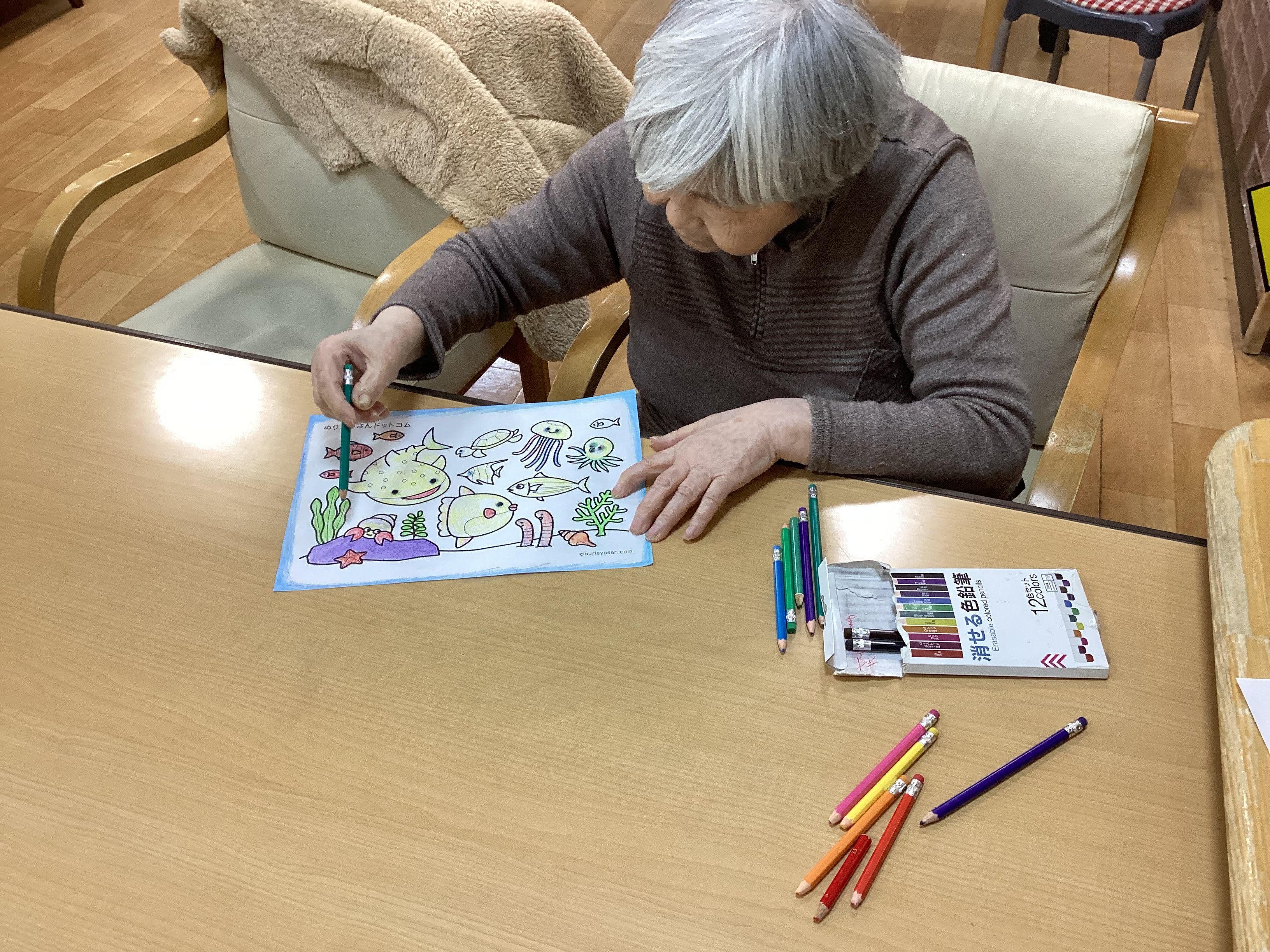 デイサービス合同の音楽療法のご様子と塗り絵がお上手な利用者様の日常のご様子です(^^♪ 3月はひな祭りとお誕生日会が2回ございます!(^^)! ひな祭りはちらし寿司弁当を召し上がり皆様「綺麗だね!美味しい」と喜ばれておりました( *´艸`)