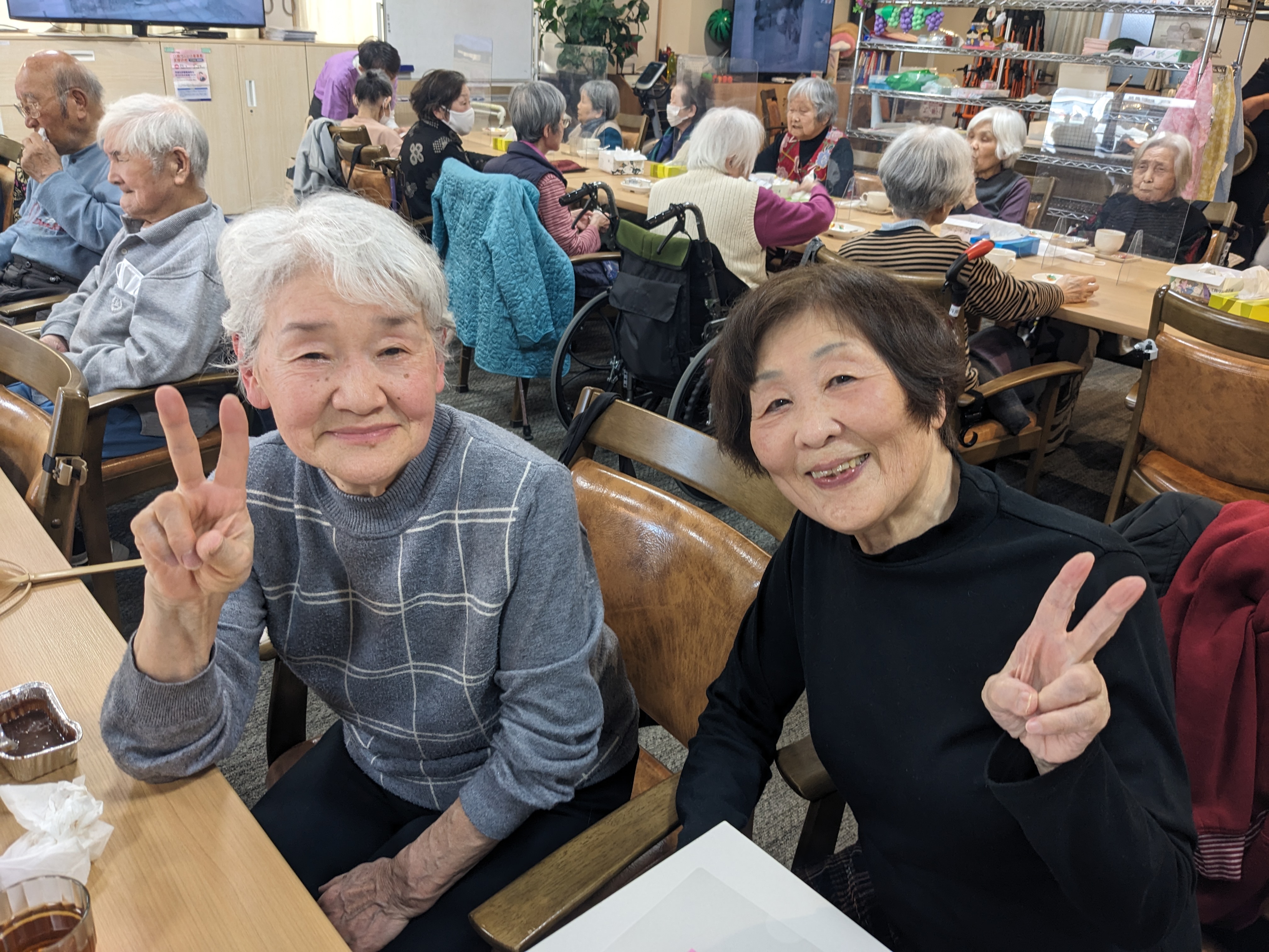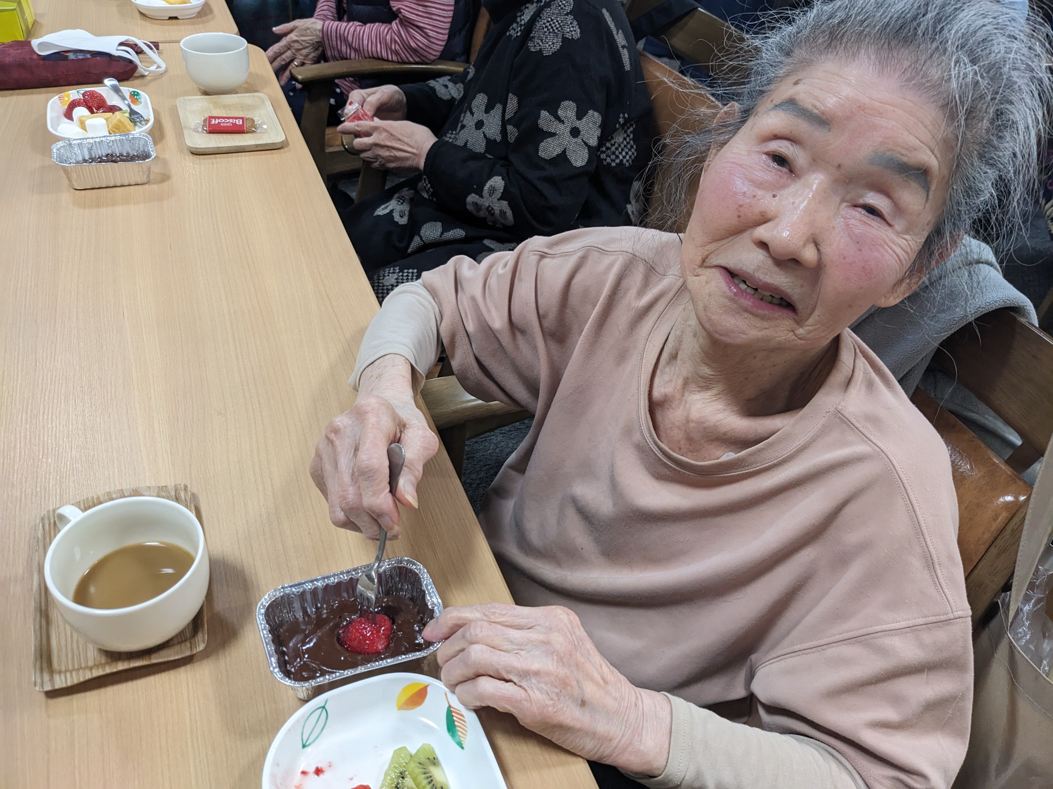 2月といえばバレンタイン🍫 チョコレートフォンデュをしました。 具材はイチゴ、キウイ、マシュマロ、バウムクーヘンを用意しました♪