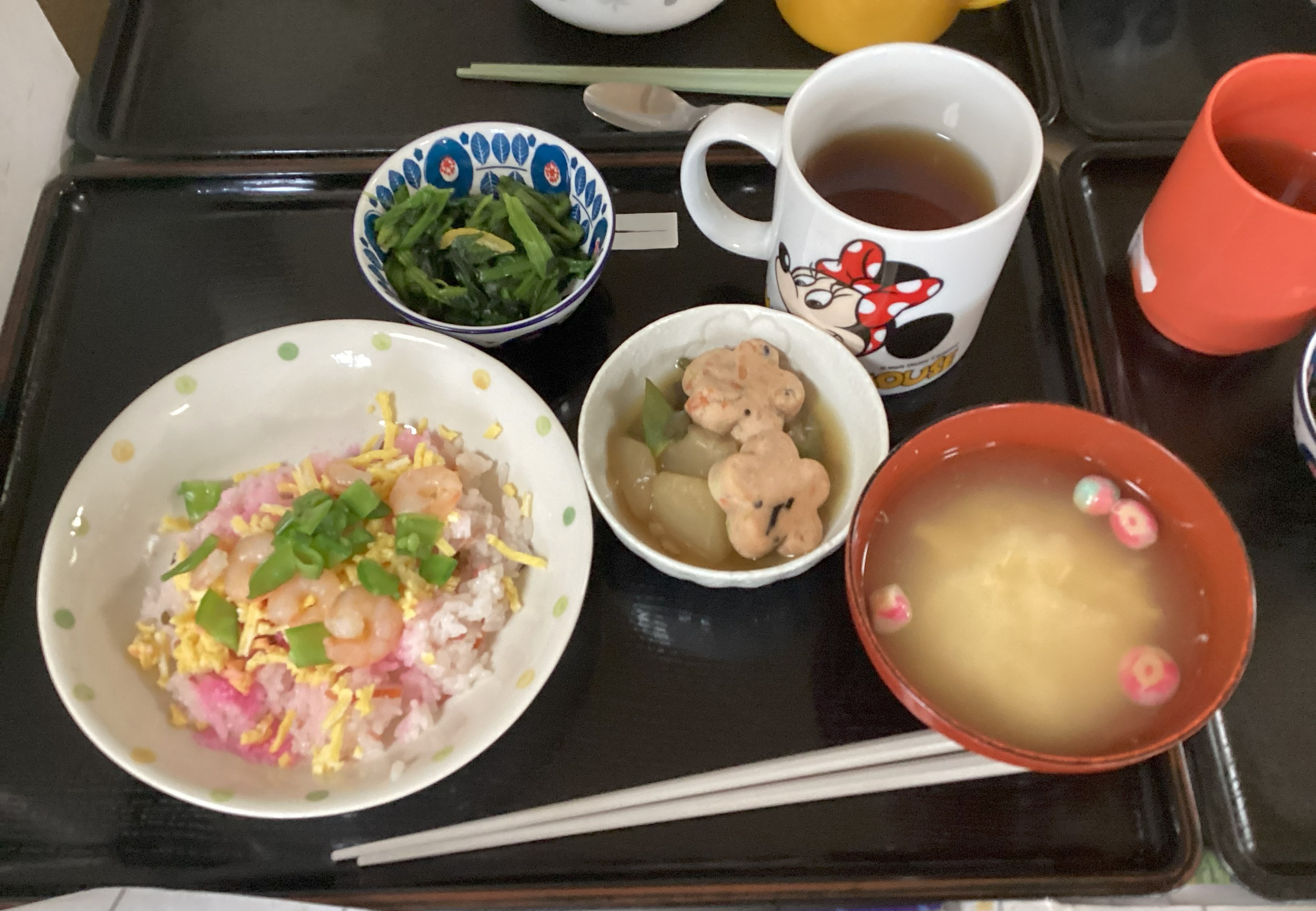 3月3日にひな祭りのイベントを開催しました🎎 お昼にちらし寿司、おやつに桃饅頭をいただき、普段と違うメニューに喜んでくださいました。
