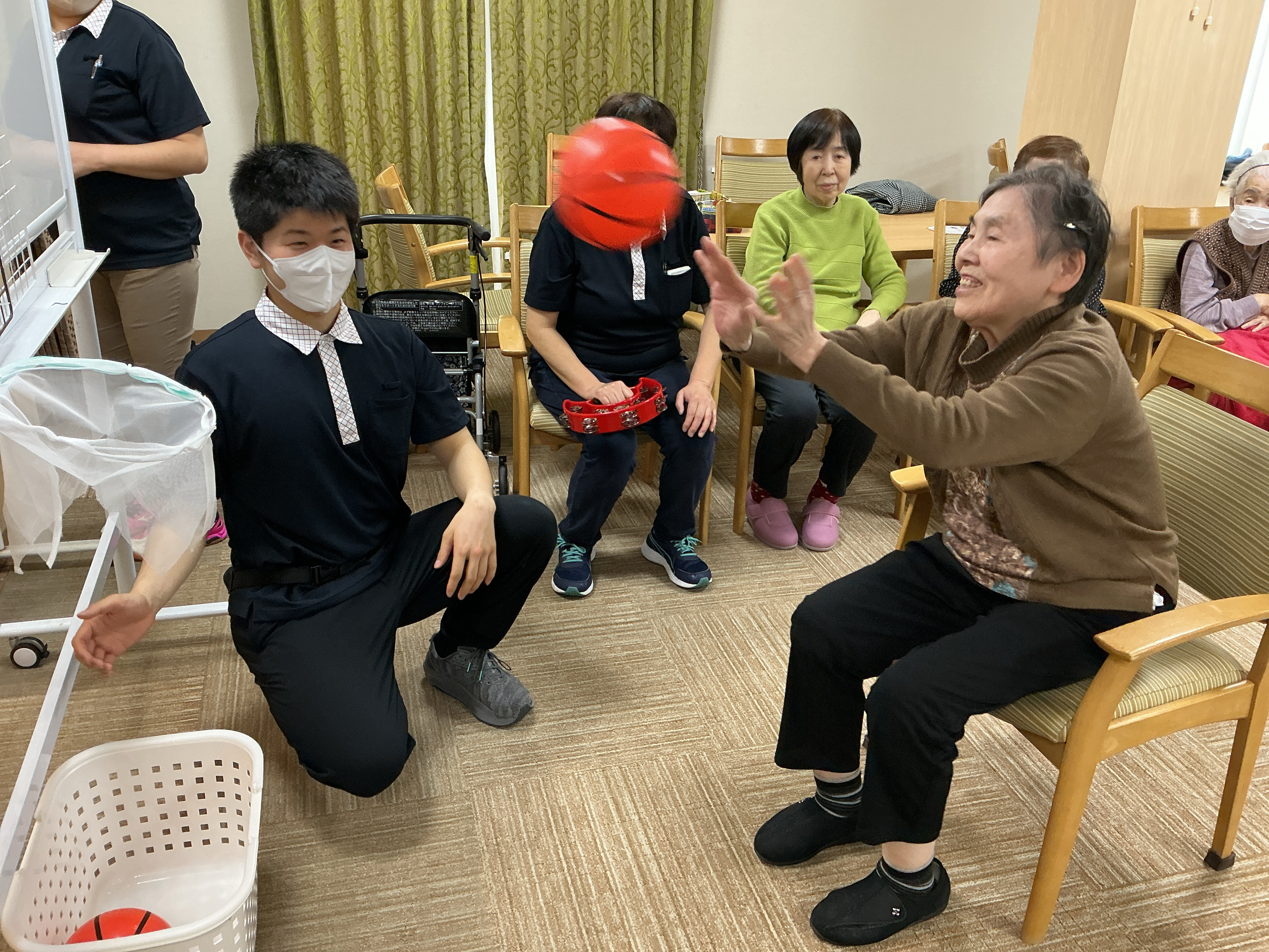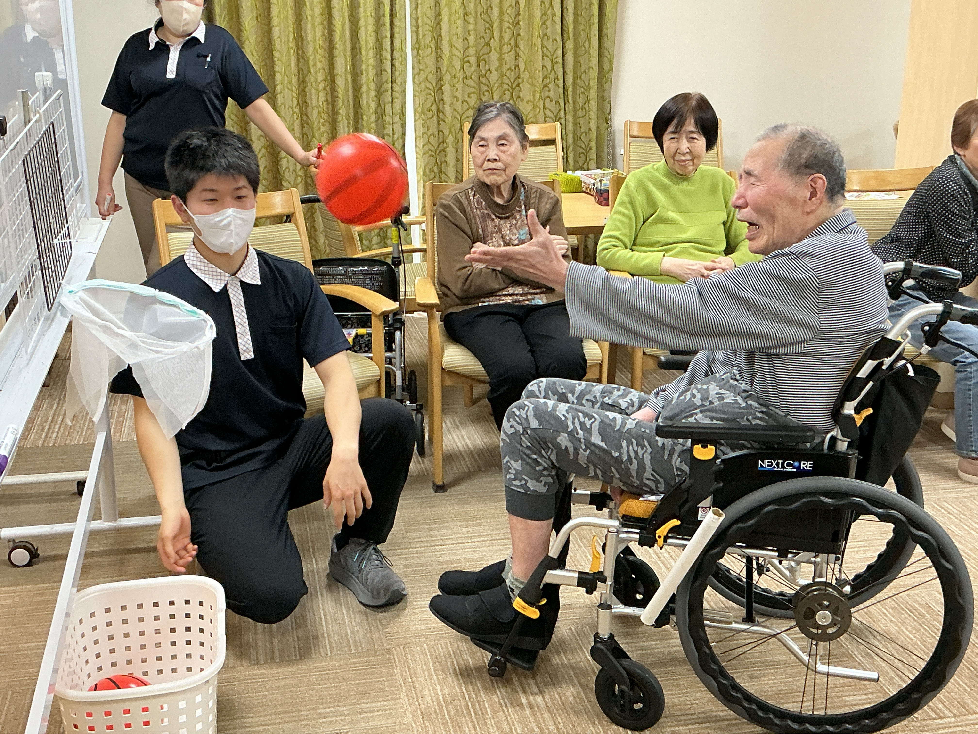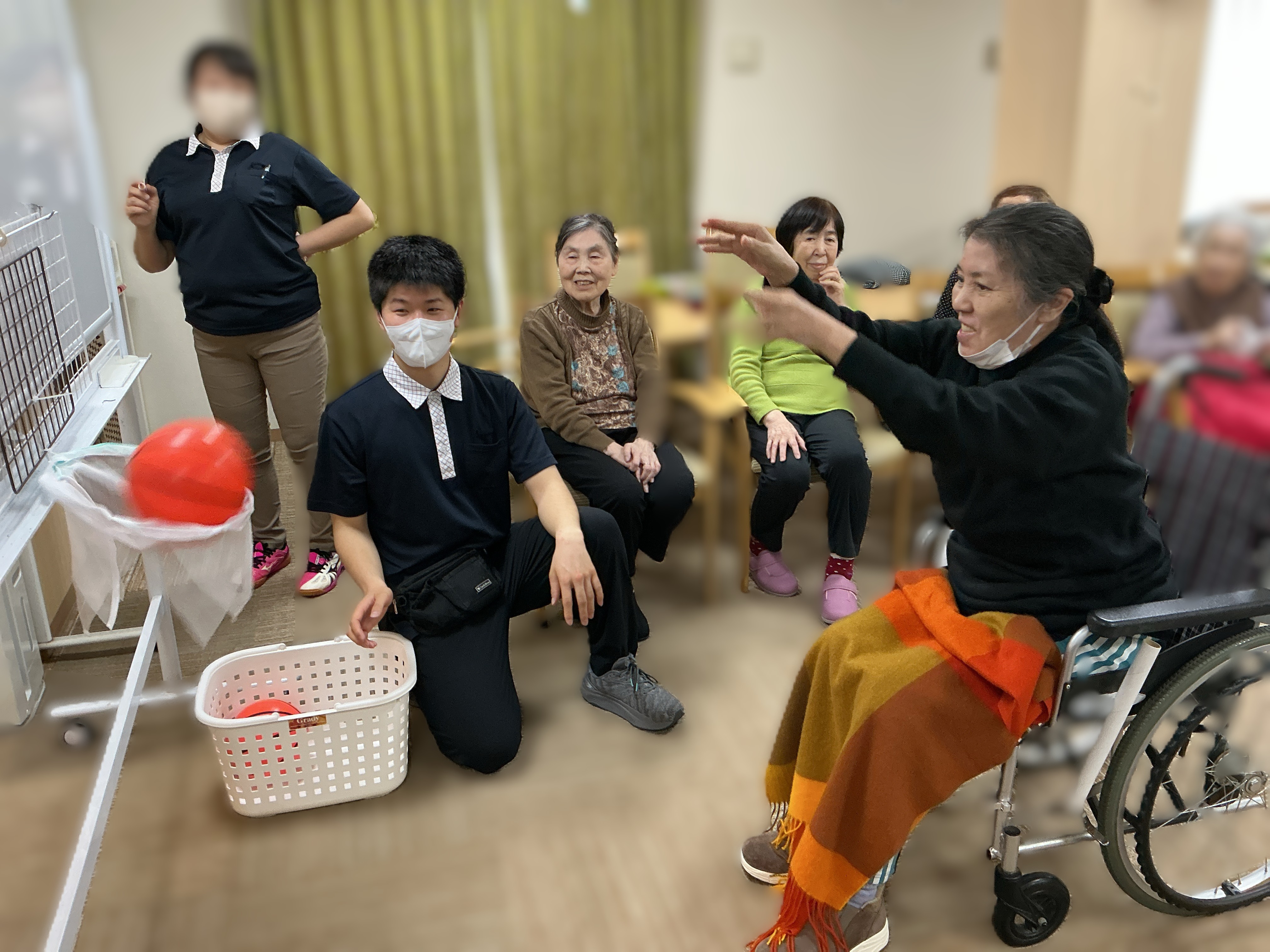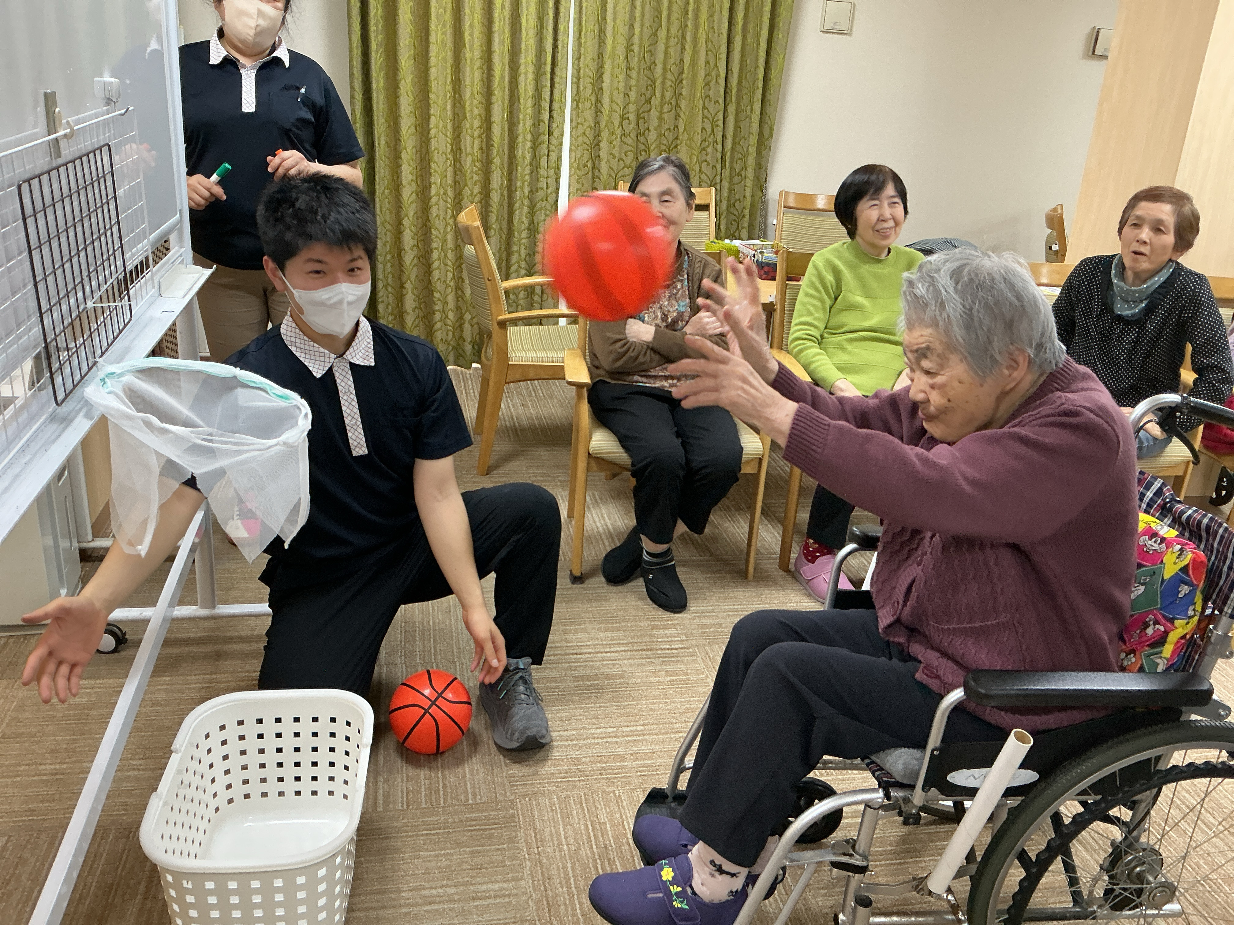 今回のレクはバスケットボールのシュートを皆さんでやりました! ハンガーに洗濯ネットをかぶせ、磁石でボードにくっつけています🧲 5回投げたのですが、皆さん0点の方がいなくとてもお上手でした🙂 パーフェクトで全部入った方はとてもノリノリ~💃
