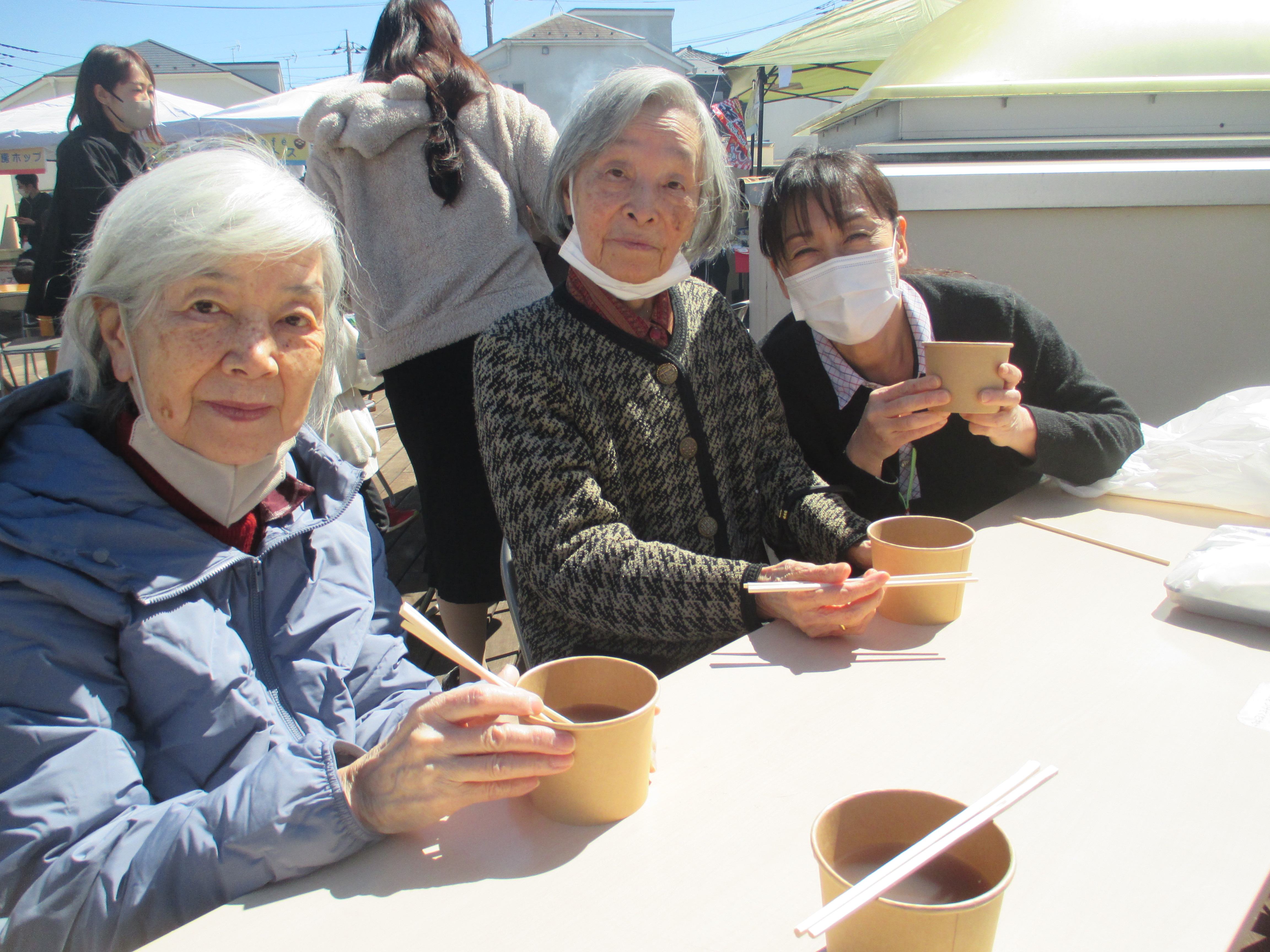 この日は地域ケアプラザのお祭りに利用者様と一緒に行ってきました。 お汁粉を食べたり、子供たちのチアリーディングのステージを鑑賞したり…. お天気も良くとても楽しい一日になりました。