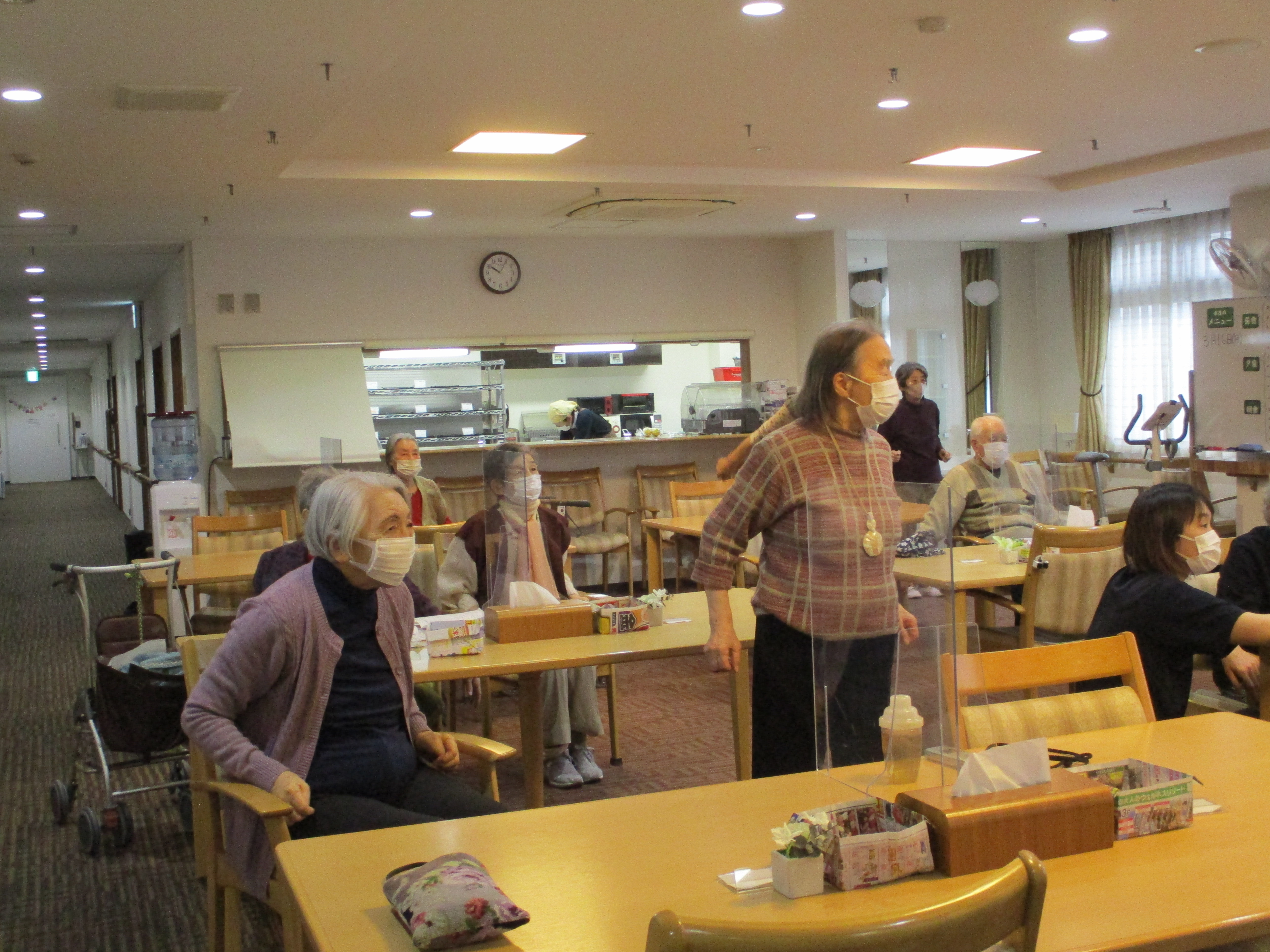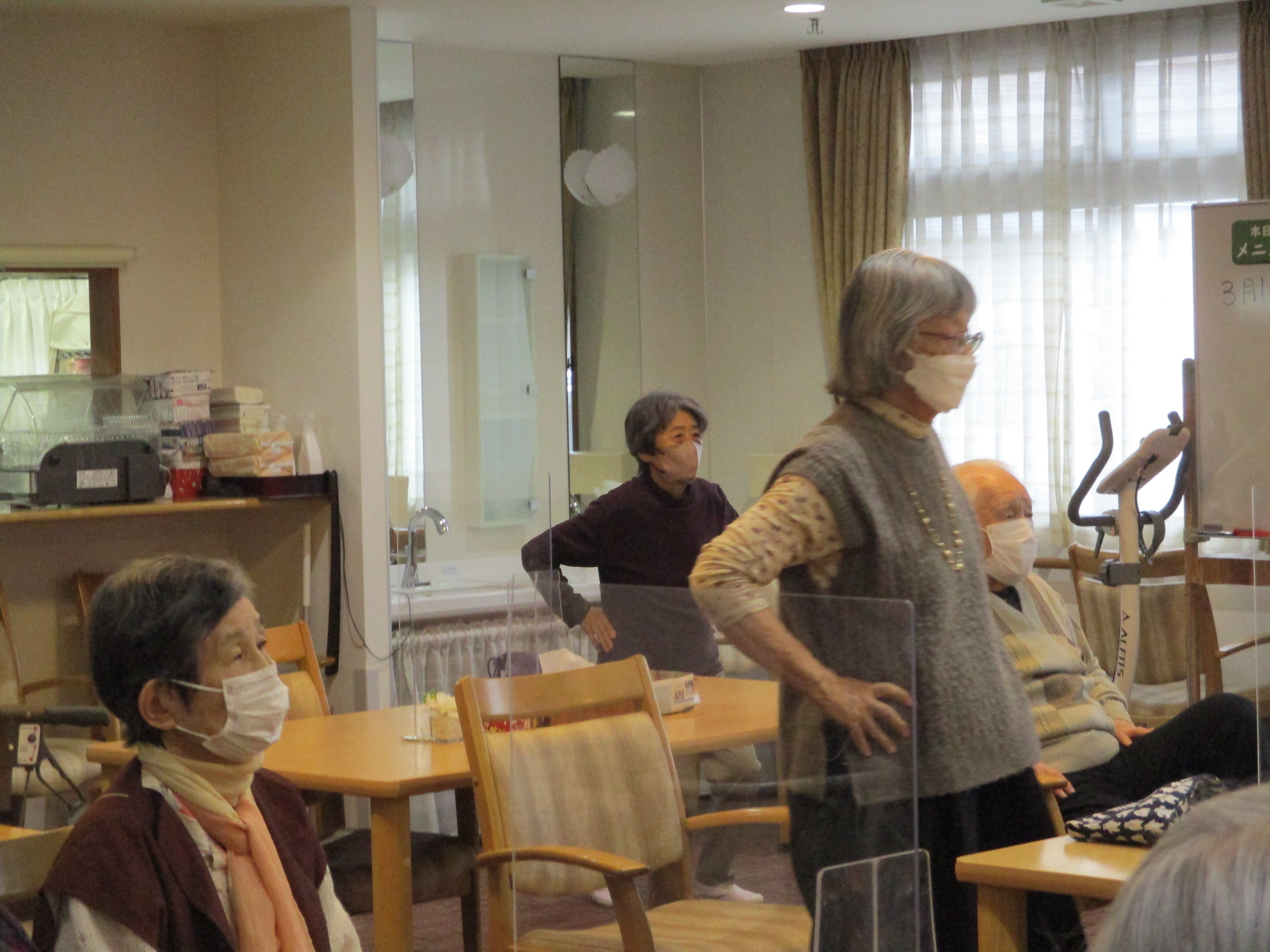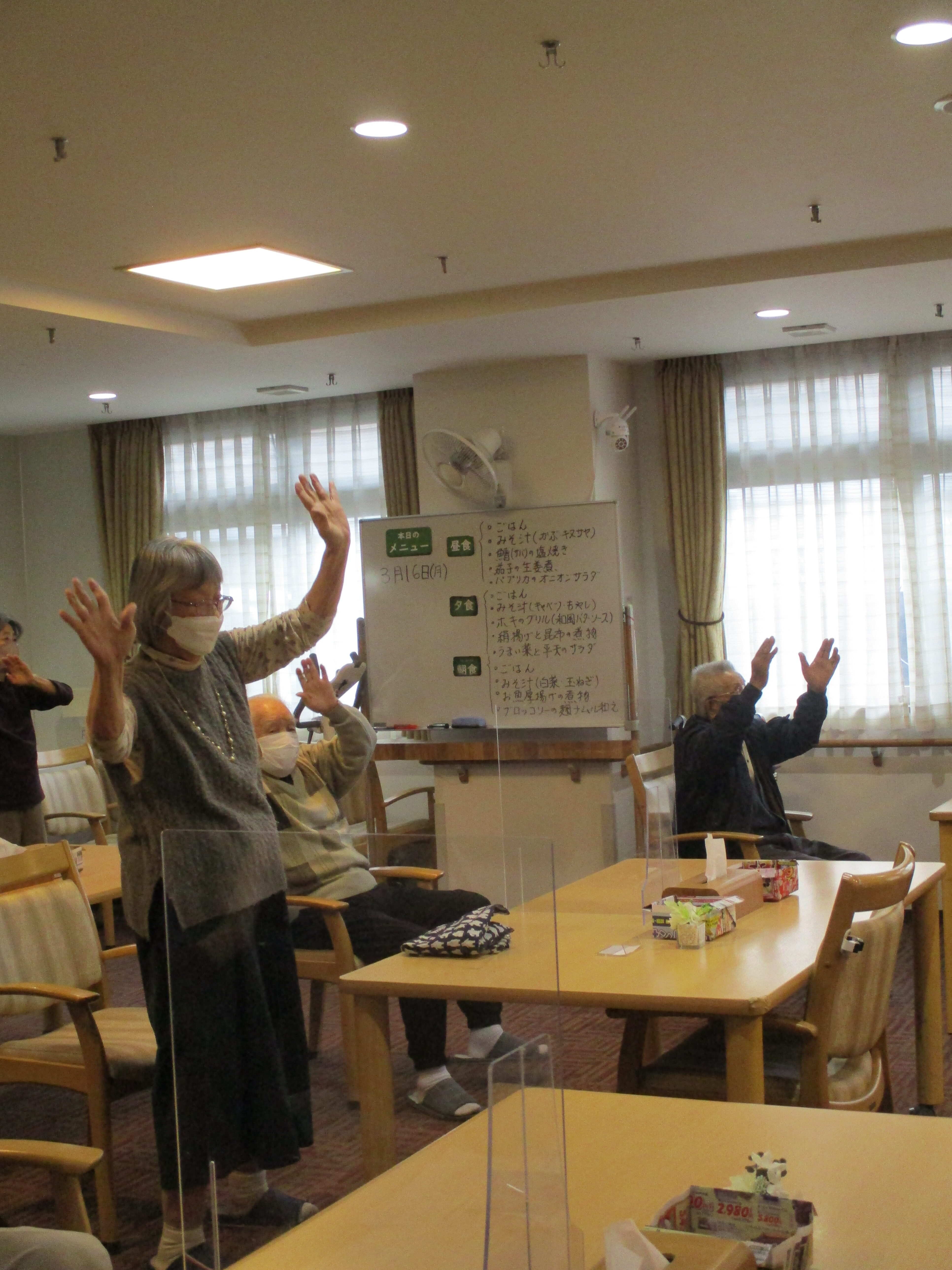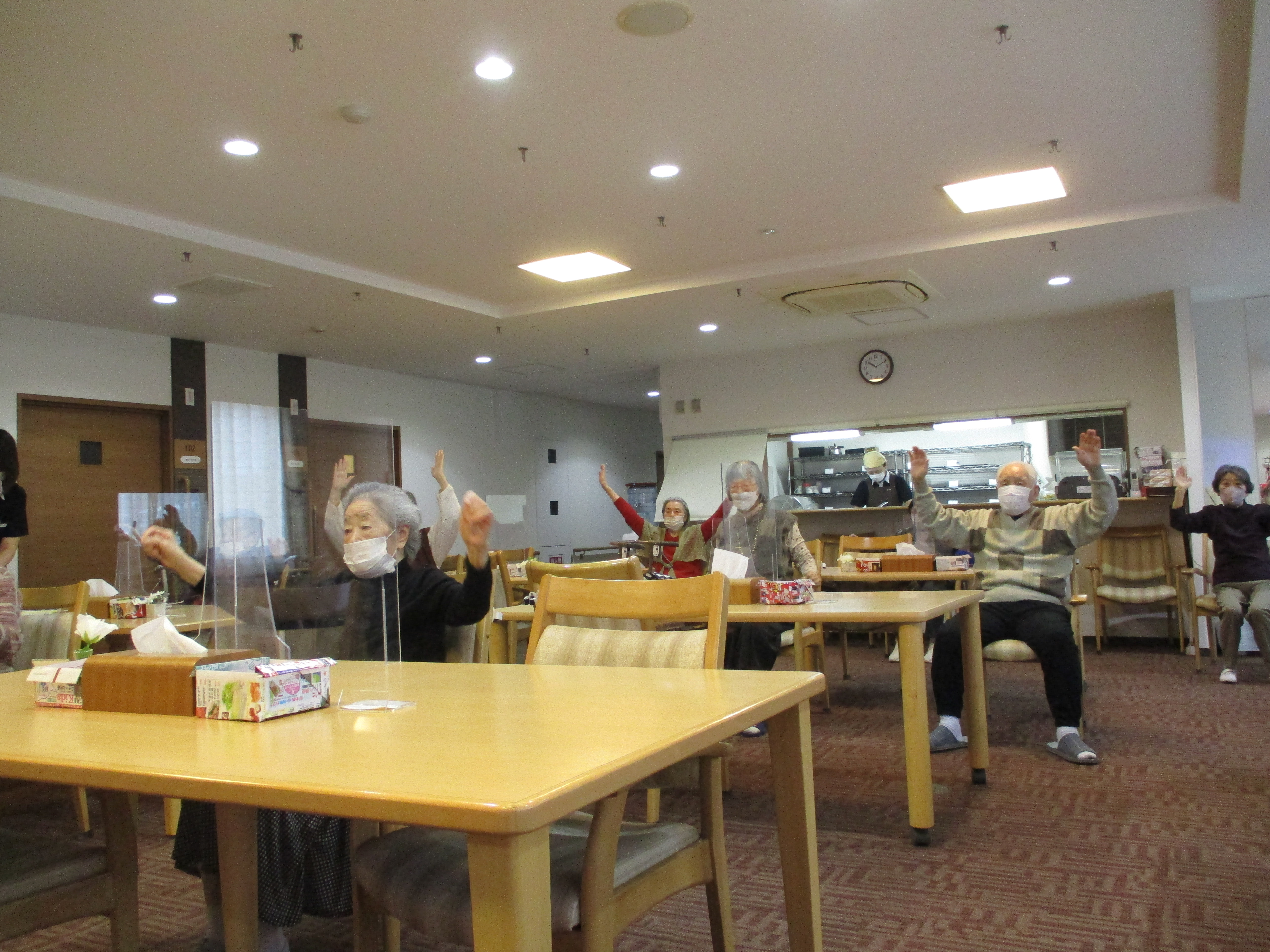 外は生憎の寒い雨ですが、今朝も皆さん元気に体操頑張ってます。