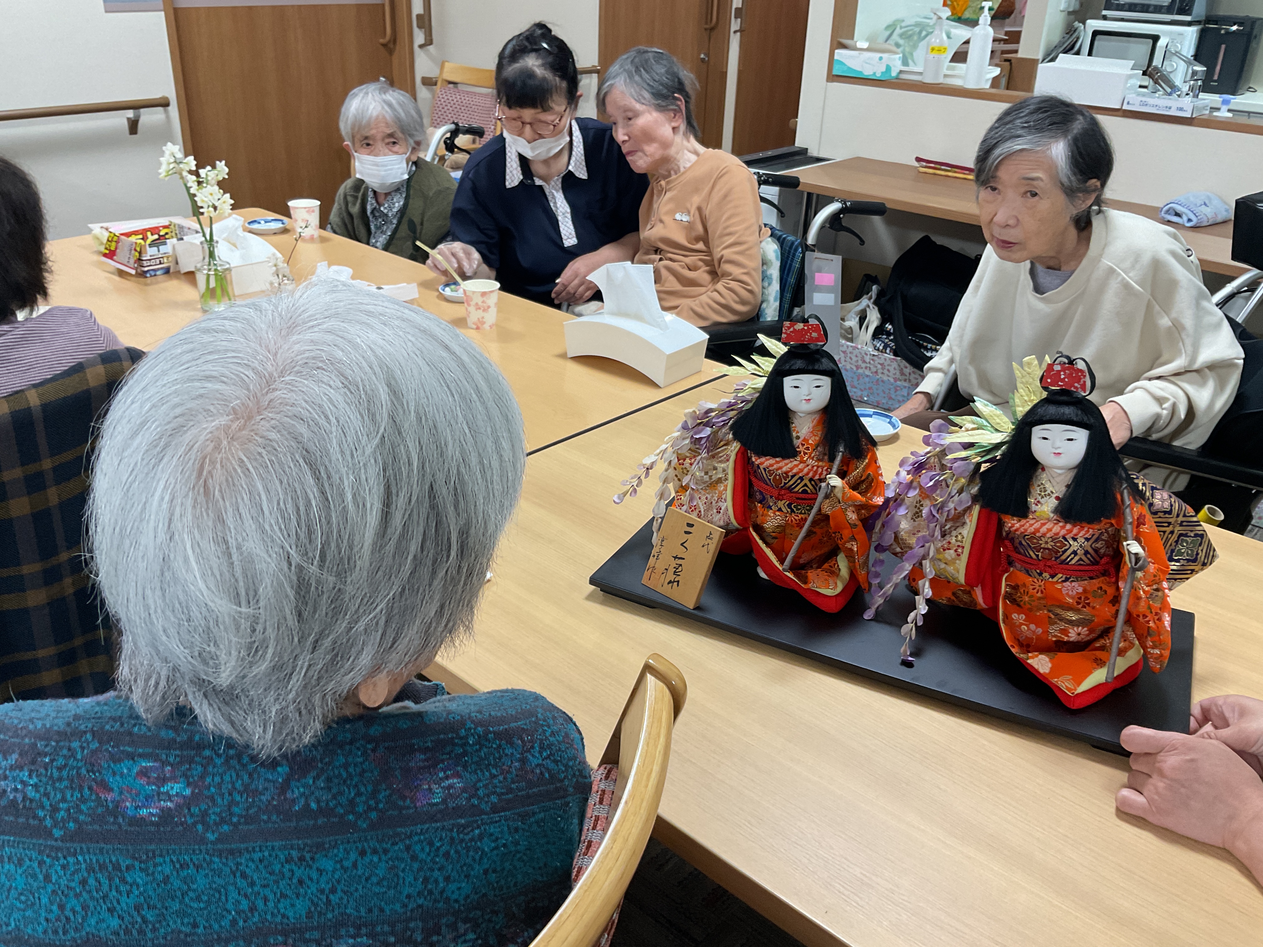 みなさんと一緒に春の歌をうたいお内裏様とお雛様になってもらいました。少し照れくさそうでしたがみなさんとてもお似合いでした😊✨おいしいおやつを食べながら日本人形を近くで観察しました🎎「かわいいね」「きれいだね」といろんな感想が聞こえました!