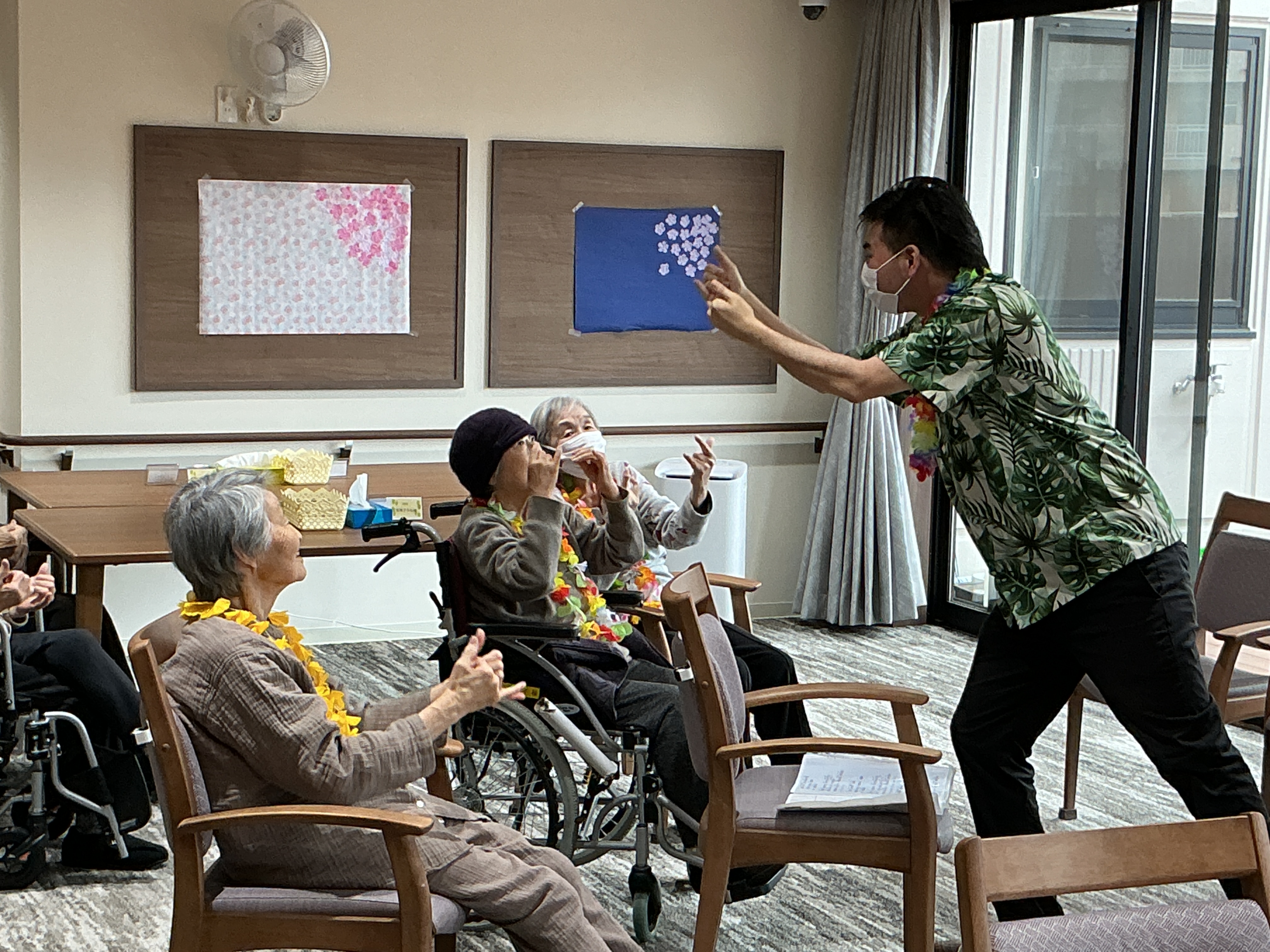 本日は、レクリエーションでフラダンスの先生が来て指導してくださりました。皆さんウクレレの伴奏とともに体を動かしながら大きな声で歌っていました。笑顔と活気に満ちていました。