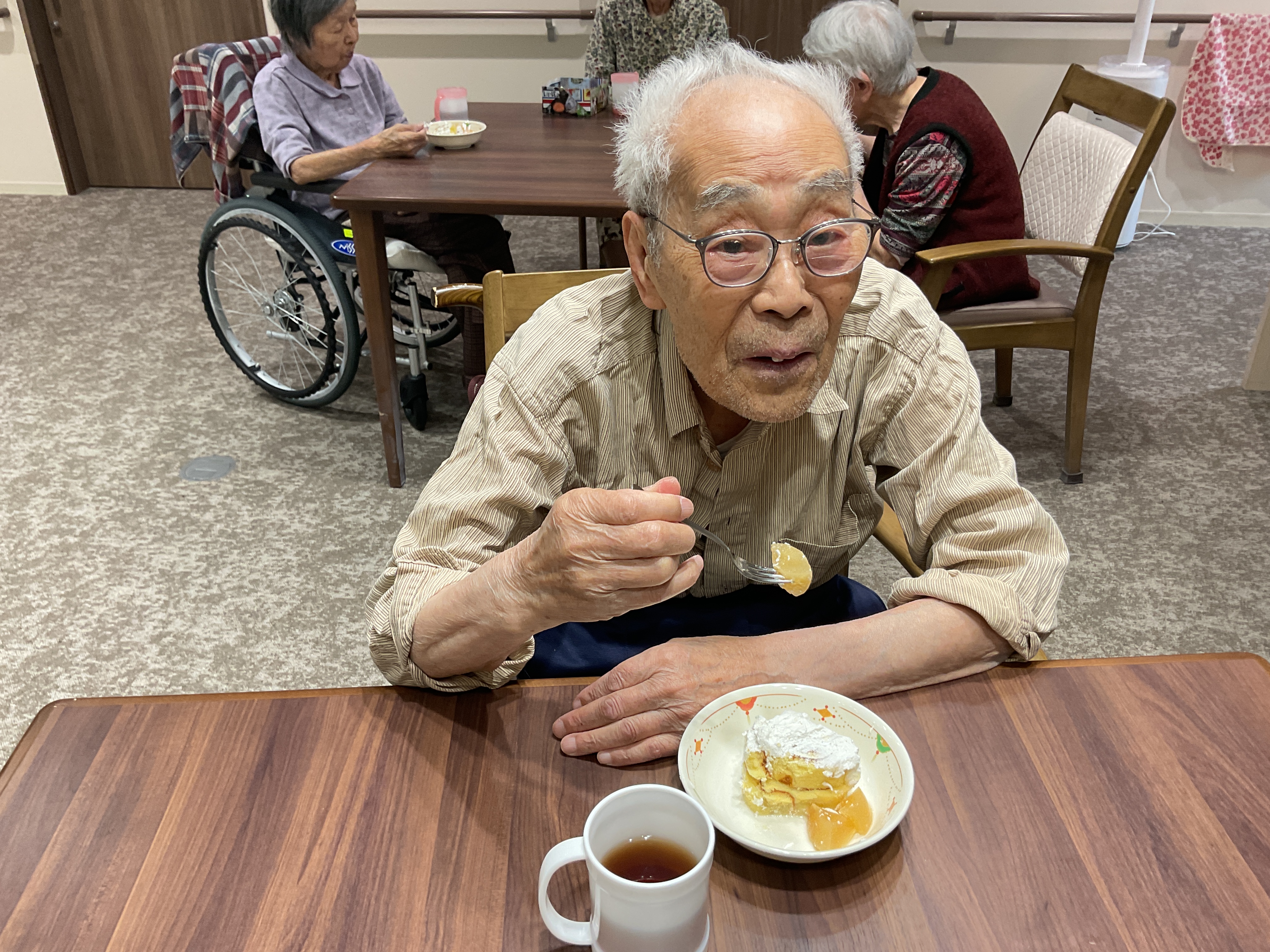 この日誕生日の方の誕生日会を開催いたしました。スタッフが手作りしたケーキを召し上がっていただきました。