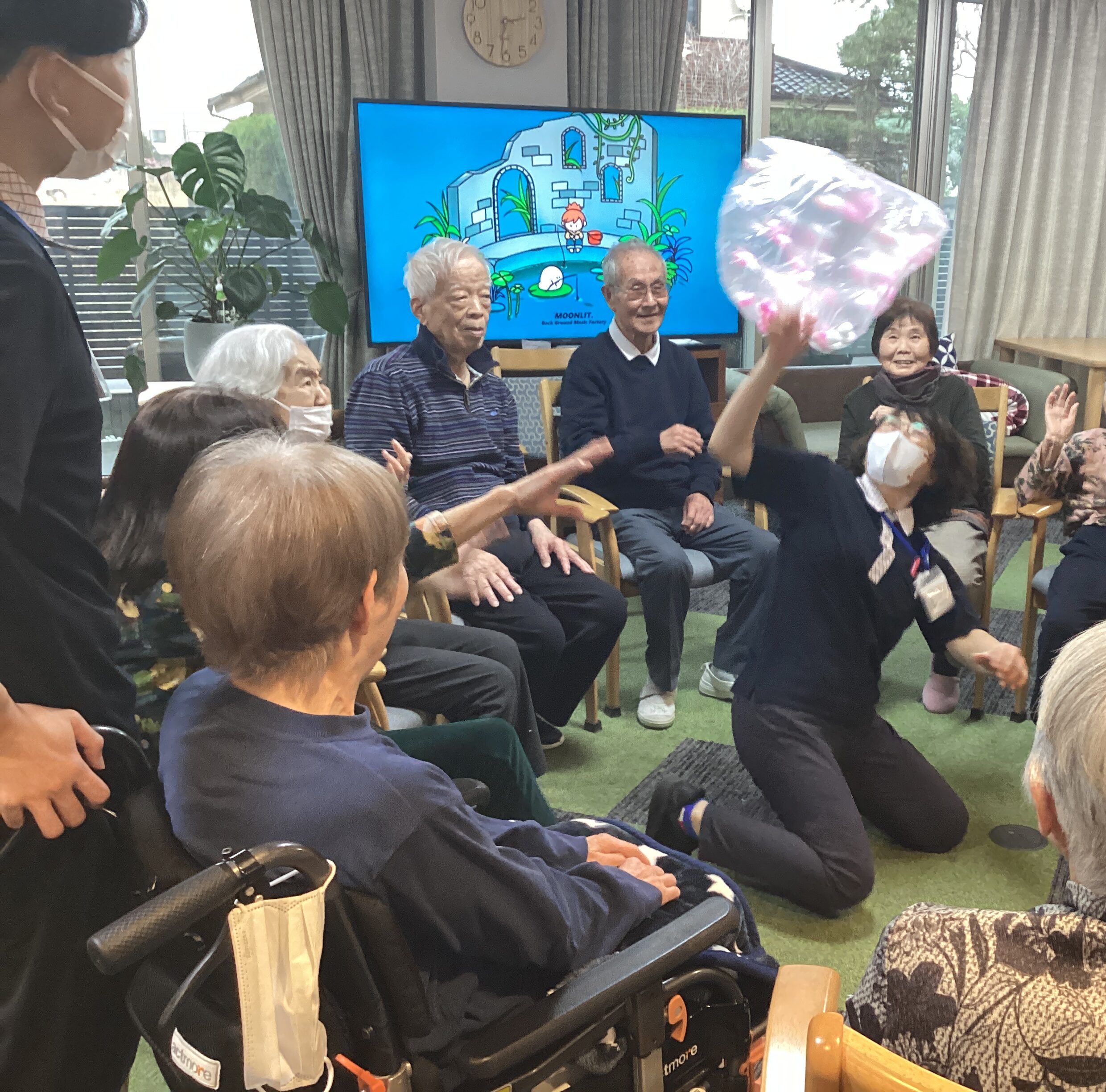 45ℓゴミ袋にハートのふわふわを入れたオモシロ風船を皆さんの前で作りました♪ ポンポンとよく弾む楽しい風船でバレーボールをしました(⌒∇⌒)