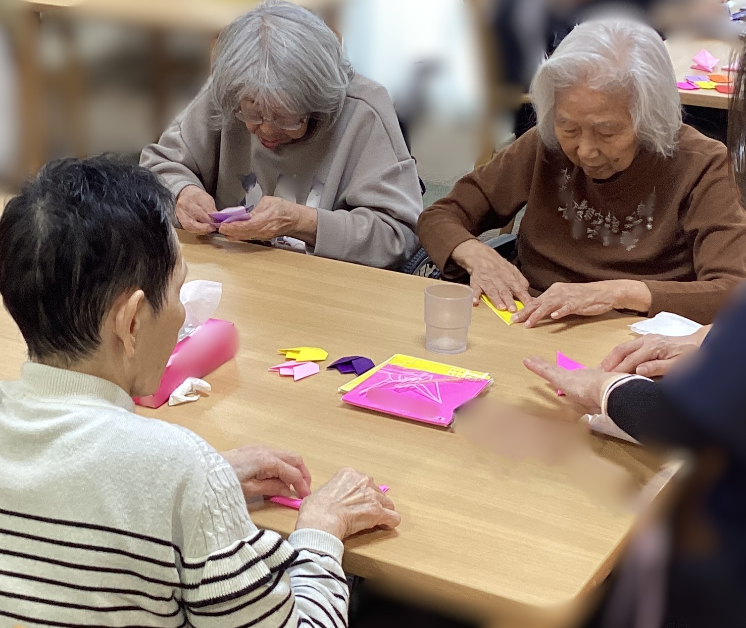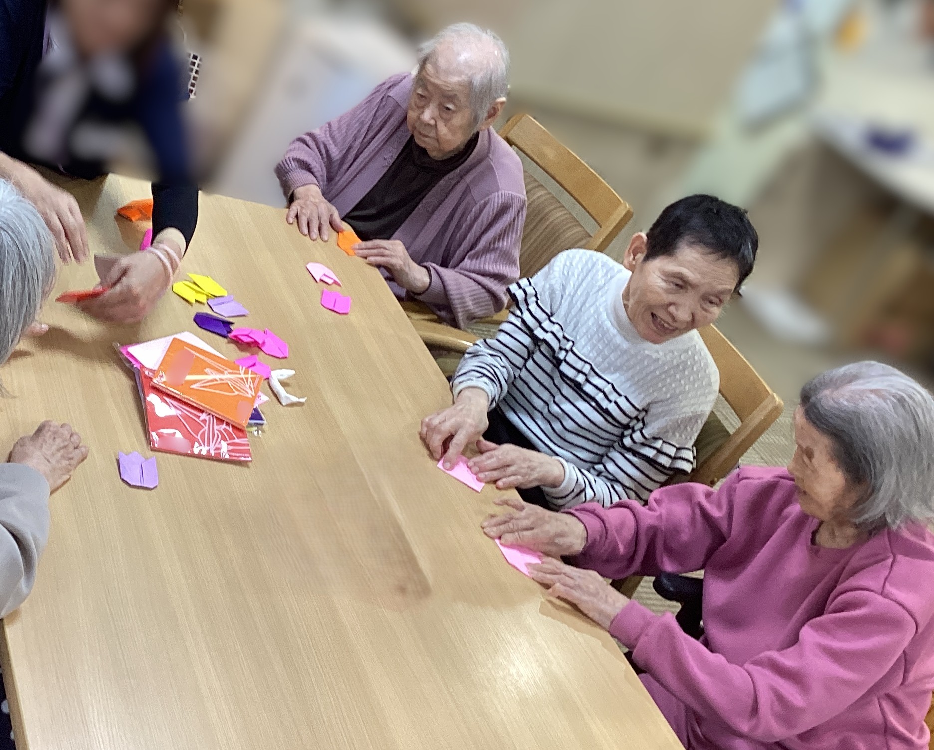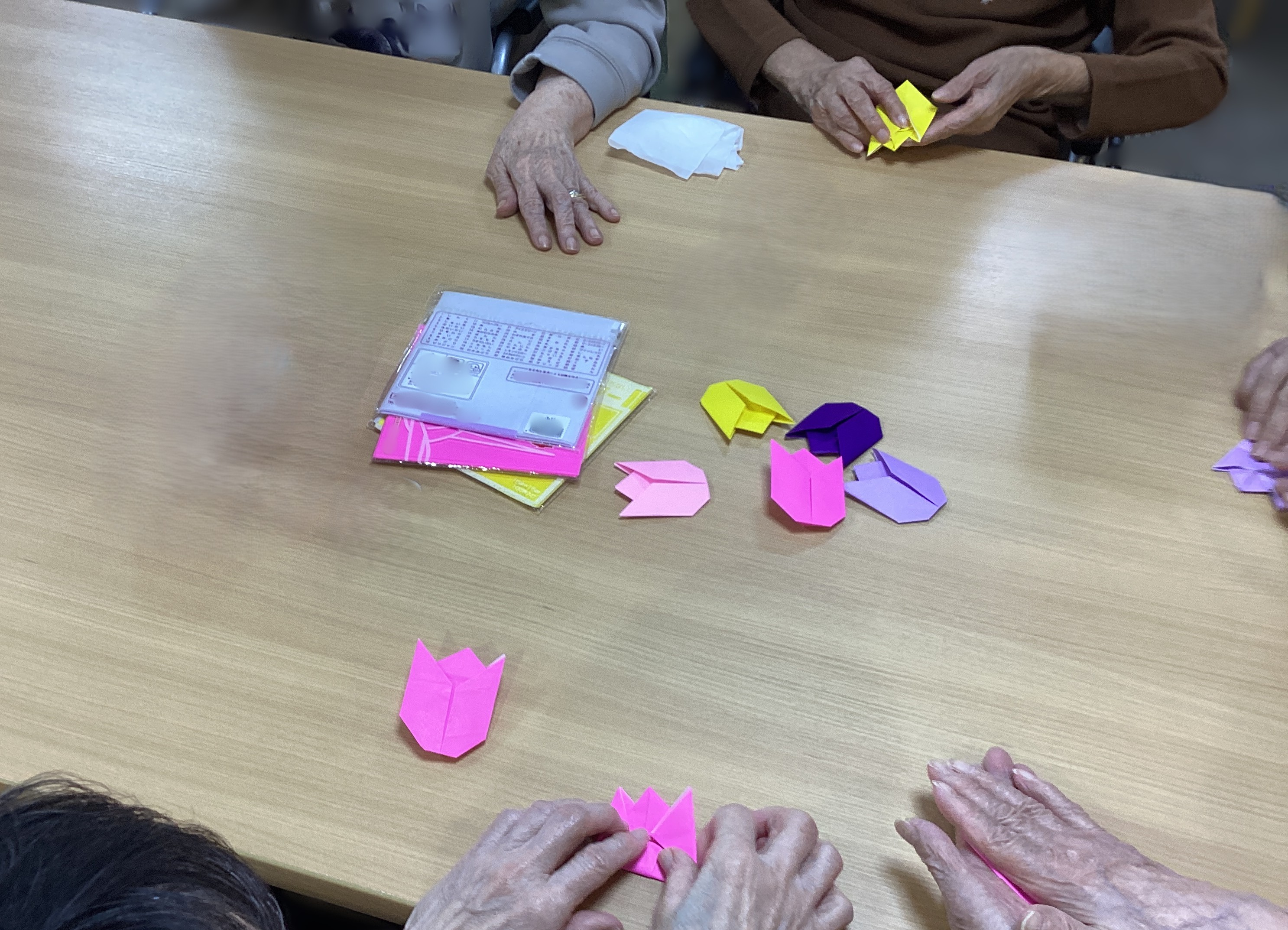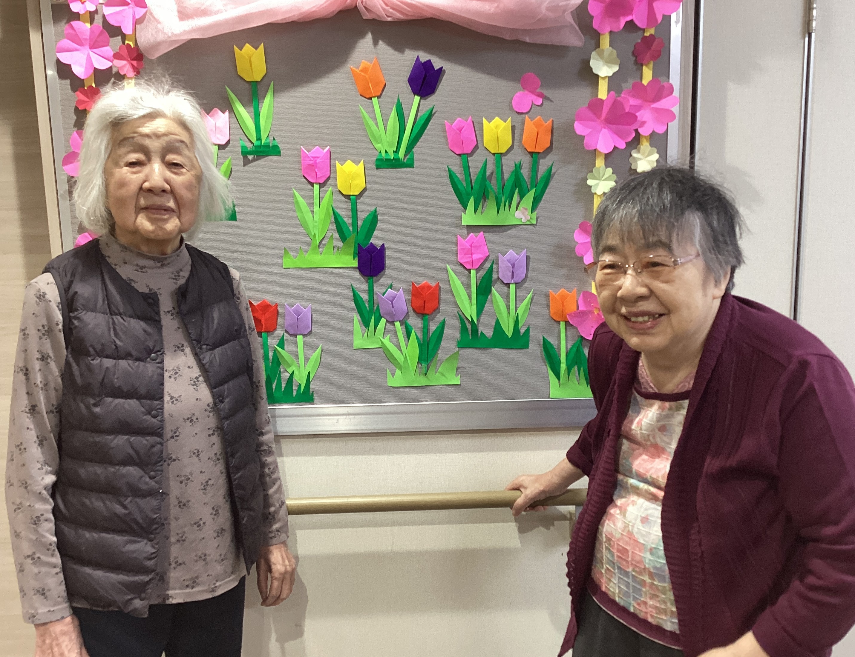 🌷4月に向けて掲示板は🌷チューリップ🌷をテーマに作成致しました。手先が器用な方もそうでない方も、仲良く教え合いながら慎重に折り紙を折り、手作り🌷チューリップを皆様で完成させました💮完成した掲示板の前でにっこり笑顔です😊