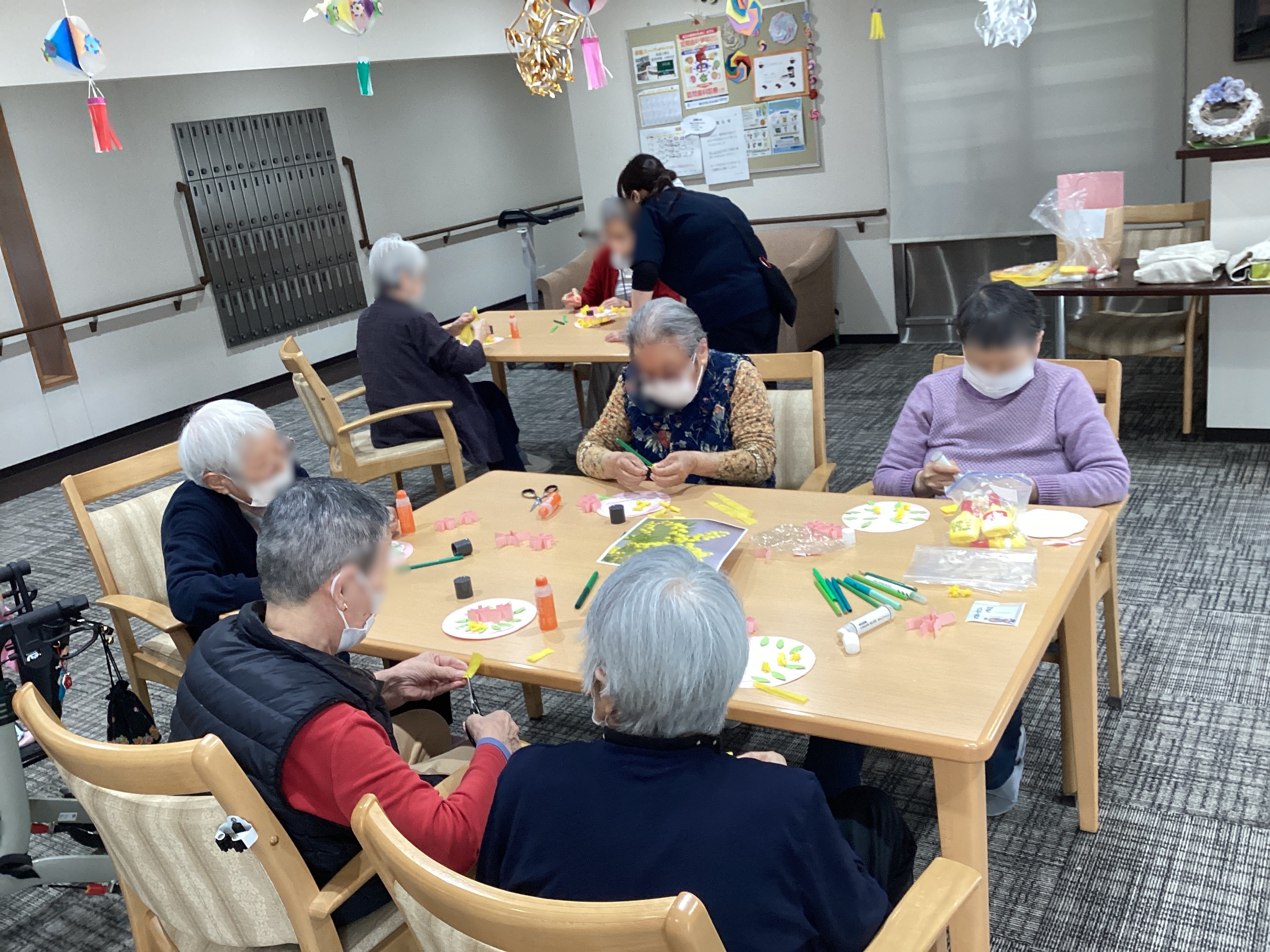 今週のレクリエーションでは、ミモザブーケ作りを行いました。 春を感じる黄色いミモザに、皆様きれいだだねと笑顔で取り組まれ、素敵なブーケが完成しました。
