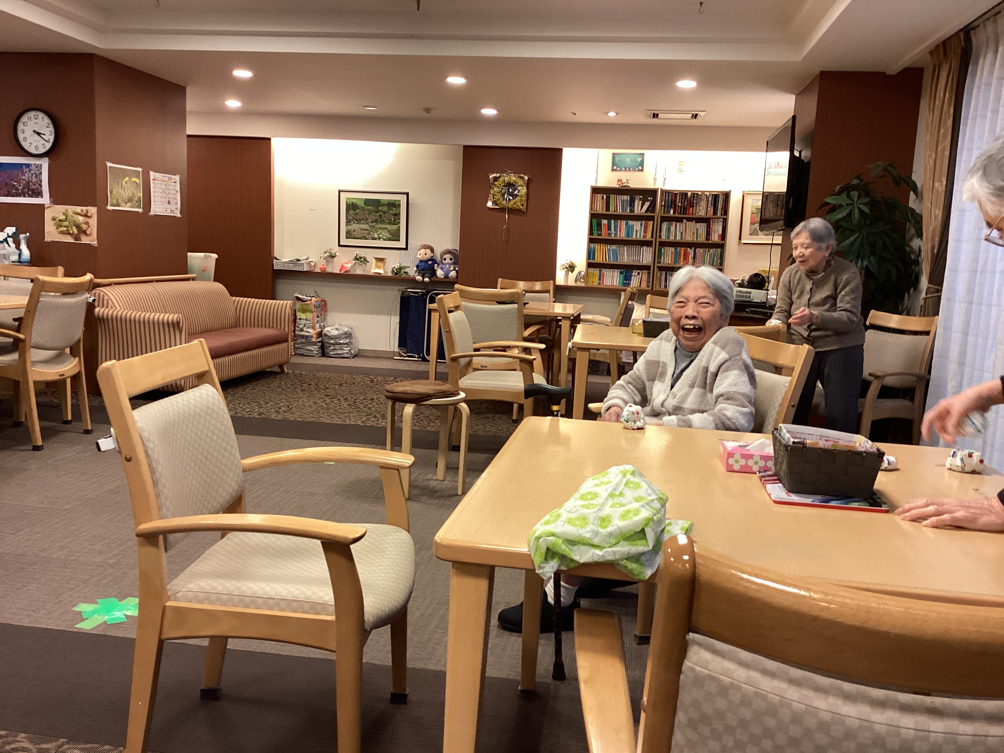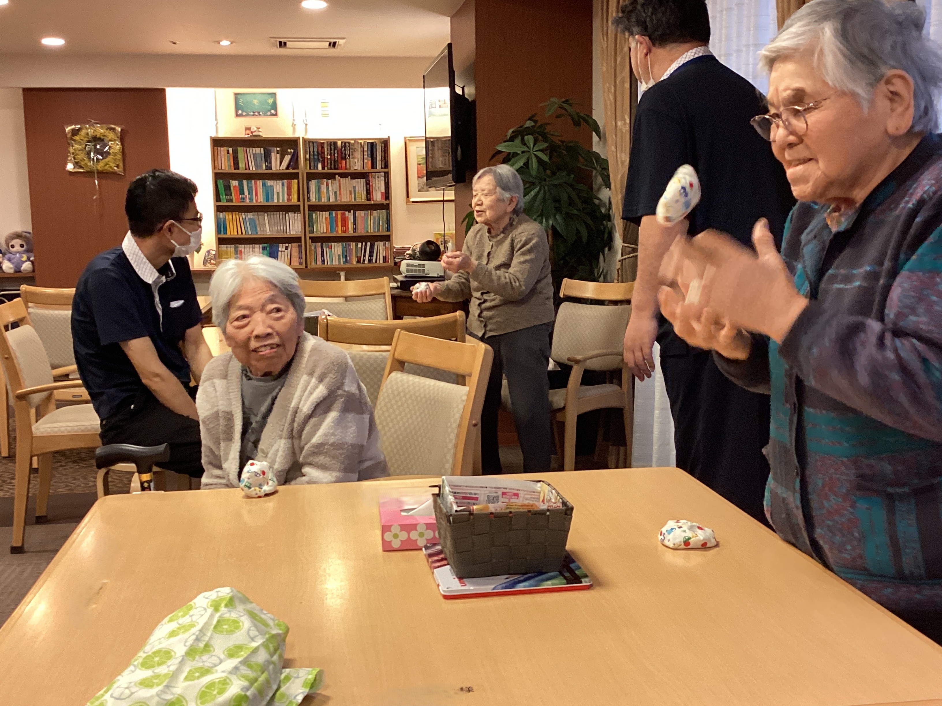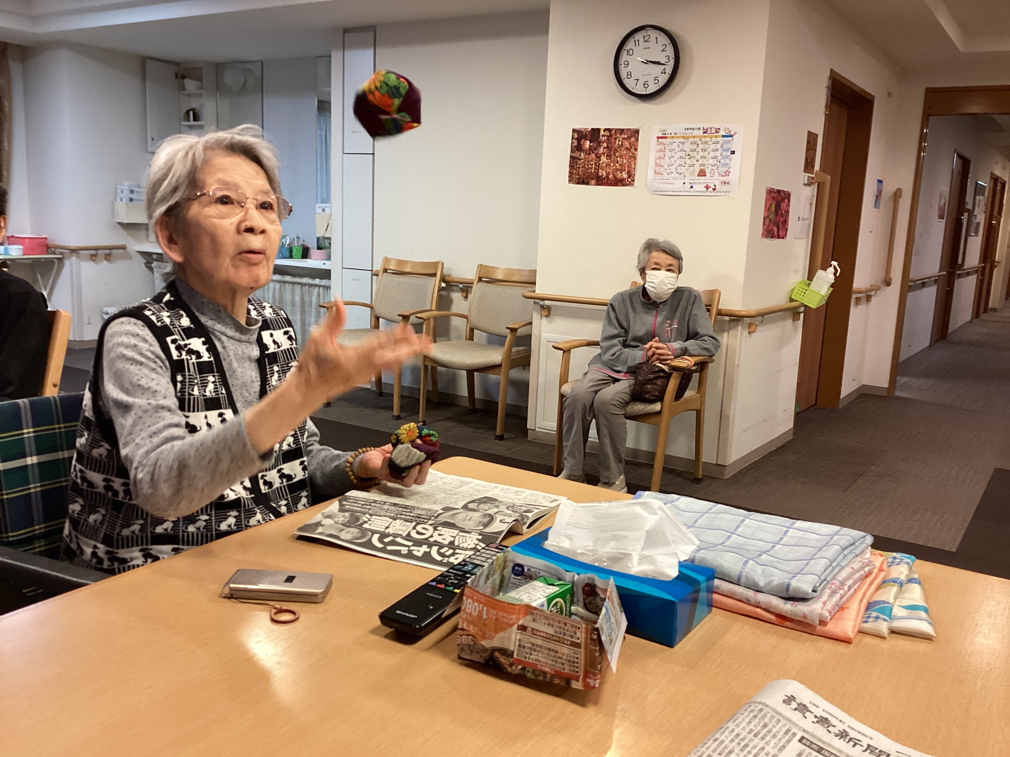本日はあいにくの天気なので時間を持て余していましたが、お手玉を渡すと皆さんすぐに手に取り「昔は3つで出来たのに~」と楽しそうに何度も何度も挑戦されていました!童心に還ると皆さんの目が輝いていました!
