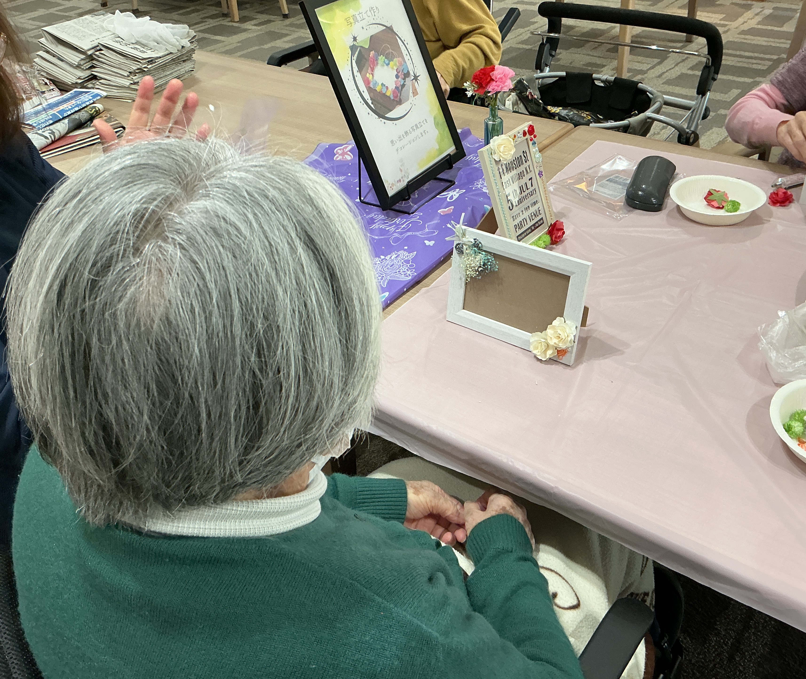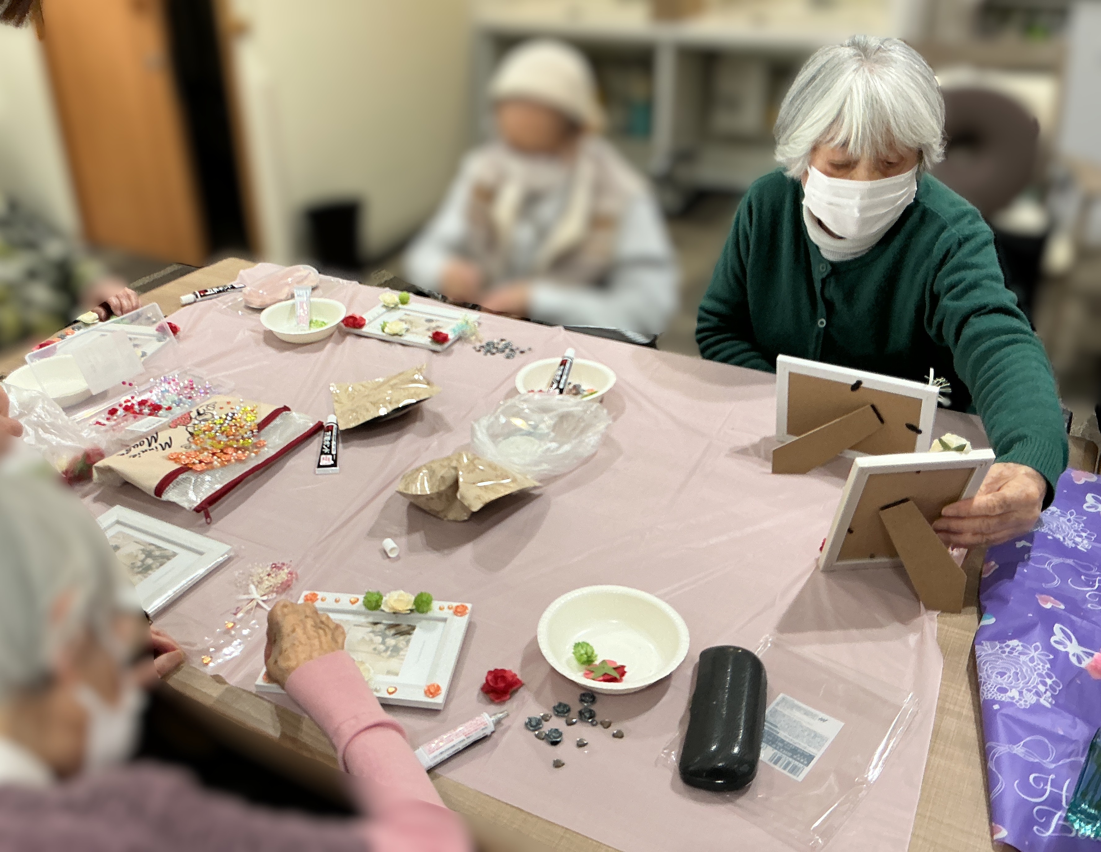 美容レク第2弾!ケアスウィート様にお越しいただき、今回は写真のフレーム作りを実施しました!花やビーズで色鮮やかに飾りつけ、とても綺麗に仕上がりました🌺出来上がった作品をみて、皆様大変喜ばれておりました😊